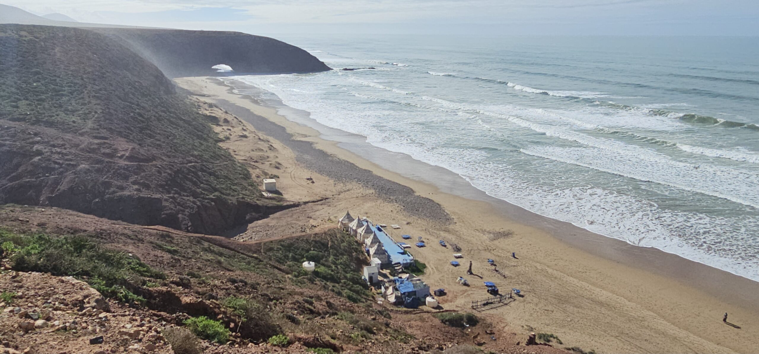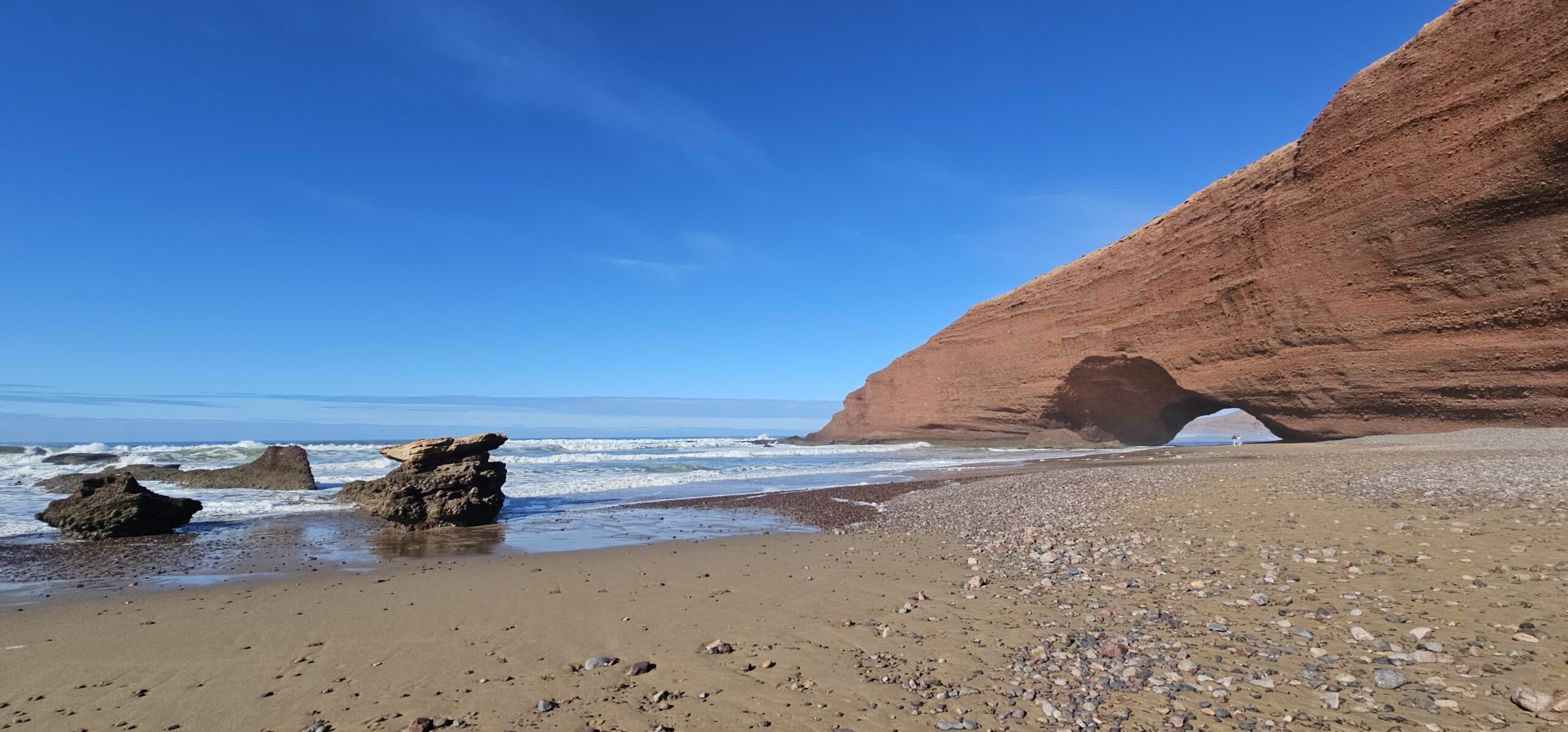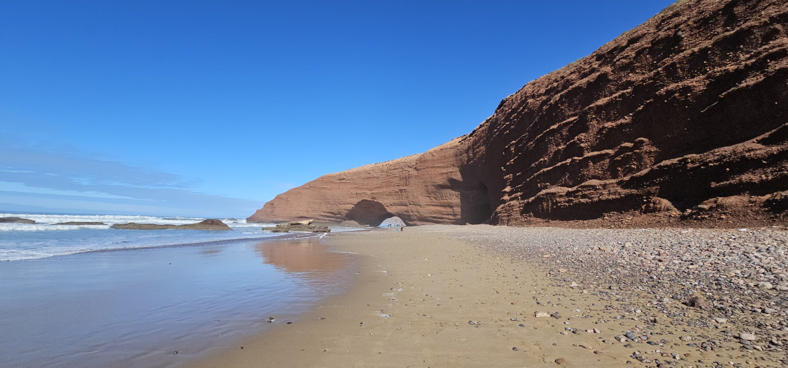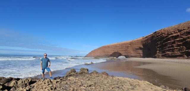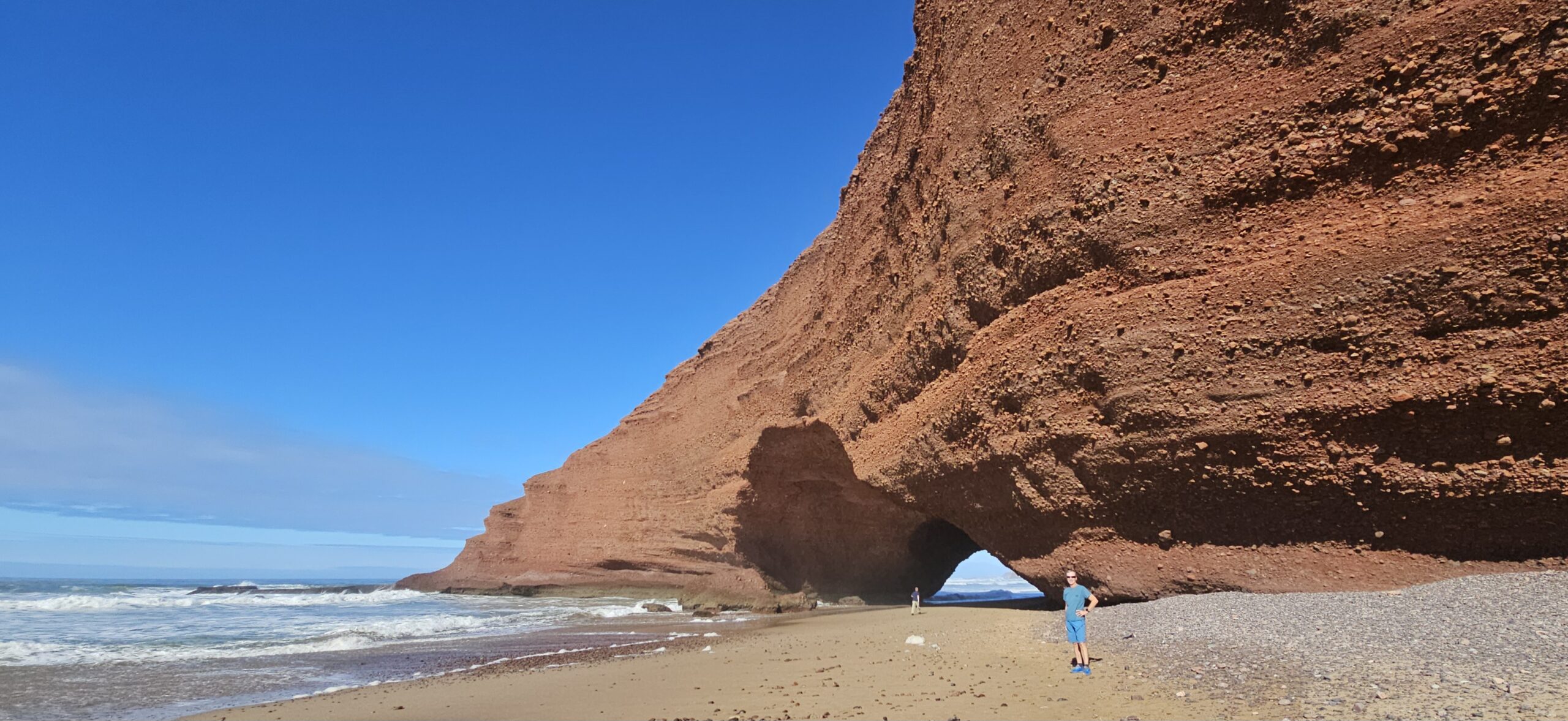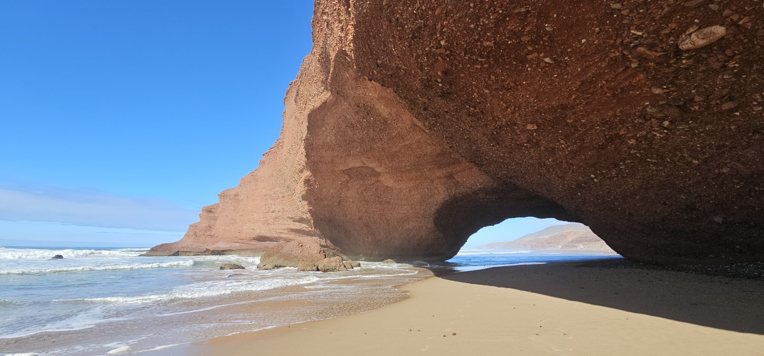 Ich lese dies und das, ein paar Small Talks mit meinen Freunden und um ca. 14:30 Uhr trete ich in die Pedale. Zuerst zum Bankomaten um genügend Bargeld für die nächste Zeit zu haben. Dann bezahle ich den Campingplatz und bike nochmals Richtung Felsentor Legzira. Von davor fahre ich zur Klippe hinunter wo auch ein paar Womos frei stehen. Dort hat es noch ein weiteres Felsentor, das Dritte ist vor ca. 10 Jahren eingestürzt.