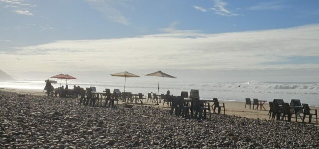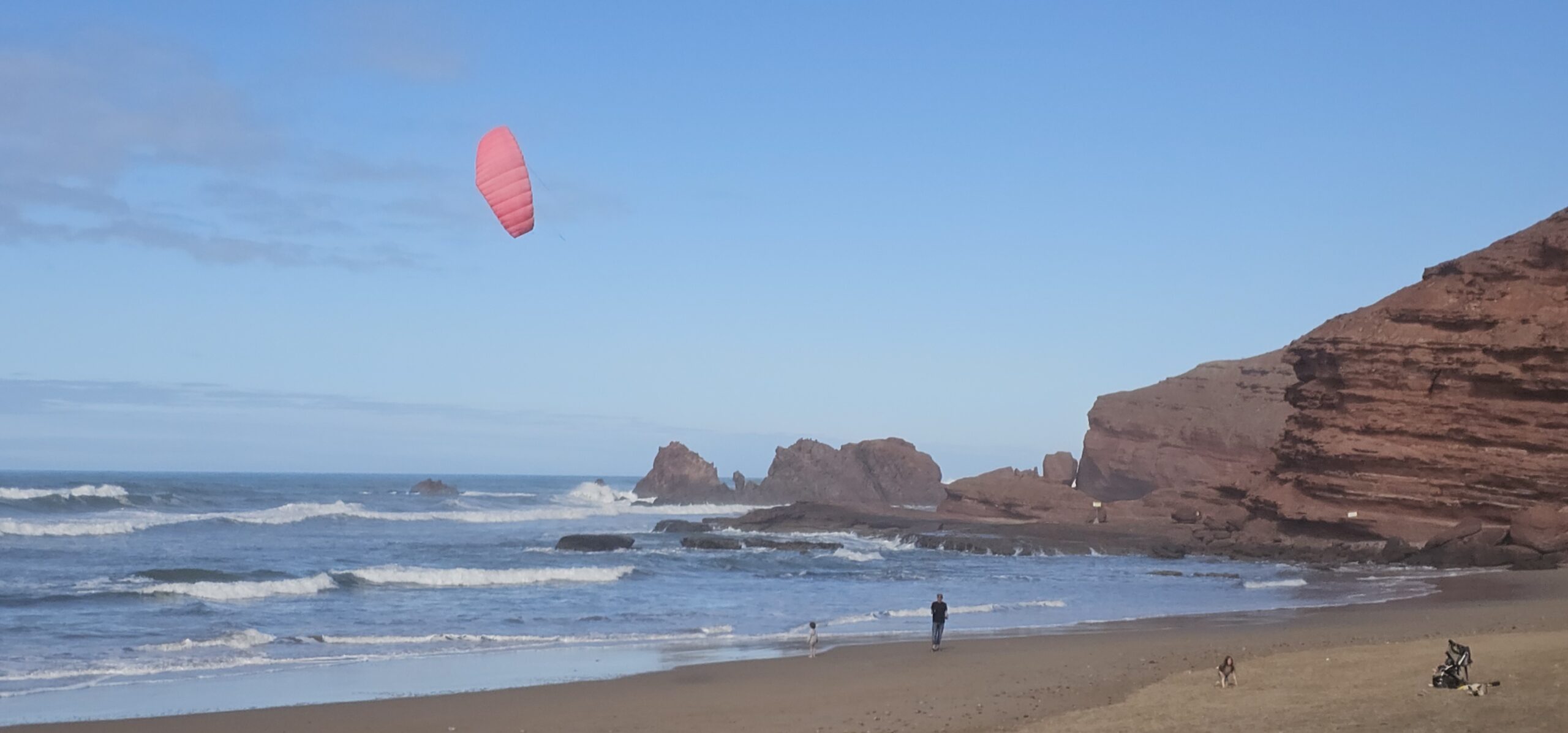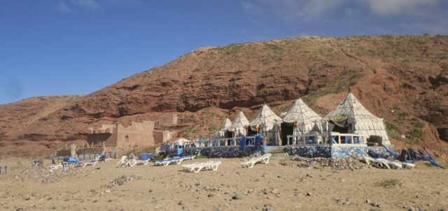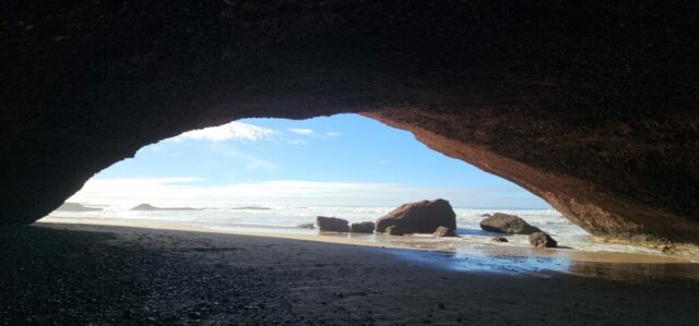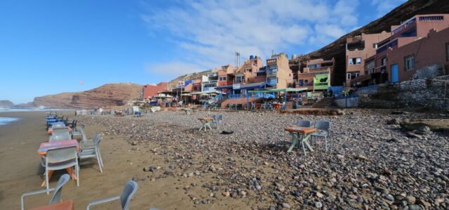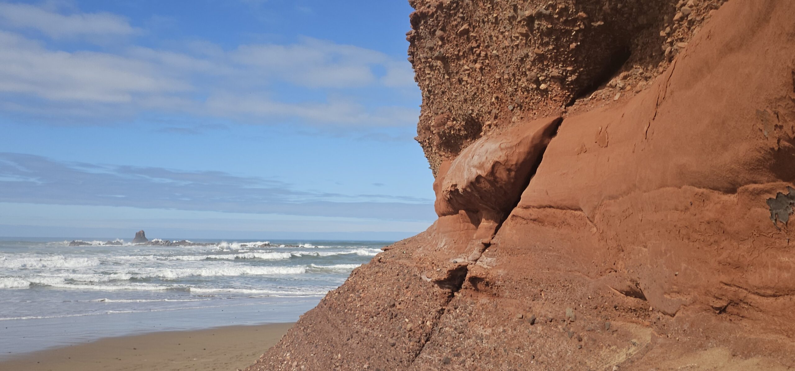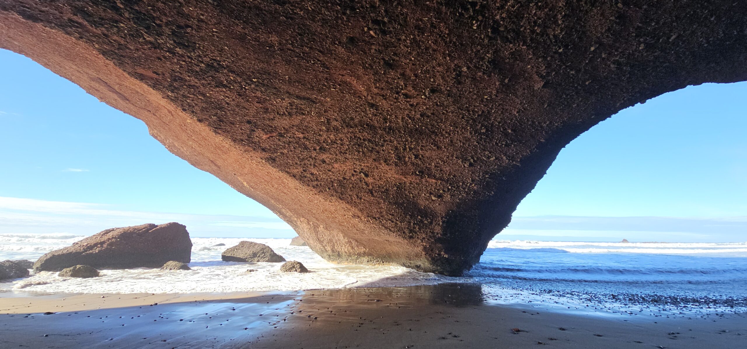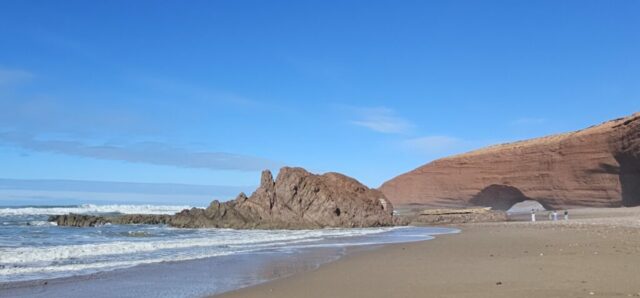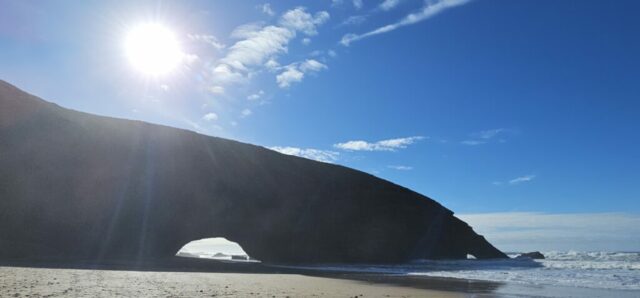 Ich lese dies und das, ein paar Small Talks mit meinen Freunden und um ca. 14:30 Uhr trete ich in die Pedale. Zuerst zum Bankomaten um genügend Bargeld für die nächste Zeit zu haben. Dann bezahle ich den Campingplatz und bike nochmals Richtung Felsentor Legzira. Von davor fahre ich zur Klippe hinunter wo auch ein paar Womos frei stehen. Dort hat es noch ein weiteres Felsentor, das Dritte ist vor ca. 10 Jahren eingestürzt.