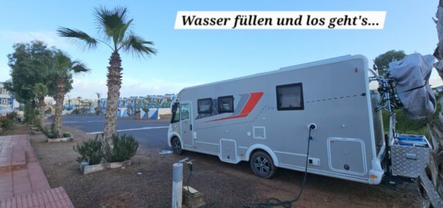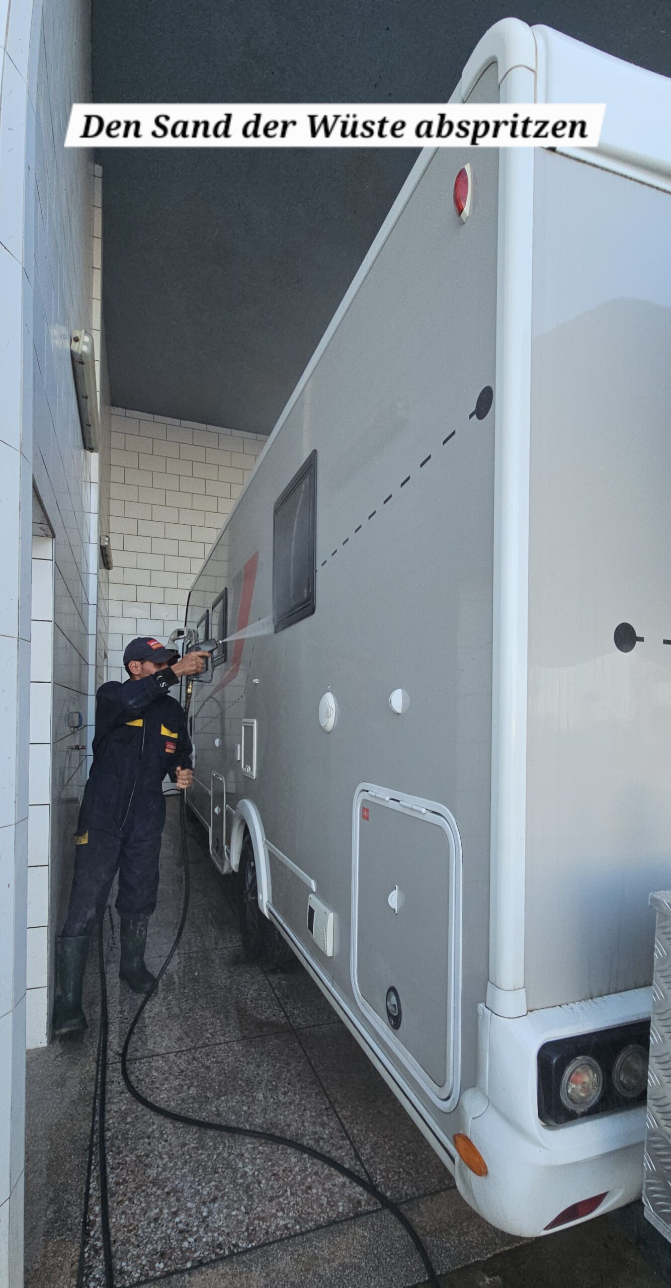 Beim raus fahren nochmals Frischwasser auffüllen und dann zur Tankstelle wo ich auch Diesel tanke und das Womo waschen lasse (€ 7,50). Der Staub der Wüste muss endlich runter damit es wieder sauber da steht.