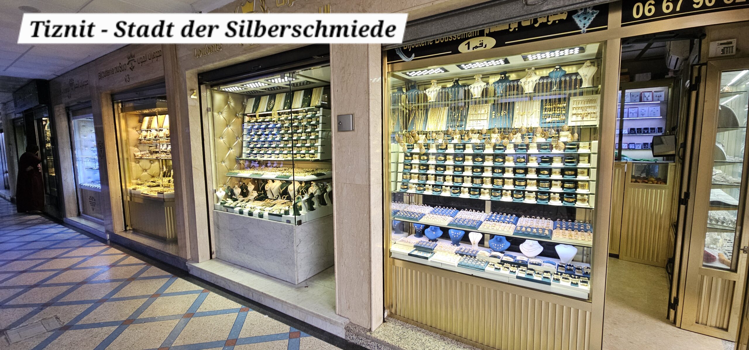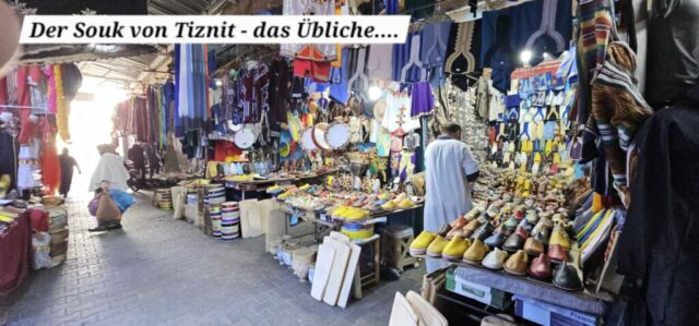 Danach fahre ich nach der schönen Küstenstraße entlang nach Mirleft. Hier gibt es nicht viel zu sehen und ich setzt die Fahrt Richtung Norden fort. Auch in Plage Aglou habe ich nicht das Gefühl, hier eine Nacht verbringen zu wollen, was ich eigentlich angedacht hatte. Also weiter nach Tiznit, der Stadt der Silberschmiede. Ich parke direkt neben der historischen Stadtmauer und schlendere dann durch den Souk. Abgesehen von den vielen Läden mit Silberschmuck, welcher überwiegend im orientalischem Design ist, gibt es hier das Übliche wie auch in den anderen Souks. Es sprechen mich einige Shopbesitzer an, teilweise in gutem Deutsch und unaufdringlich, was ganz nett ist. Aber auch hier habe ich es bald gesehen und ich gehe zurück zum Auto. Auch hier war eine Nacht geplant, aber ich frage mich warum und wozu. Es ist vor 14 Uhr und so setze ich die Fahrt nach Tafraout in die Berge fort, wo ich dann sicher zumindest ein paar Tage bleiben werde.