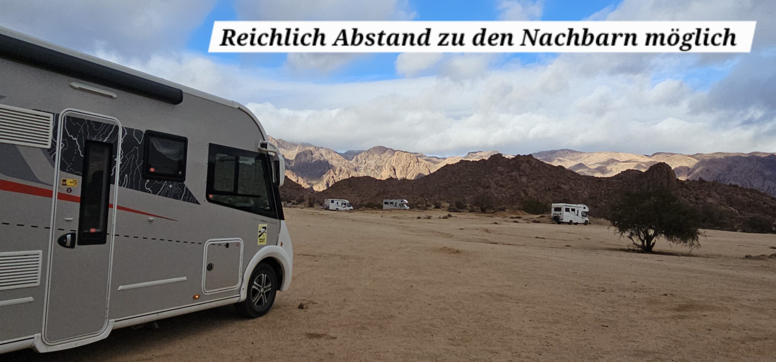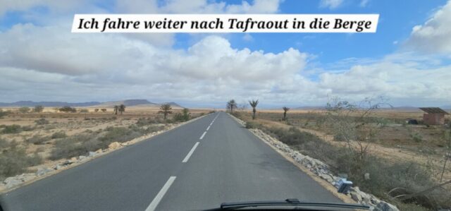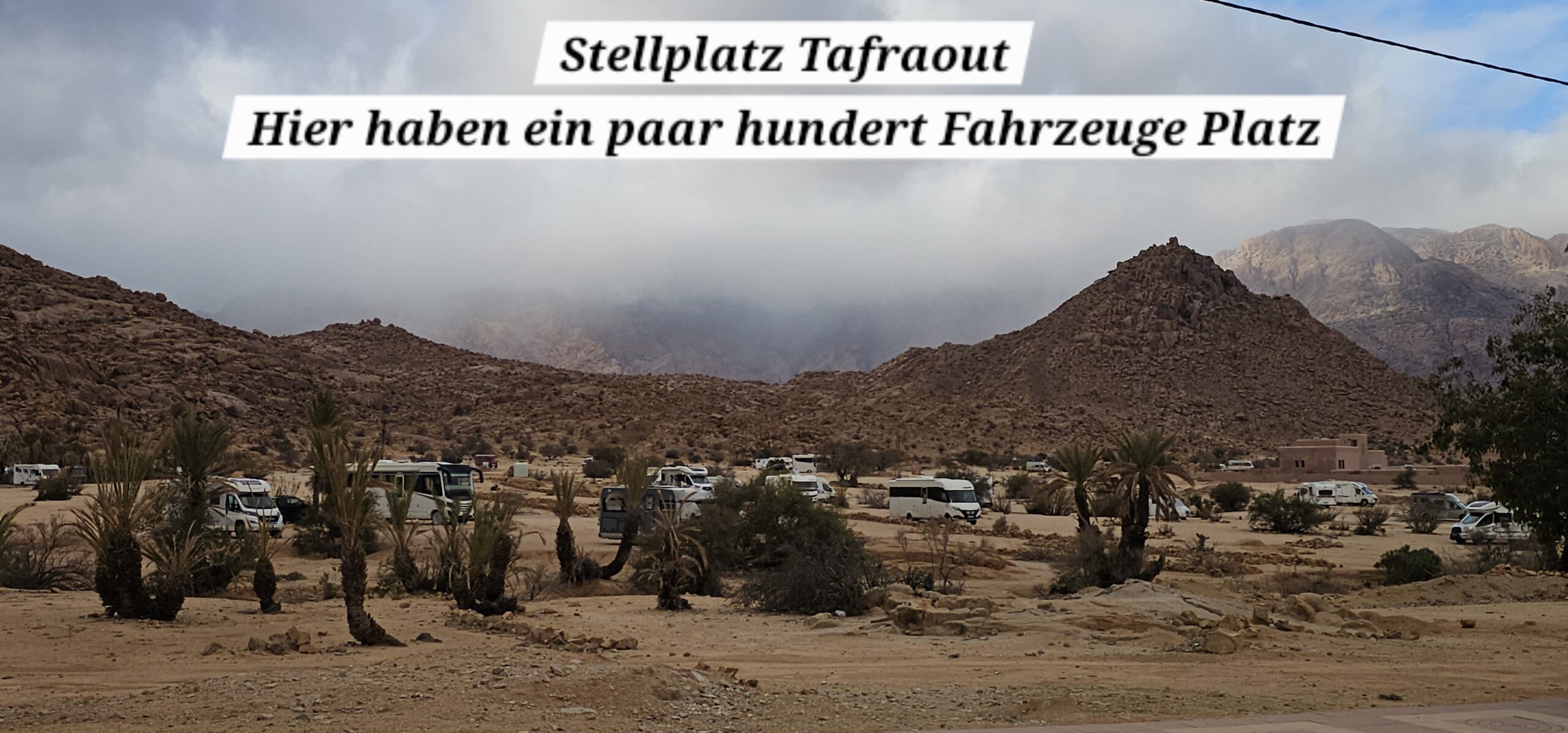Bald hört der Regen wieder auf und kurz nach 16 Uhr komme ich am riesengroßen Stellplatz in Tafraout an. Es hätten mehrere hundert Womos Platz, ist aber nicht sehr belegt. Ich suche mir ein schönes Plätzchen, wo ich auch davon ausgehen kann, dass mir der für morgen angesagte Regen nichts anhaben kann.