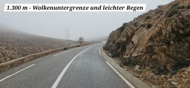 Die Straße wird bald kurvig und steigt stetig an. Um 15 Uhr komme ich auf der Passhöhe in 1.300 Metern an und es beginnt leicht zu regnen. Die Wolkenuntergrenze liegt in dieser Höhe. Dann geht es kurvig weiter und es ist recht frisch geworden.