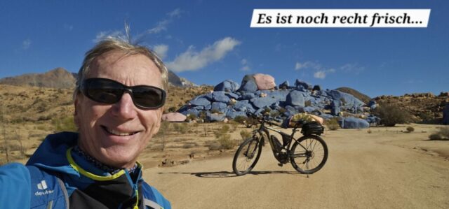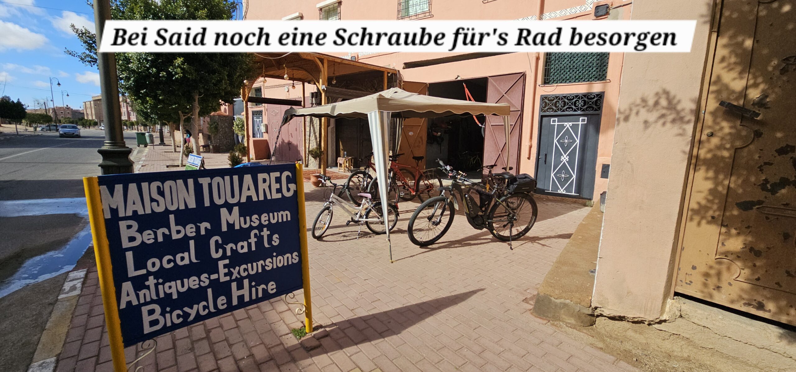 Frisch isch…., der Tag beginnt sehr kalt. ABER – die Sonne scheint wieder und die Restwolken verschwinden zusehends. Um die Mittagszeit fahre ich zuerst zu Said, welcher unter Anderem auch Räder vermietet um mir eine fehlende Schraube für mein Fahrrad zu besorgen.