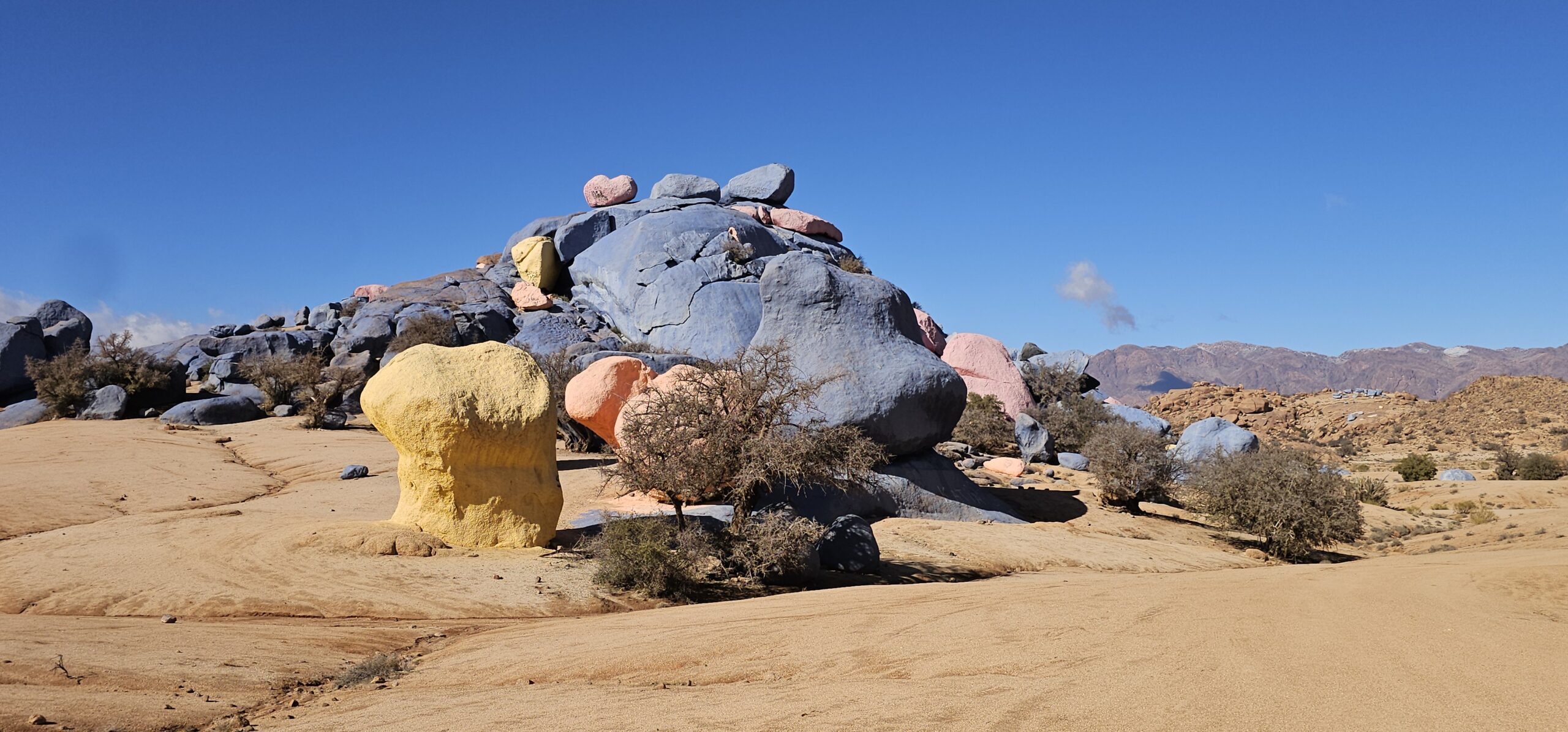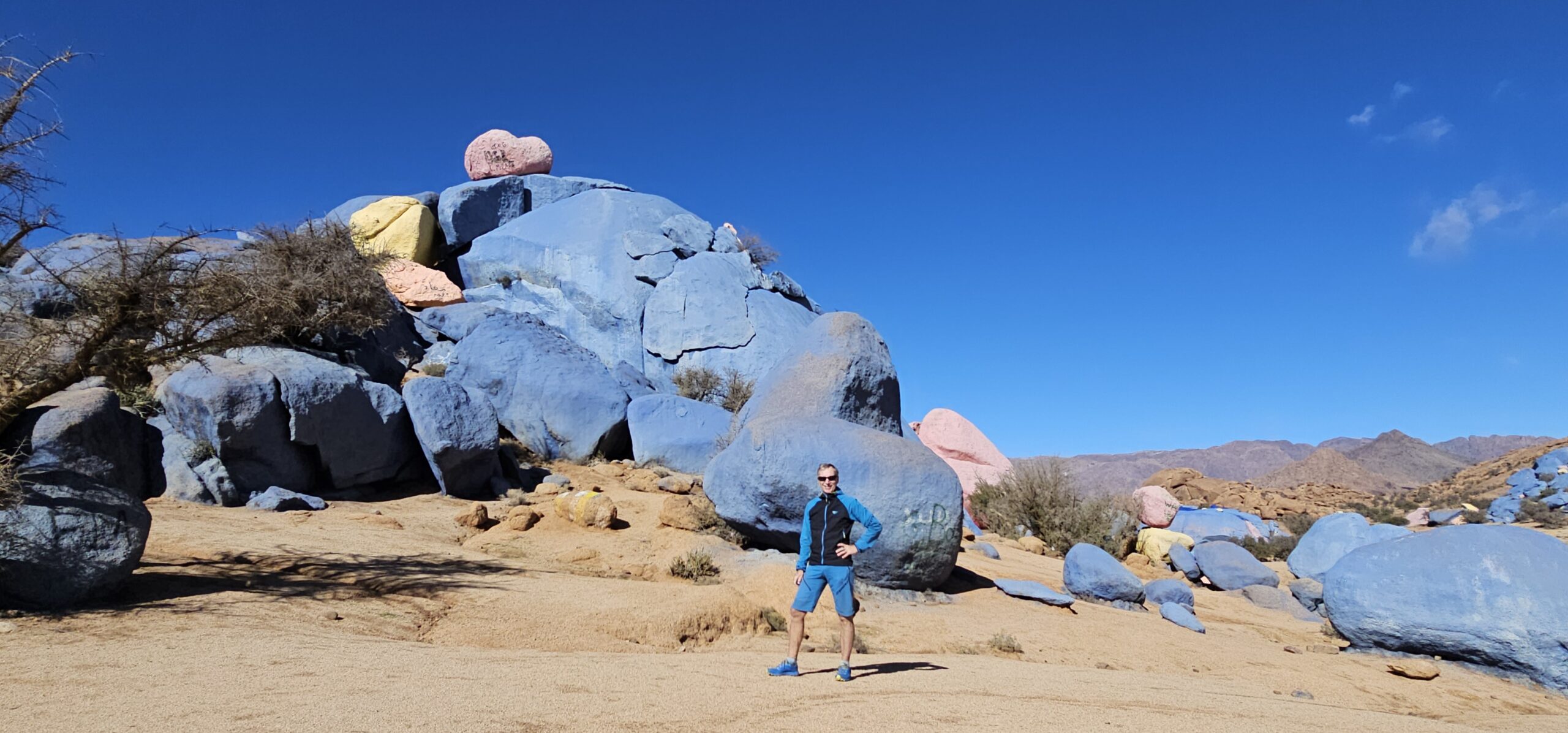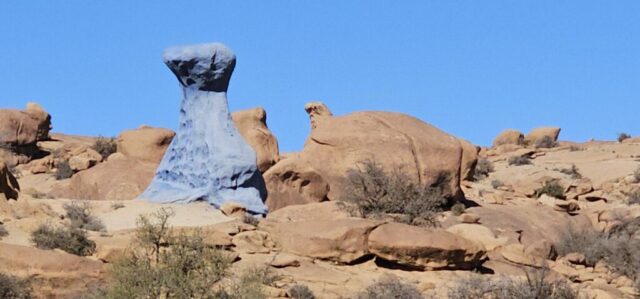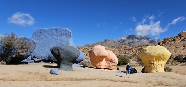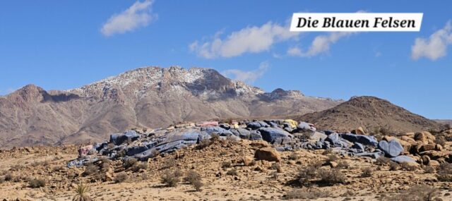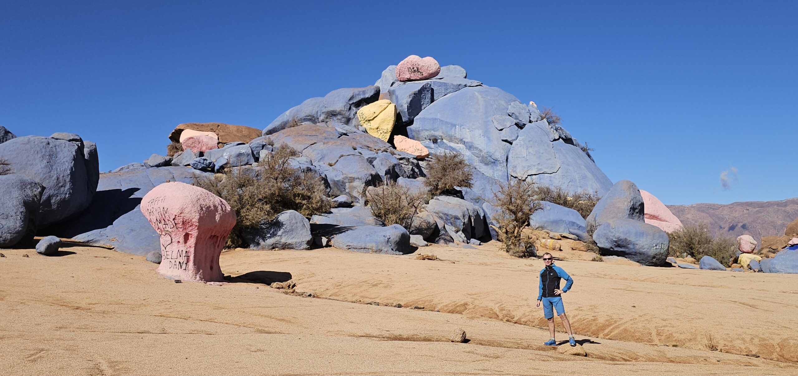 Dann komme ich bei den „Painted Rocks“ oder „Blauen Felsen“ an, die ein belgischer Künstler in den 1980iger Jahren angemalt hat. Später haben dann Einheimische andere Granitblöcke auch mit anderen Farben bemalt. Mal was anderes…!