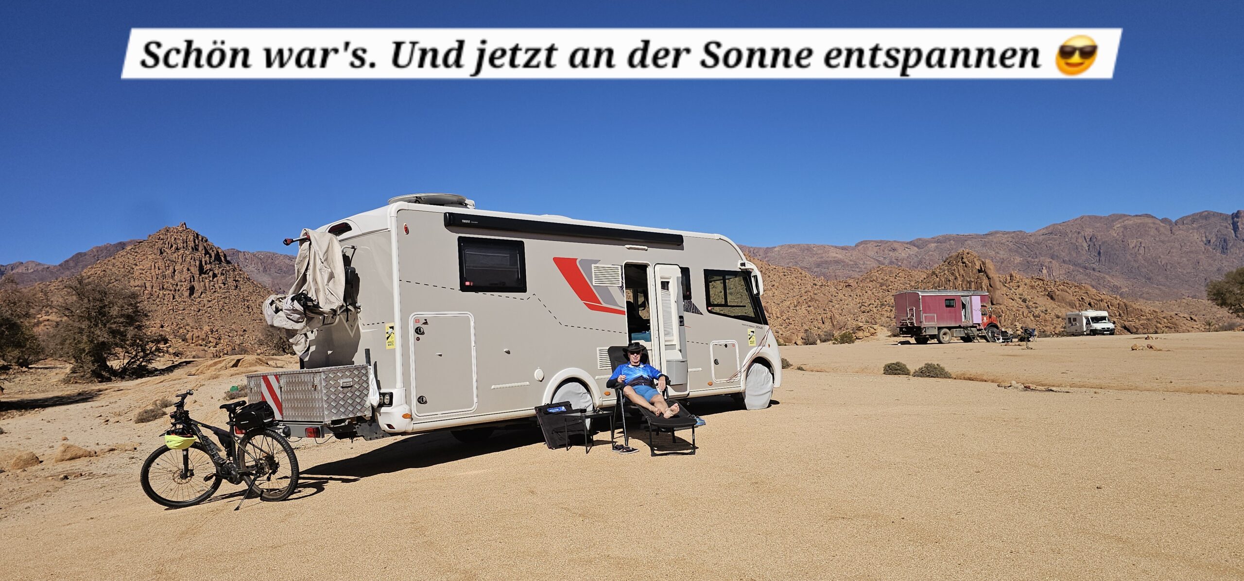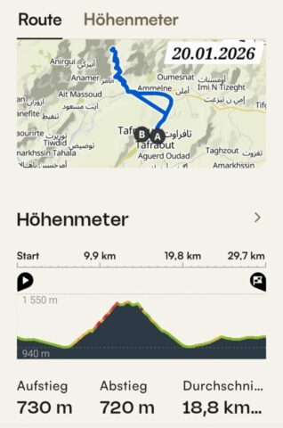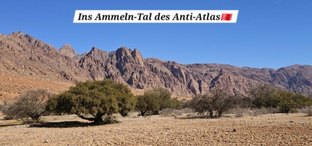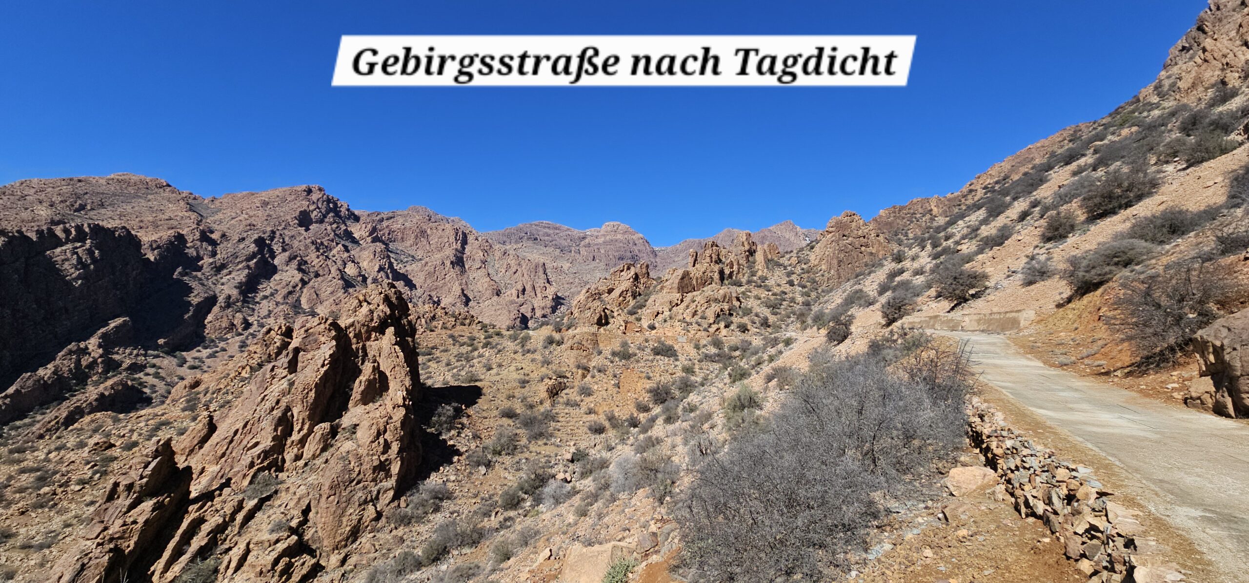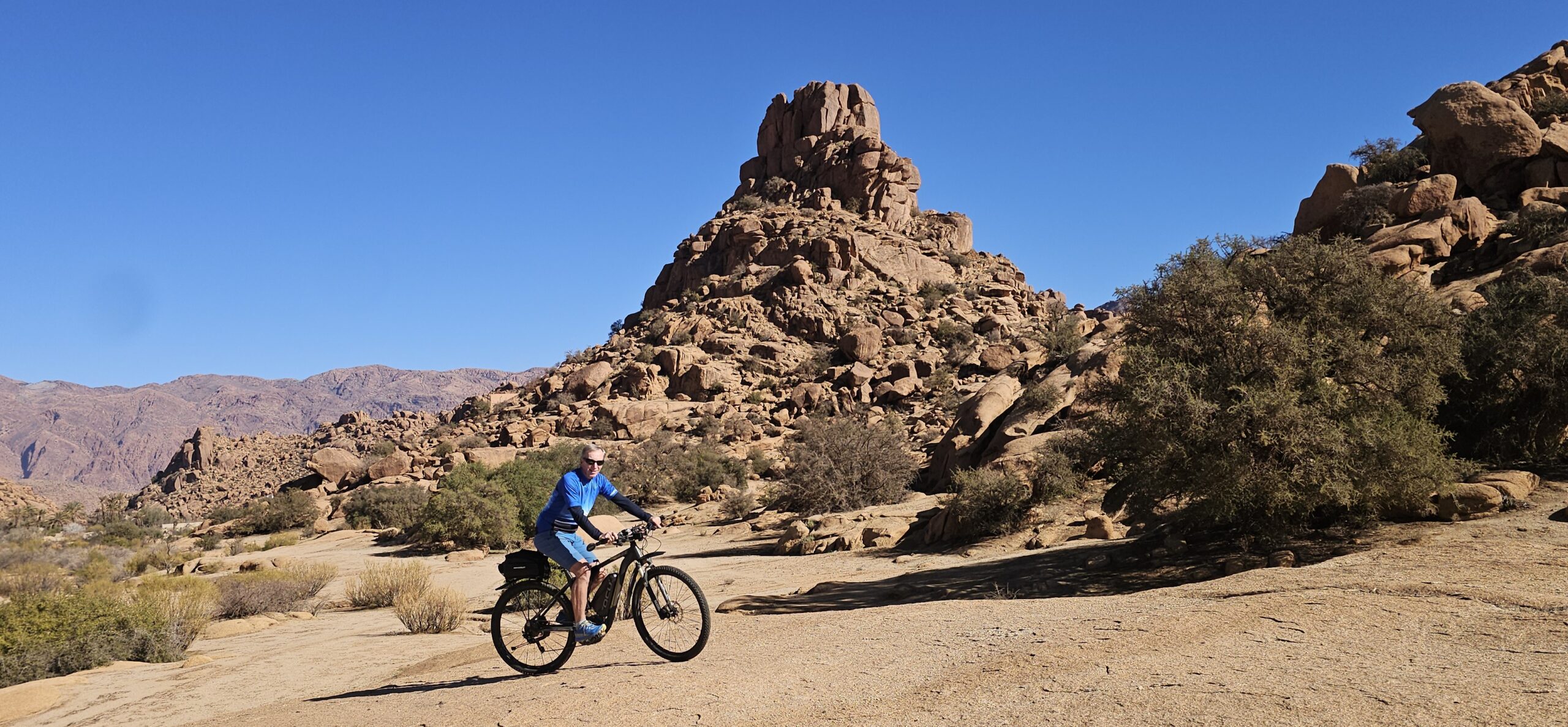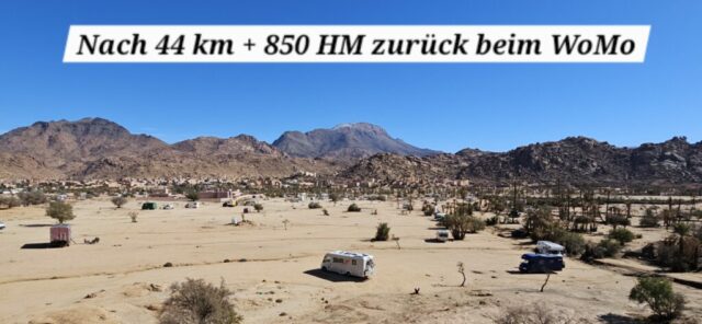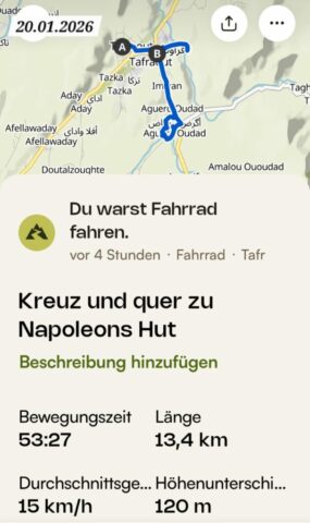 Dann rolle ich über die betonierte Straße wieder hinunter und anschließend strample hinauf nach Tafraout. Es ist angenehm warm und ich genieße vor dem Fahrzeug die herrliche Sonne.