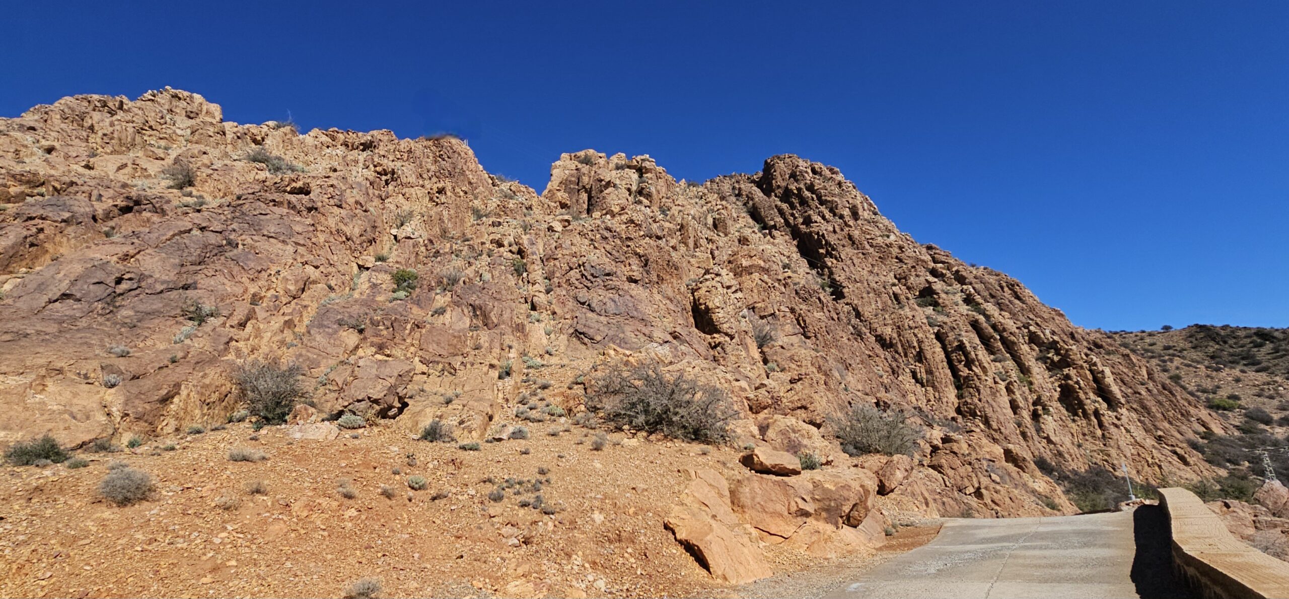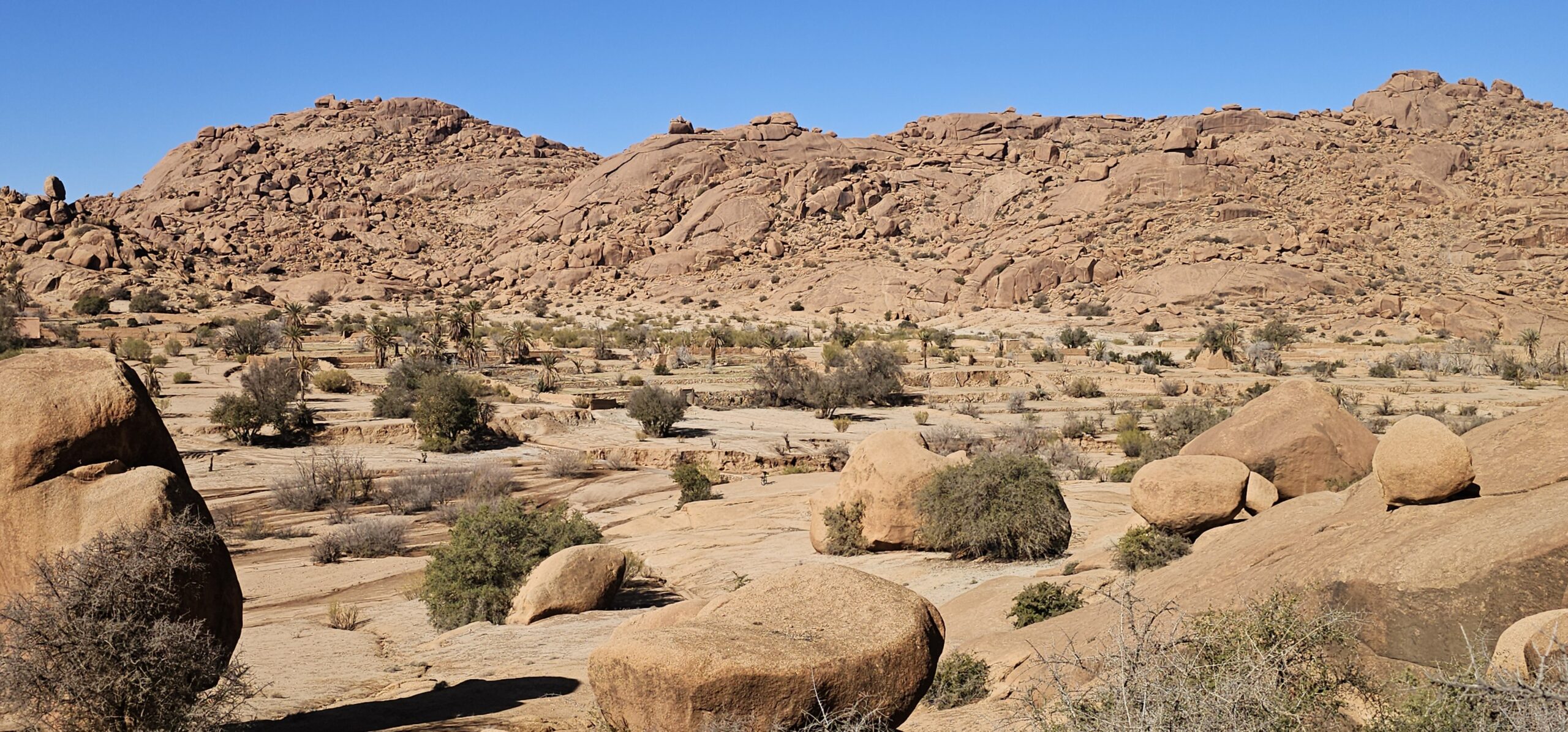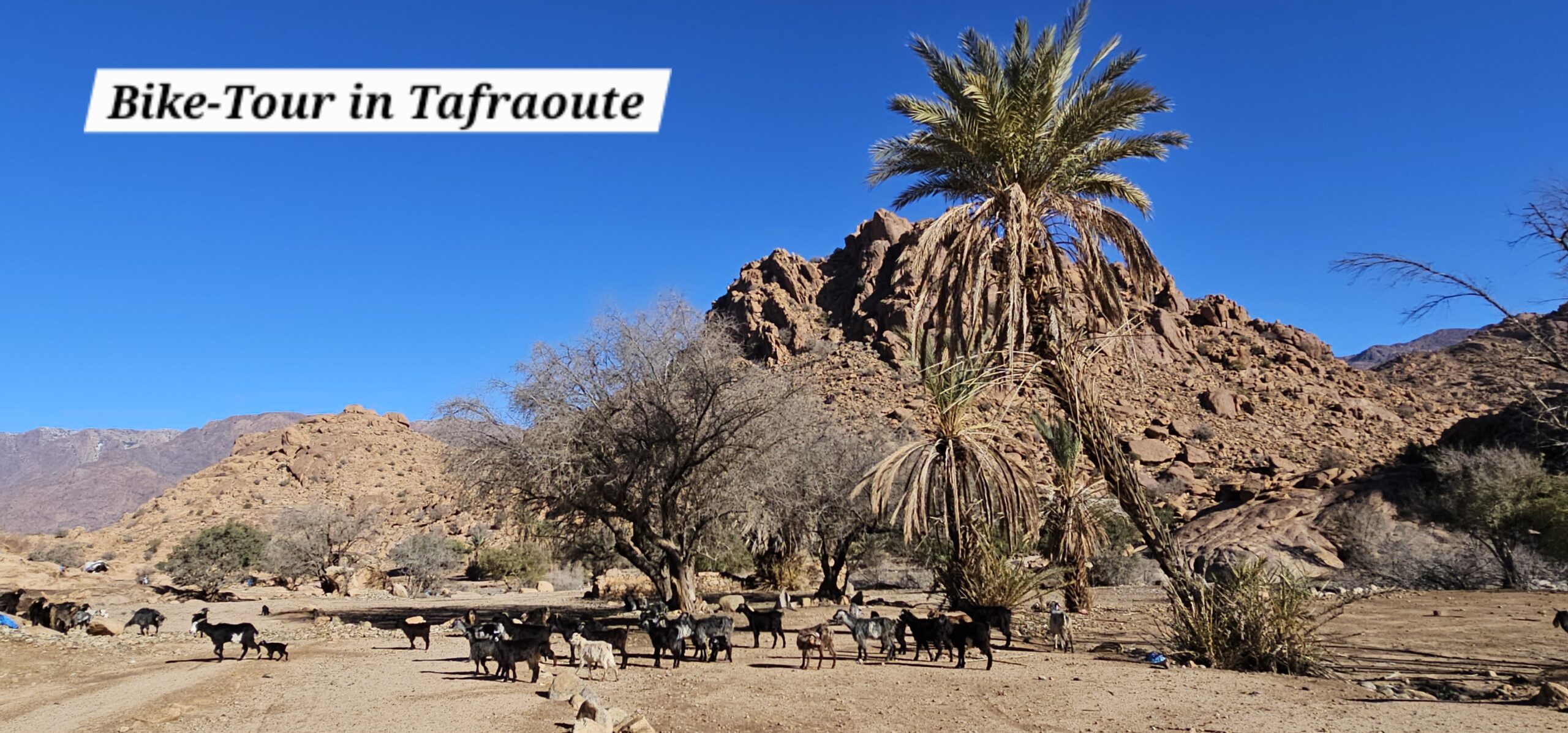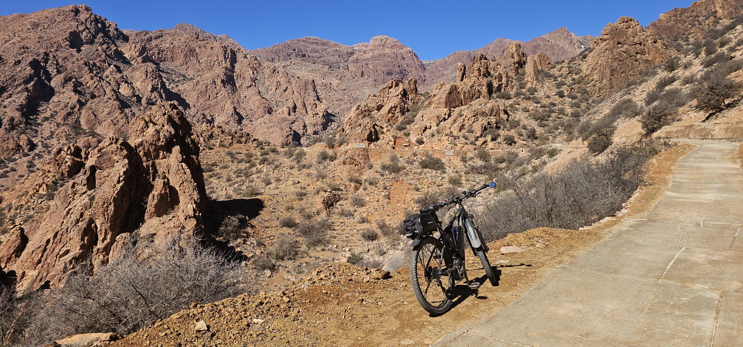 Dann rolle ich über die betonierte Straße wieder hinunter und anschließend strample hinauf nach Tafraout. Es ist angenehm warm und ich genieße vor dem Fahrzeug die herrliche Sonne.