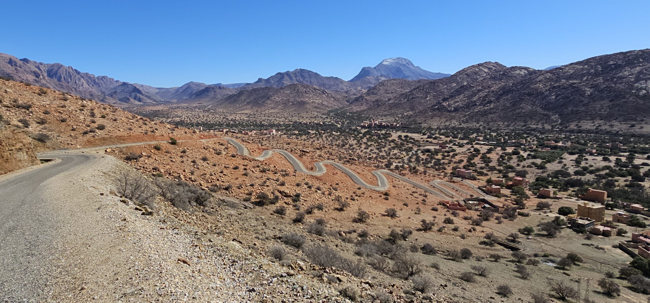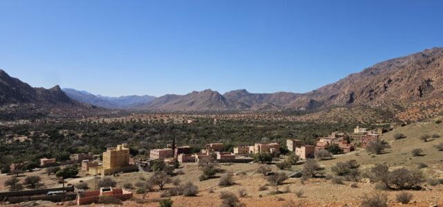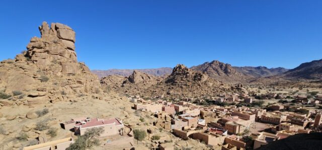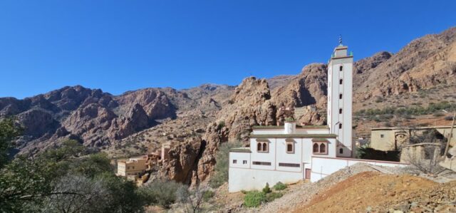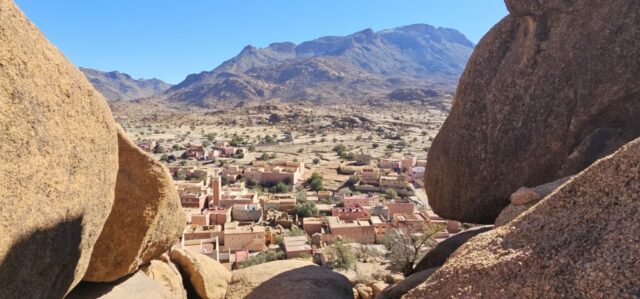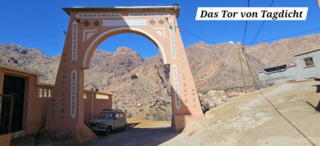 Zurück in Tafraout fahre ich Richtung Norden ins Tal der Ammeln, einem hier ansässigen Berberstamm im Anti-Atlas. Vorbei an schönen Oasen rolle ich hinunter bis ich zur Abzweigung nach Tagdicht, einem abgelegenen Bergdorf, komme. Eine Serpentinenstraße führt mich immer höher, umgeben von schroffen Felsformationen in allen erdenklichen Rottönen. Nach 730 Höhenmetern komme ich oben an. Es ist ein schönes Dorf am Ende des Talschlusses.