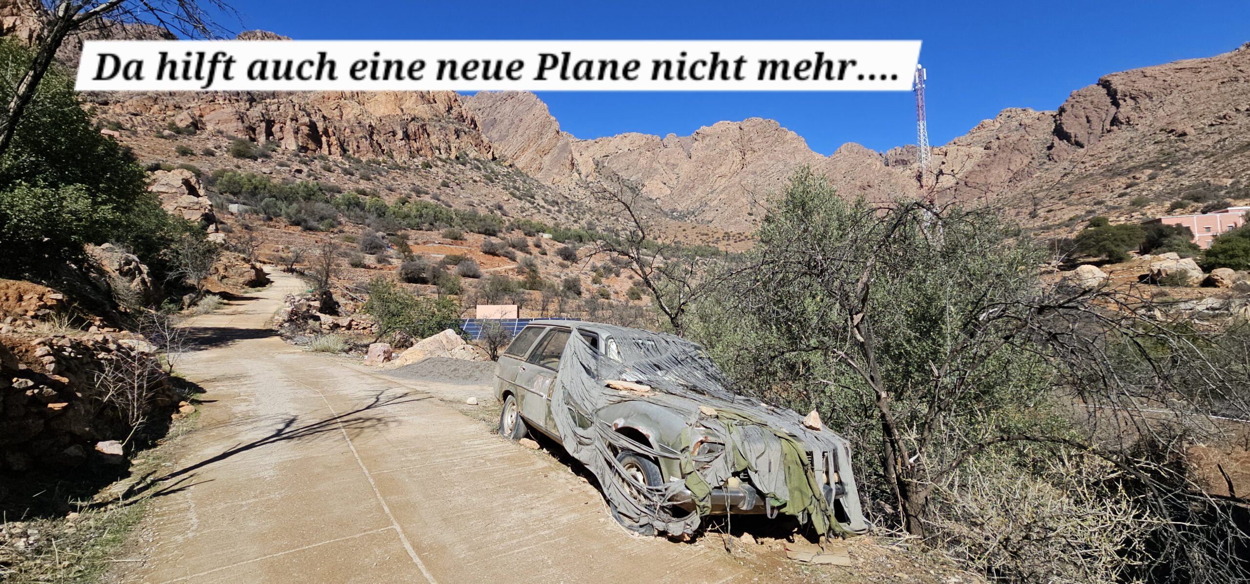 Ein Marokkaner kommt vorbei und frägt, ob man eine Reparatur am Womo benötige. Es gibt hier, wie auch in vielen anderen Orten auch, Werkstätten die sehr günstig die Karosserie und Lackierarbeiten machen. Ein paar hundert Meter weg von mir ist ein Betrieb, wo an einer Vielzahl von Fahrzeugen geflext, geschliffen, repariert und lackiert wird. Bei meiner Alubox auf dem Heckträger ist ein Verschluss, welcher relativ leicht geknackt werden könnte. Schon in Tamhroucht wurde mir ein Angebot um € 70 gemacht, was mir zu teuer vorgekommen ist. Hier kostet es € 30 – für 3 Sicherheitsbügel herstellen und montieren. Das ist OK, ich sage zu und übermorgen wird hier an Ort und Stelle montiert.