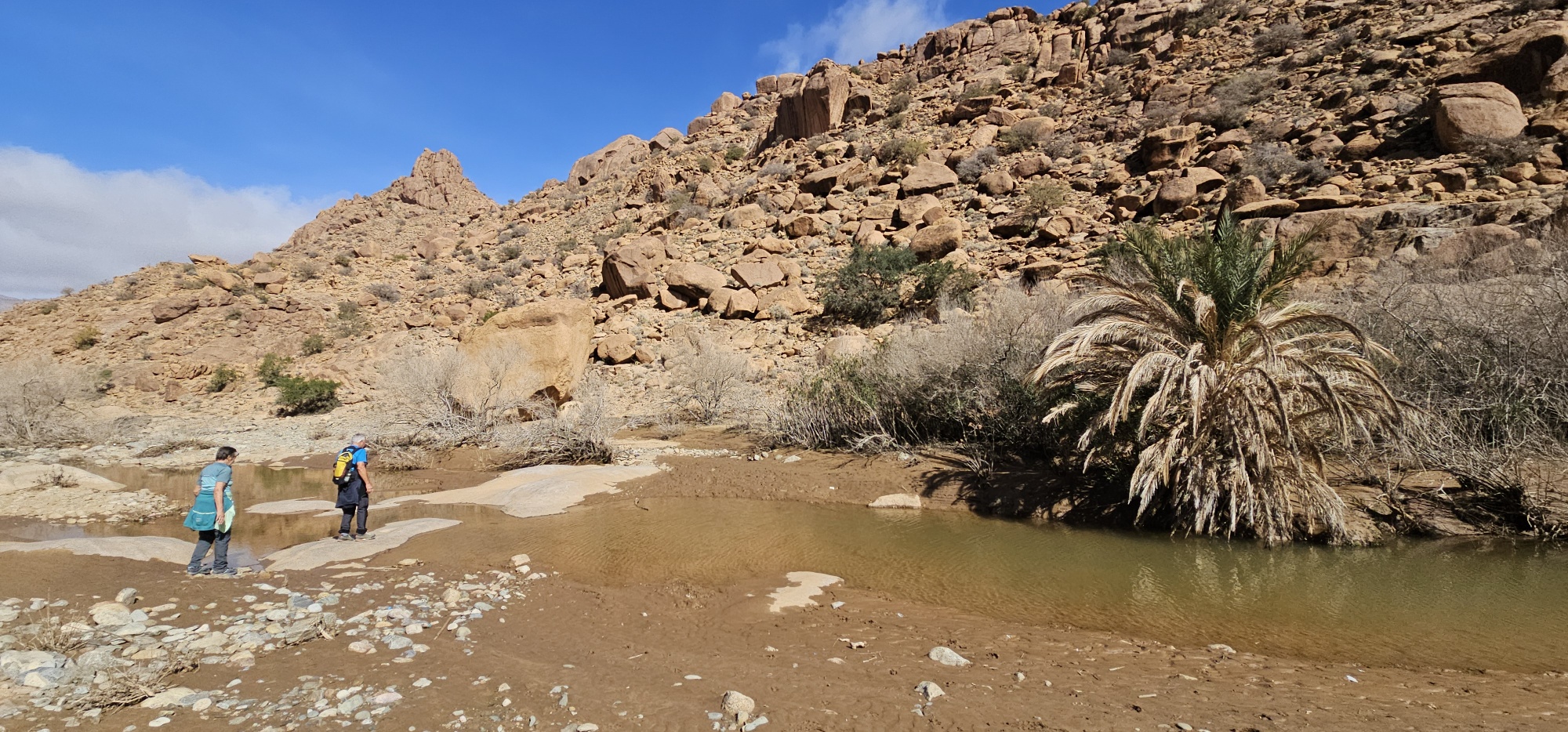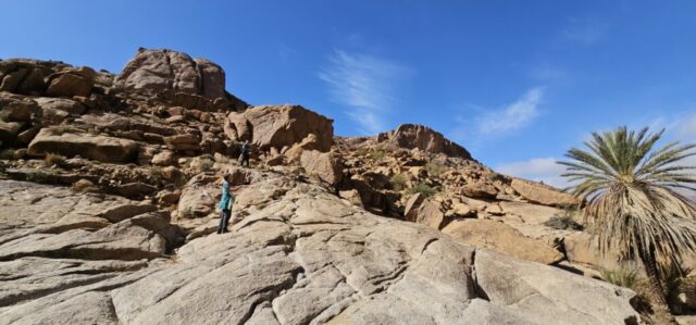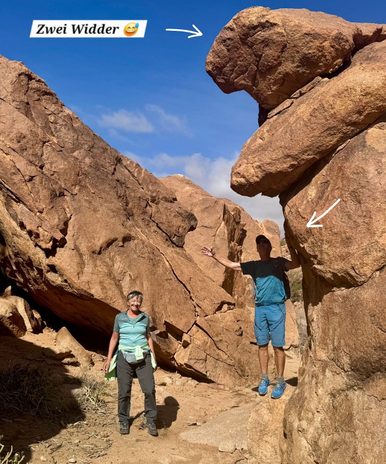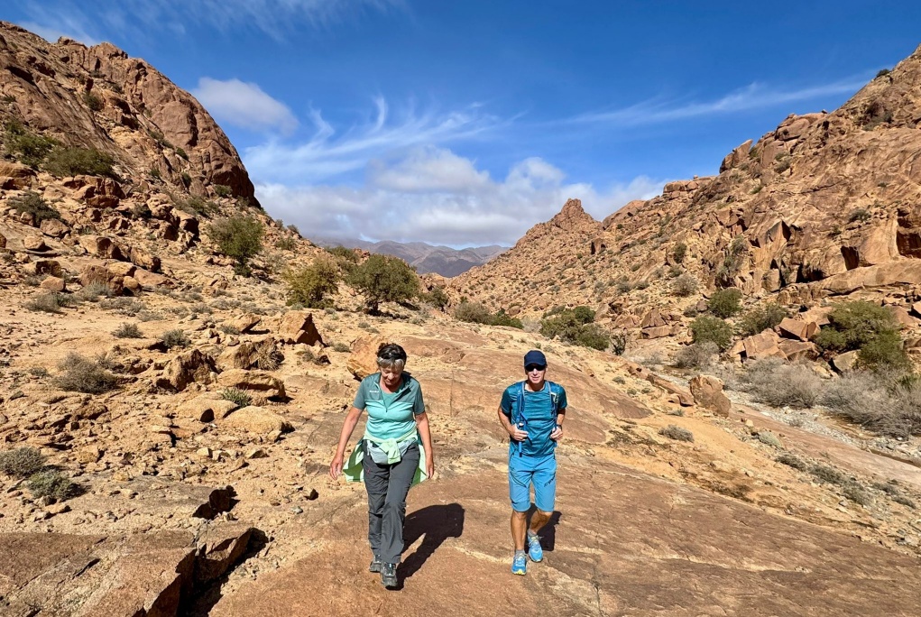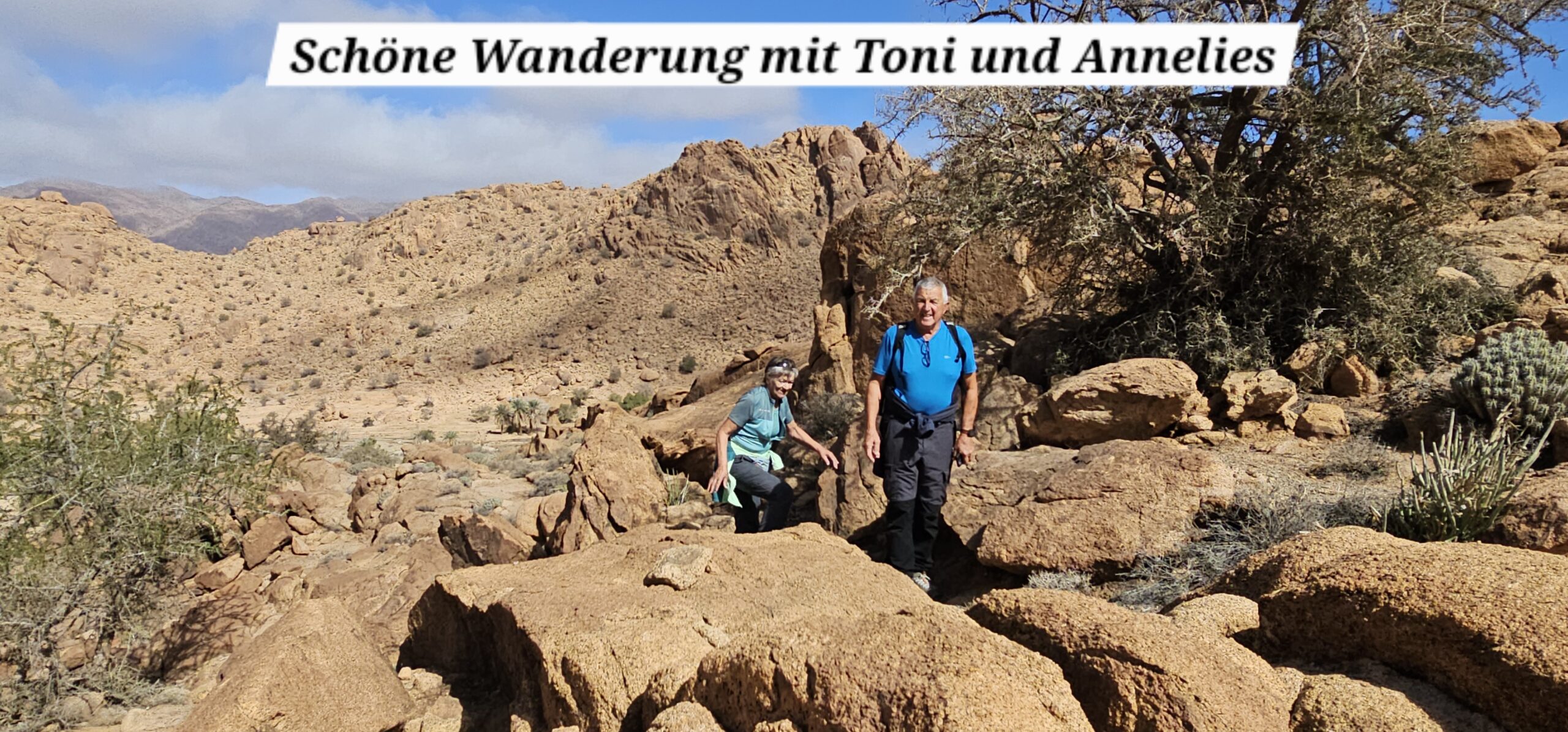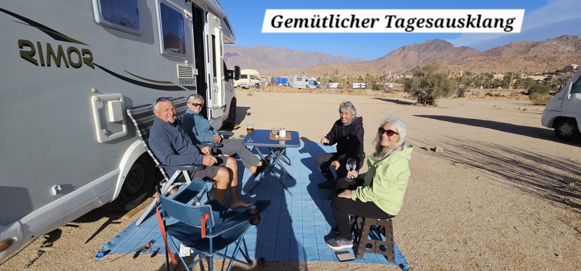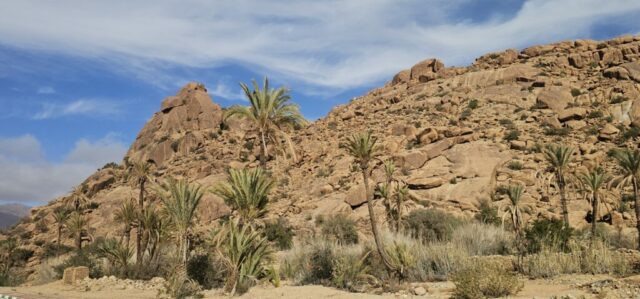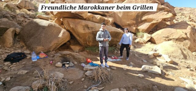 Um ca. 13 Uhr mache ich mit Toni und Annelies eine kleine Wanderung, insgesamt kommen heute 13 Kilometer zusammen. Am Ortsende von Tafraout wird leider Müll unsortiert abgelagert. Wir folgen einem Flusslauf, im Moment nicht ganz ausgetrocknet. Ein paar Palmen säumen den Weg und es hat immer wieder interessante Felsformationen. Auch sind mit etwas Fantasie einige „Tiere“ auszumachen. Unterwegs kaufe ich noch etwas Obst ein. Um ca. 16 Uhr sind wir zurück, genießen anschließend bei Toni und Annelies noch einen Drink. Dann ruft Bettina, meine Tochter an, und wir tauschen uns ein bisschen aus – und auch Emil mein Enkel lauscht mit und es ist sehr schön, beide wieder (zumindest auf dem Handydisplay) zu sehen. Wir plaudern mit Freunden und haben eine gesellige Zeit bis die Sonne langsam tiefer steht und es wieder frisch wird – Zeit um wieder in die eigenen „4 Wände“ zurückzukehren… So klingt der wiederum schöne Tag gemütlich aus.