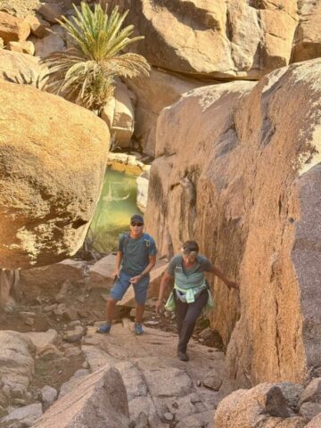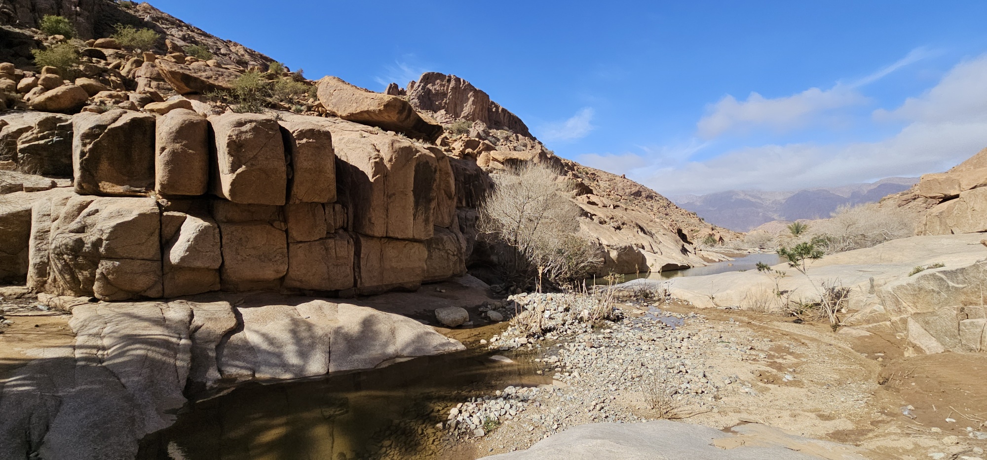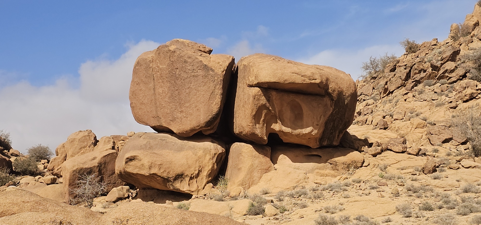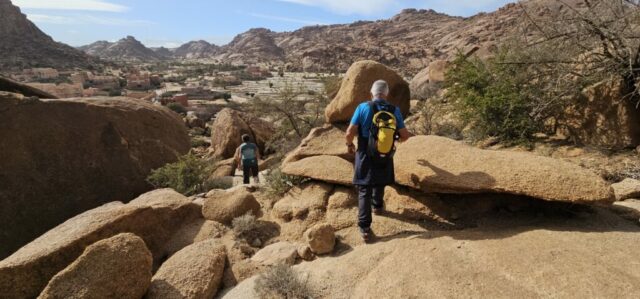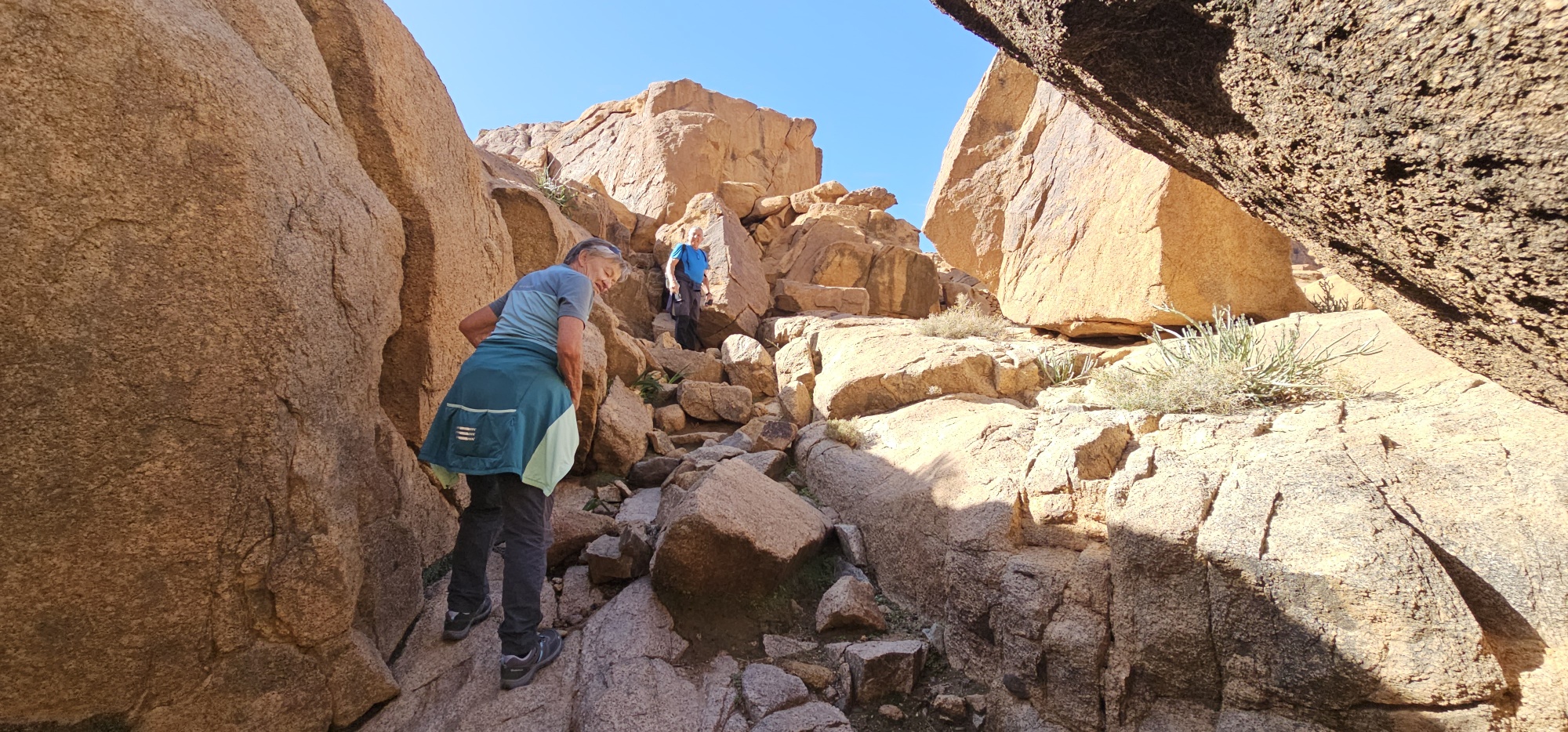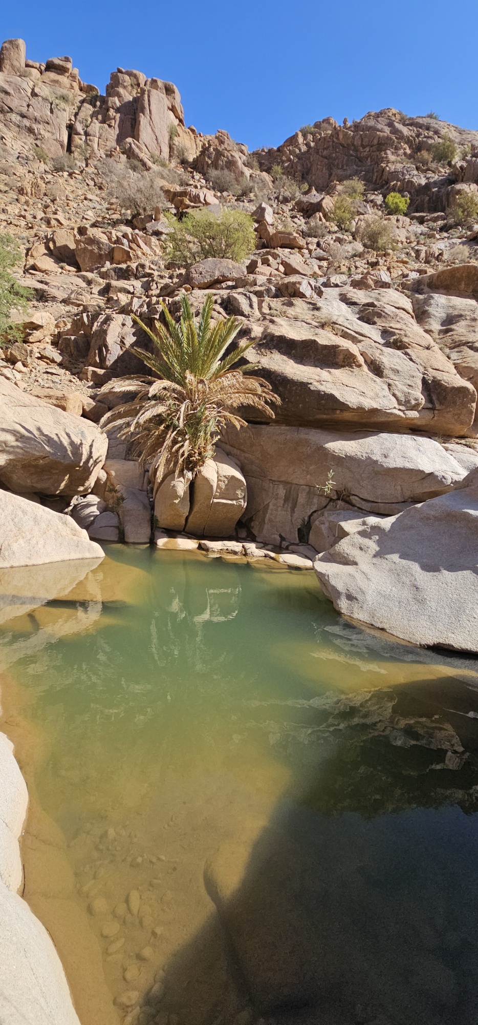 Um ca. 13 Uhr mache ich mit Toni und Annelies eine kleine Wanderung, insgesamt kommen heute 13 Kilometer zusammen. Am Ortsende von Tafraout wird leider Müll unsortiert abgelagert. Wir folgen einem Flusslauf, im Moment nicht ganz ausgetrocknet. Ein paar Palmen säumen den Weg und es hat immer wieder interessante Felsformationen. Auch sind mit etwas Fantasie einige „Tiere“ auszumachen. Unterwegs kaufe ich noch etwas Obst ein. Um ca. 16 Uhr sind wir zurück, genießen anschließend bei Toni und Annelies noch einen Drink. Dann ruft Bettina, meine Tochter an, und wir tauschen uns ein bisschen aus – und auch Emil mein Enkel lauscht mit und es ist sehr schön, beide wieder (zumindest auf dem Handydisplay) zu sehen. Wir plaudern mit Freunden und haben eine gesellige Zeit bis die Sonne langsam tiefer steht und es wieder frisch wird – Zeit um wieder in die eigenen „4 Wände“ zurückzukehren… So klingt der wiederum schöne Tag gemütlich aus.