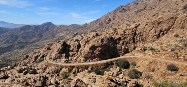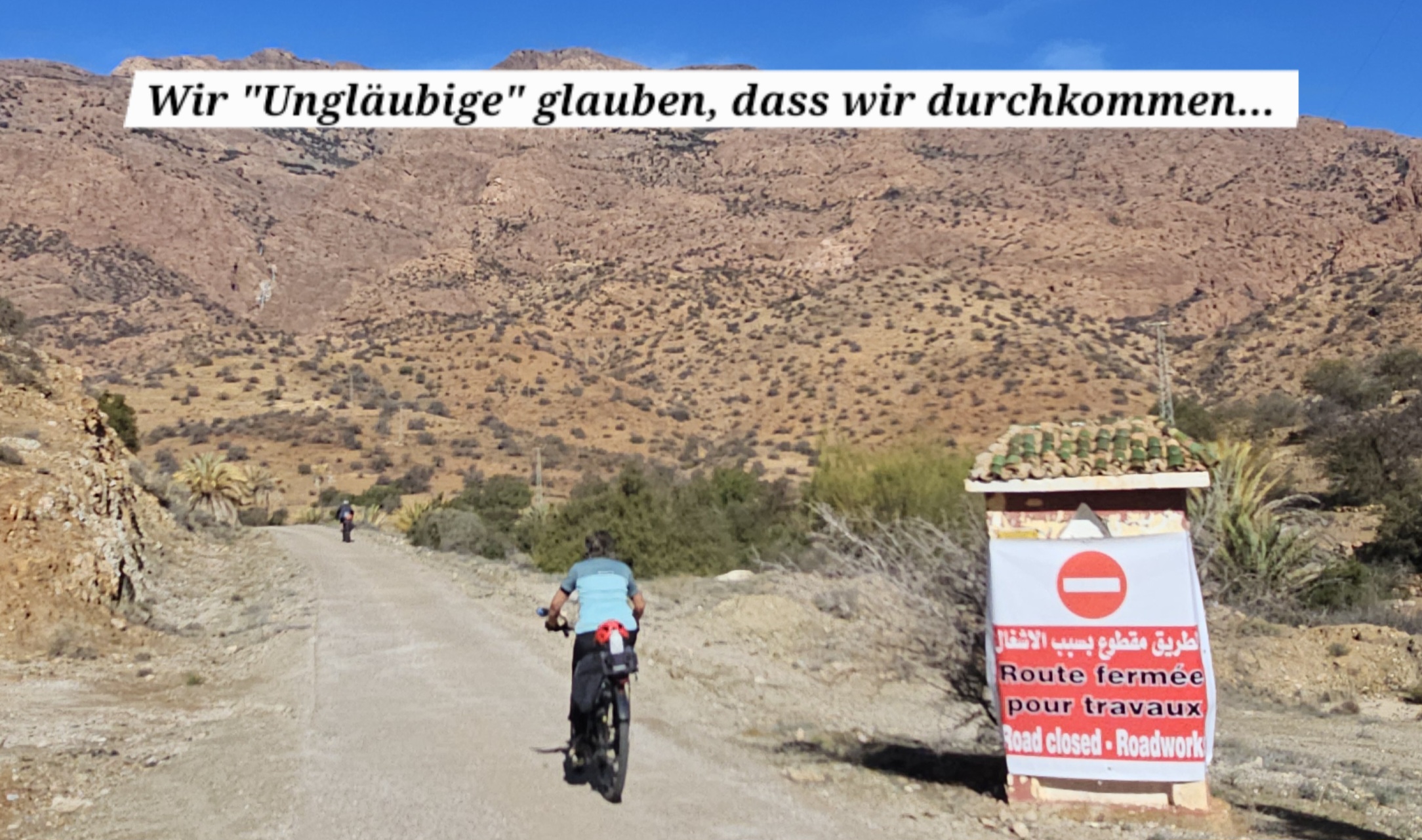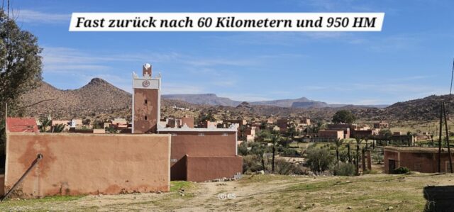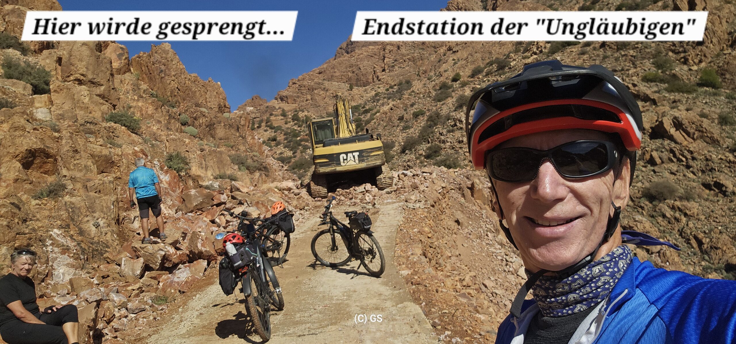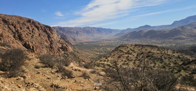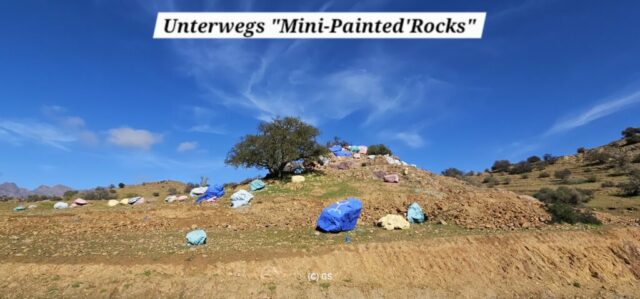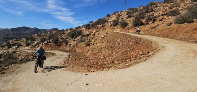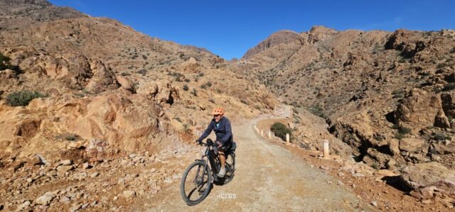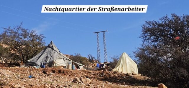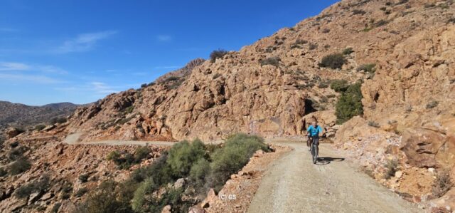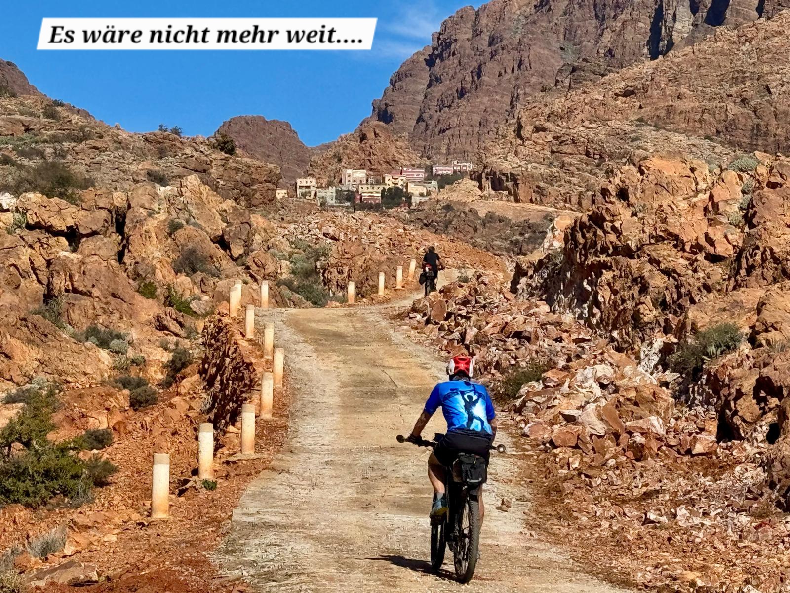 Zuerst rollen wir Richtung Ammelne wo der steinerne Löwe auf uns herunter schaut. Wir fahren dem Tal entlang weiter hinunter und kommen dann zur Abzweigung. Zuerst fahren wir auf Asphalt weiter, dann rechts weg auf eine Nebenstraße. Hier ist eine Tafel mit der Aufschrift „Straße gesperrt“. Aber wir „Ungläubige“ glauben, dass wir mit dem Rad schon durchkommen werden. Also weiter – es geht höher und höher. Zuerst auf einer noch relativ guten Betonstraße, dann wird es grob. Aber mit den E-Mountainbikes ist auch das gut zu schaffen. Unterwegs hören wir einen lauten Knall, können dies aber nicht zuordnen. Als das Bergdorf in Sichtweite ist, sehen wir einen Bagger welcher mitten auf der Straße. Wir sind optimistisch, daran vorbei zu kommen – was sich schlussendlich nicht bestätigt. Hier hat eine Sprengung stattgefunden und riesige Felsblöcke machen ein Weiterkommen unmöglich. Hier ist für uns leider Endstation und wir rollen vorsichtig hinab ins Tal. Hier fahren wir nicht wie zuerst geplant zurück nach Tafraoute, sondern dem Tal Richtung Westen weiter.