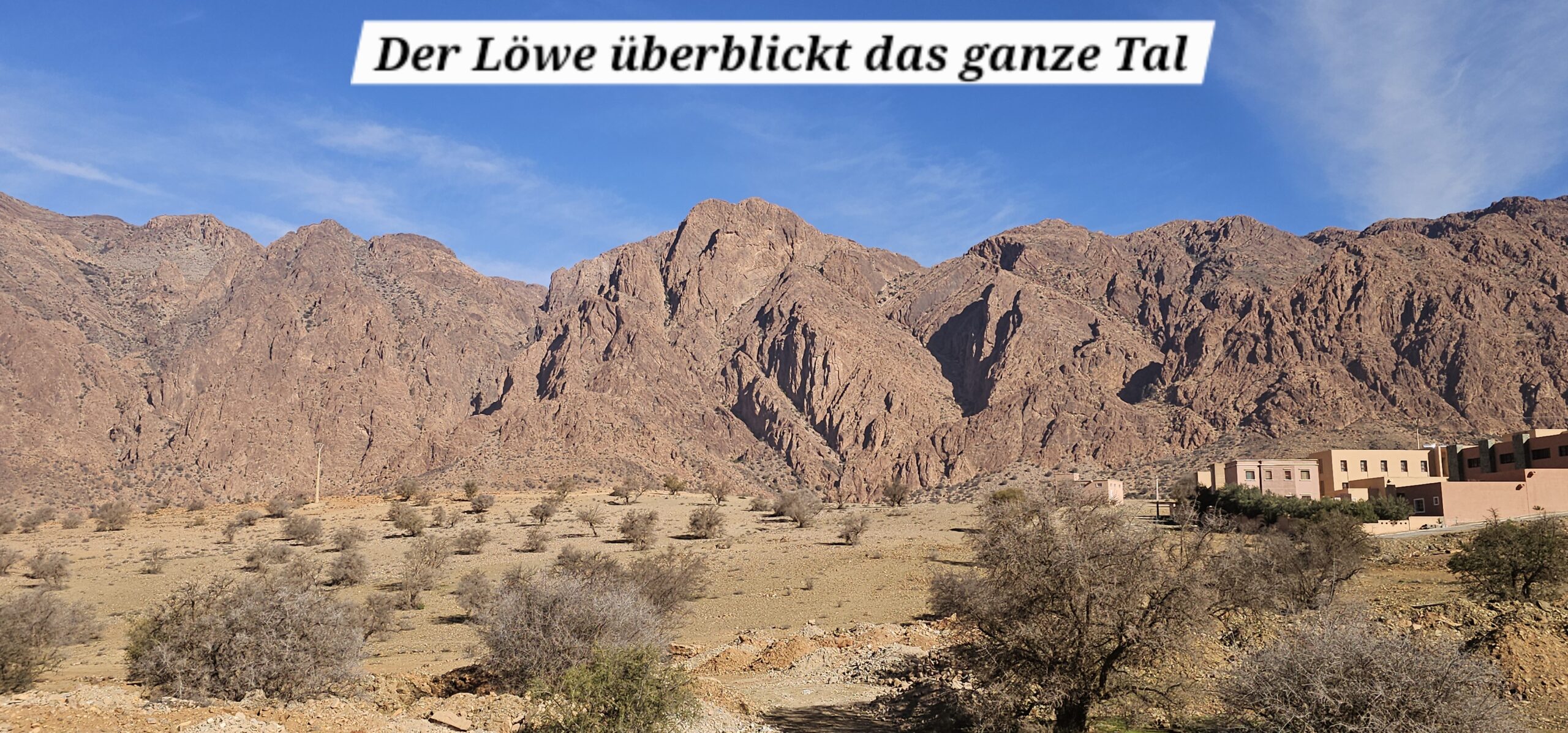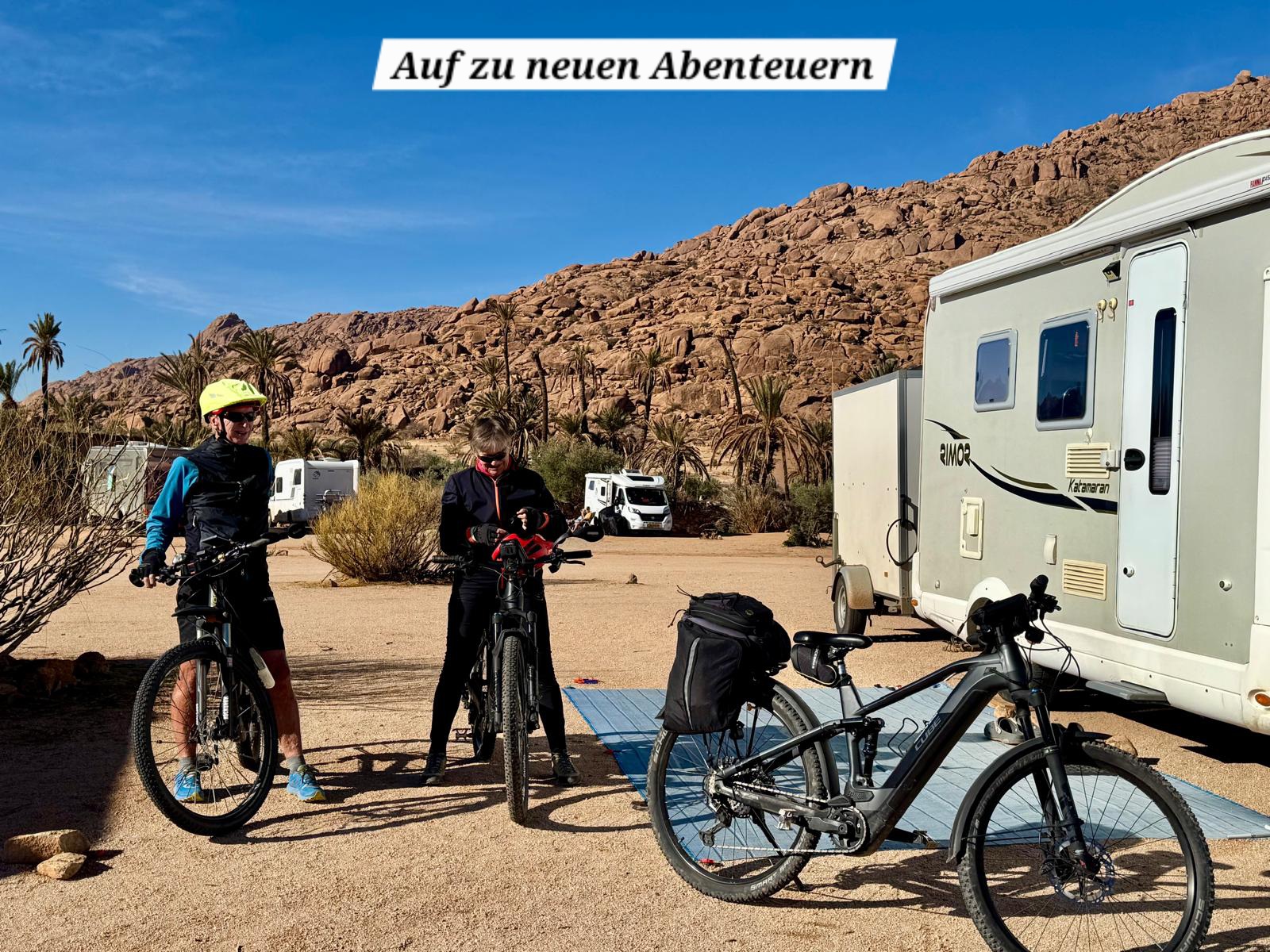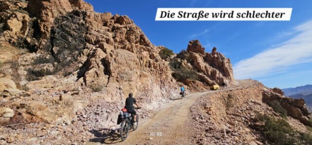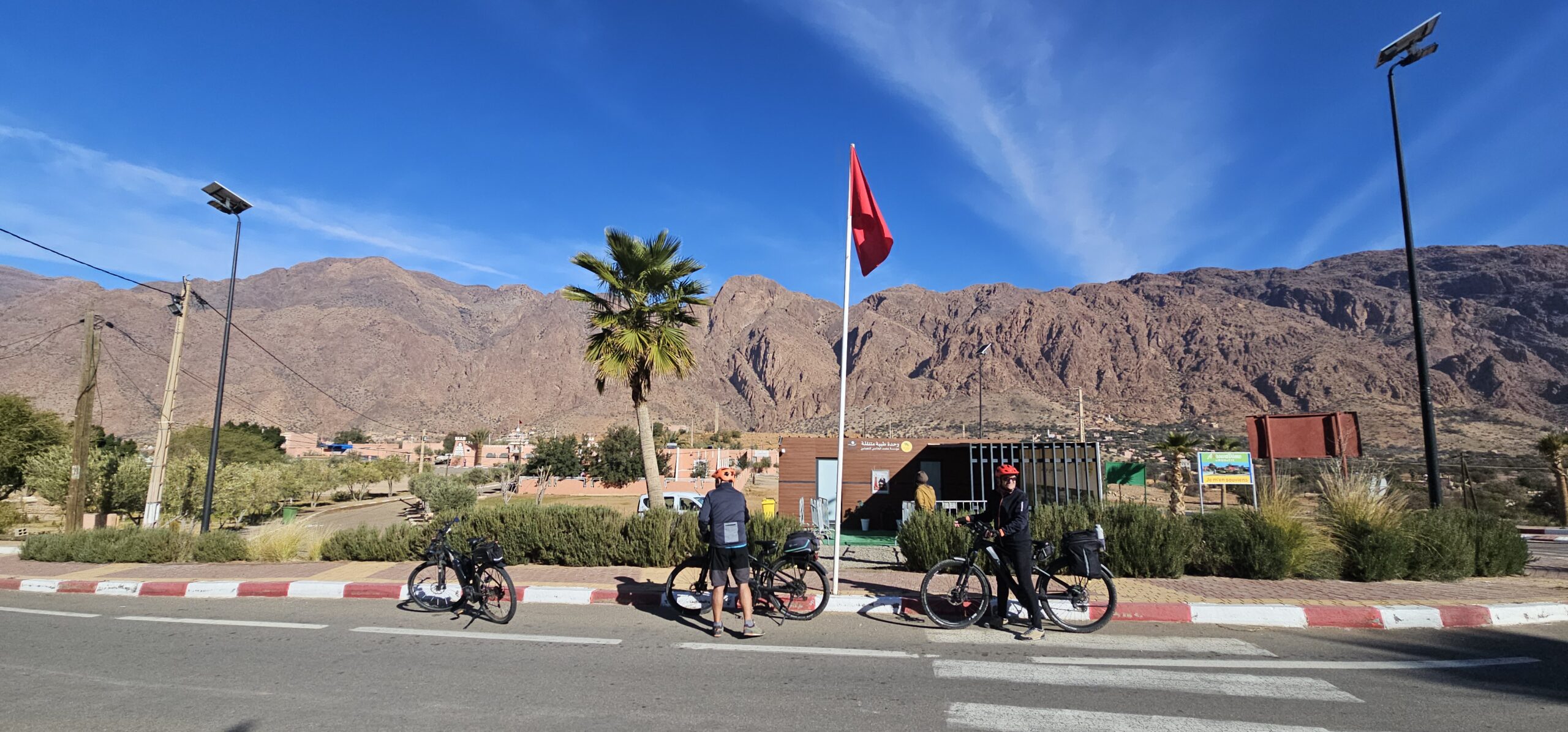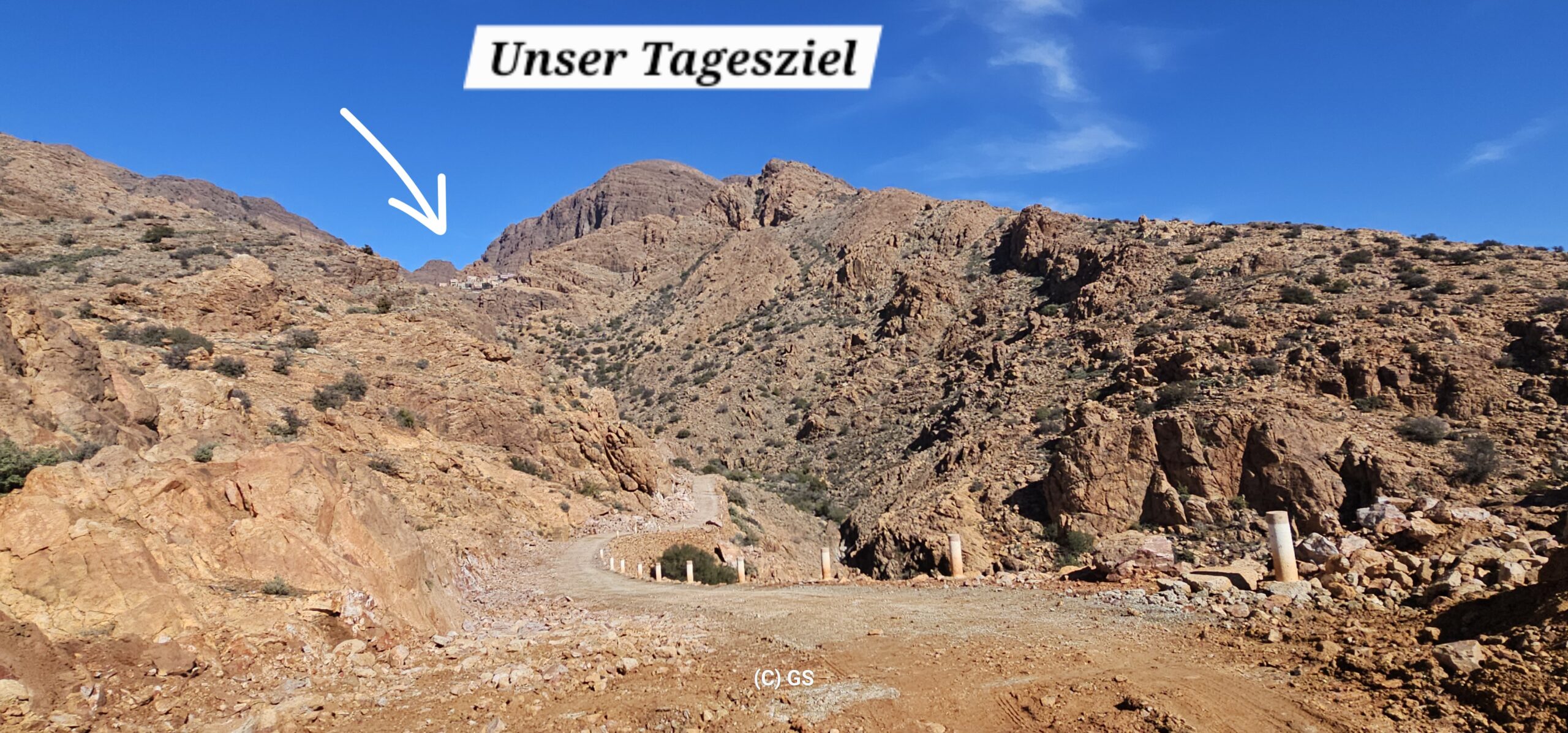 Zuerst rollen wir Richtung Ammelne wo der steinerne Löwe auf uns herunter schaut. Wir fahren dem Tal entlang weiter hinunter und kommen dann zur Abzweigung. Zuerst fahren wir auf Asphalt weiter, dann rechts weg auf eine Nebenstraße. Hier ist eine Tafel mit der Aufschrift „Straße gesperrt“. Aber wir „Ungläubige“ glauben, dass wir mit dem Rad schon durchkommen werden. Also weiter – es geht höher und höher. Zuerst auf einer noch relativ guten Betonstraße, dann wird es grob. Aber mit den E-Mountainbikes ist auch das gut zu schaffen. Unterwegs hören wir einen lauten Knall, können dies aber nicht zuordnen. Als das Bergdorf in Sichtweite ist, sehen wir einen Bagger welcher mitten auf der Straße. Wir sind optimistisch, daran vorbei zu kommen – was sich schlussendlich nicht bestätigt. Hier hat eine Sprengung stattgefunden und riesige Felsblöcke machen ein Weiterkommen unmöglich. Hier ist für uns leider Endstation und wir rollen vorsichtig hinab ins Tal. Hier fahren wir nicht wie zuerst geplant zurück nach Tafraoute, sondern dem Tal Richtung Westen weiter.