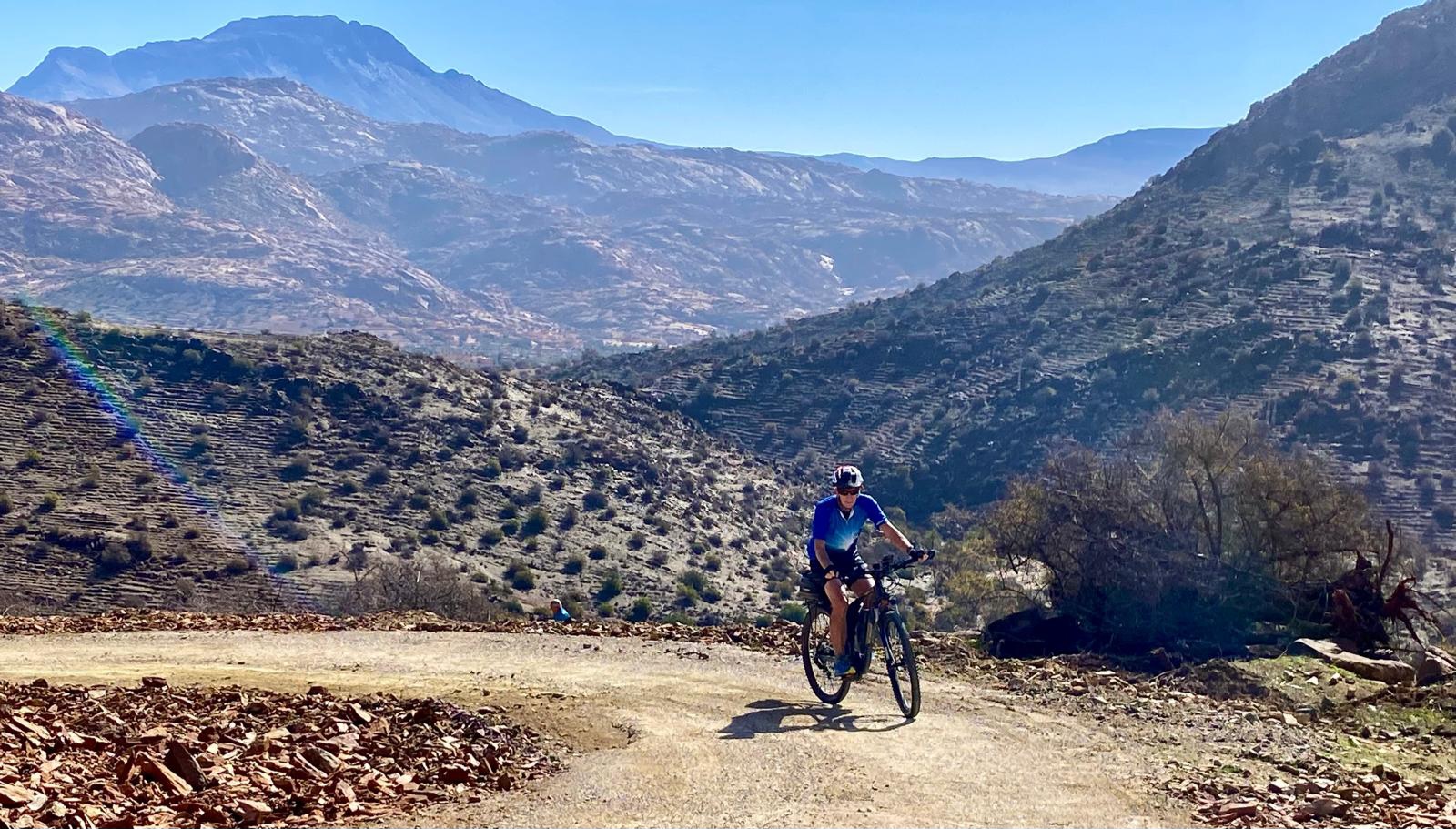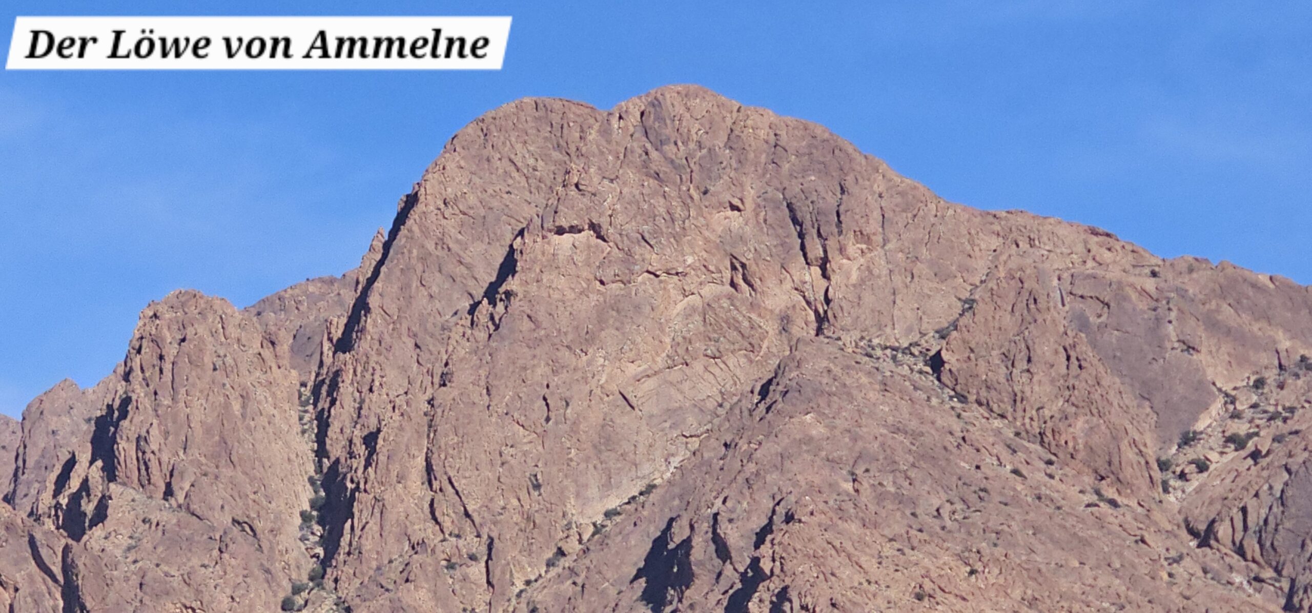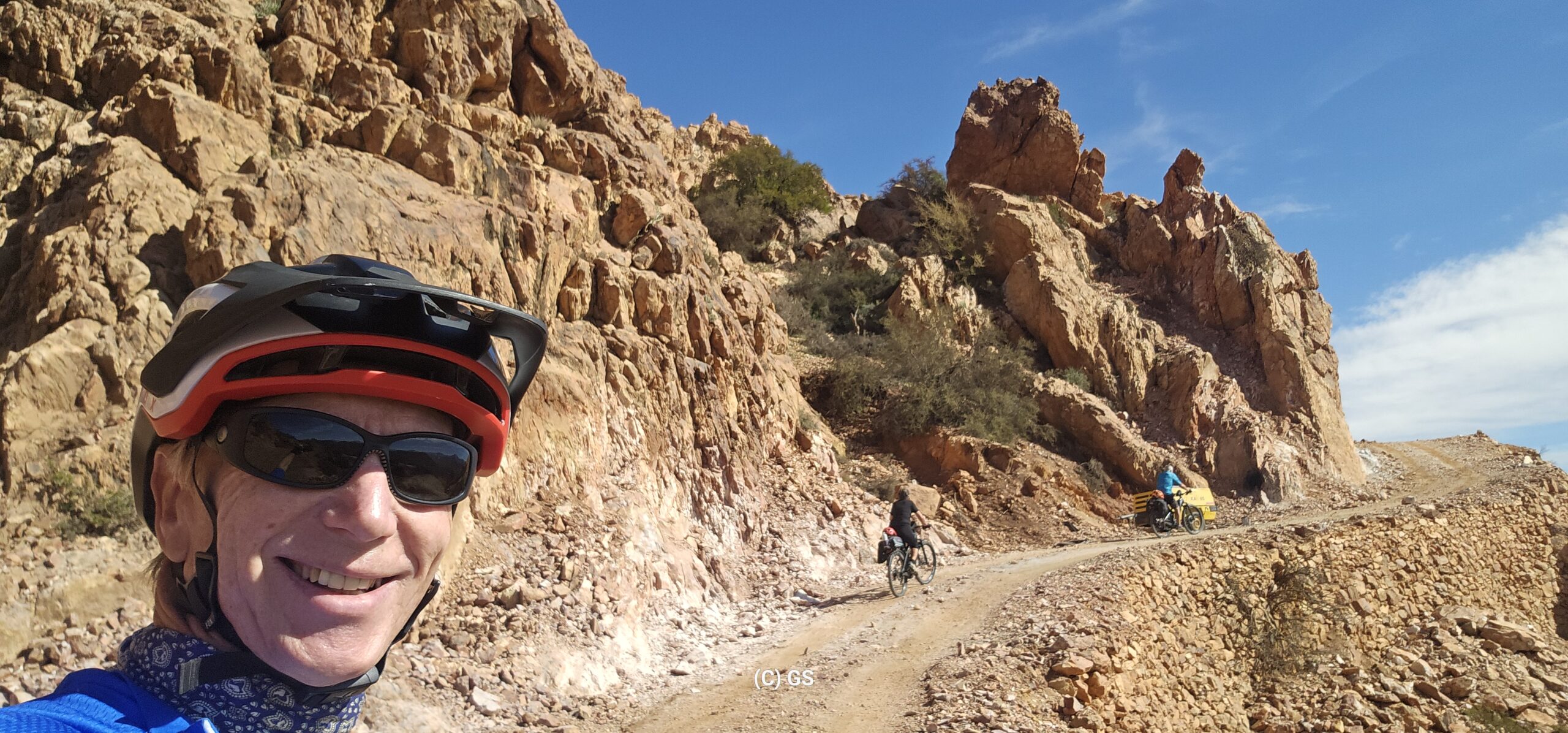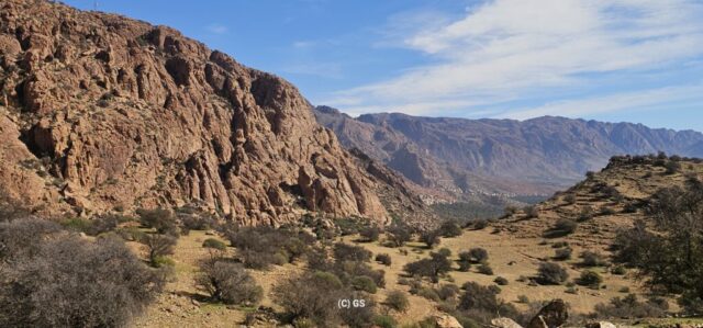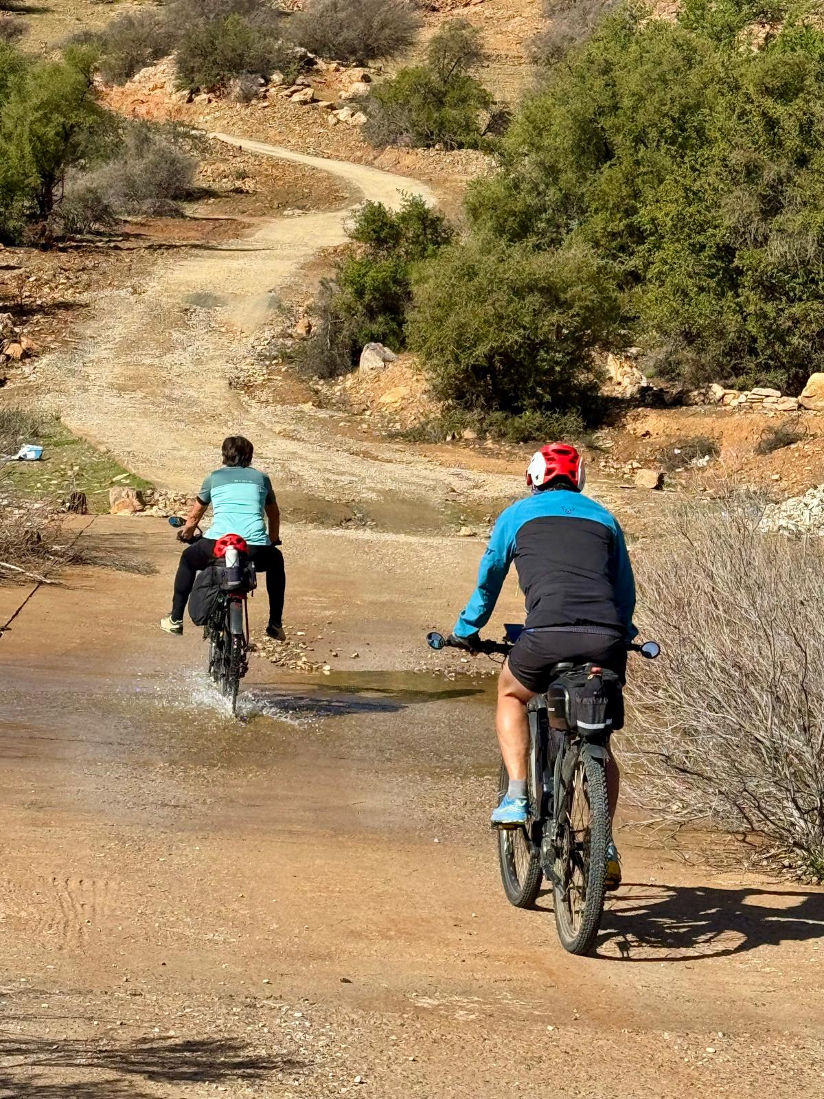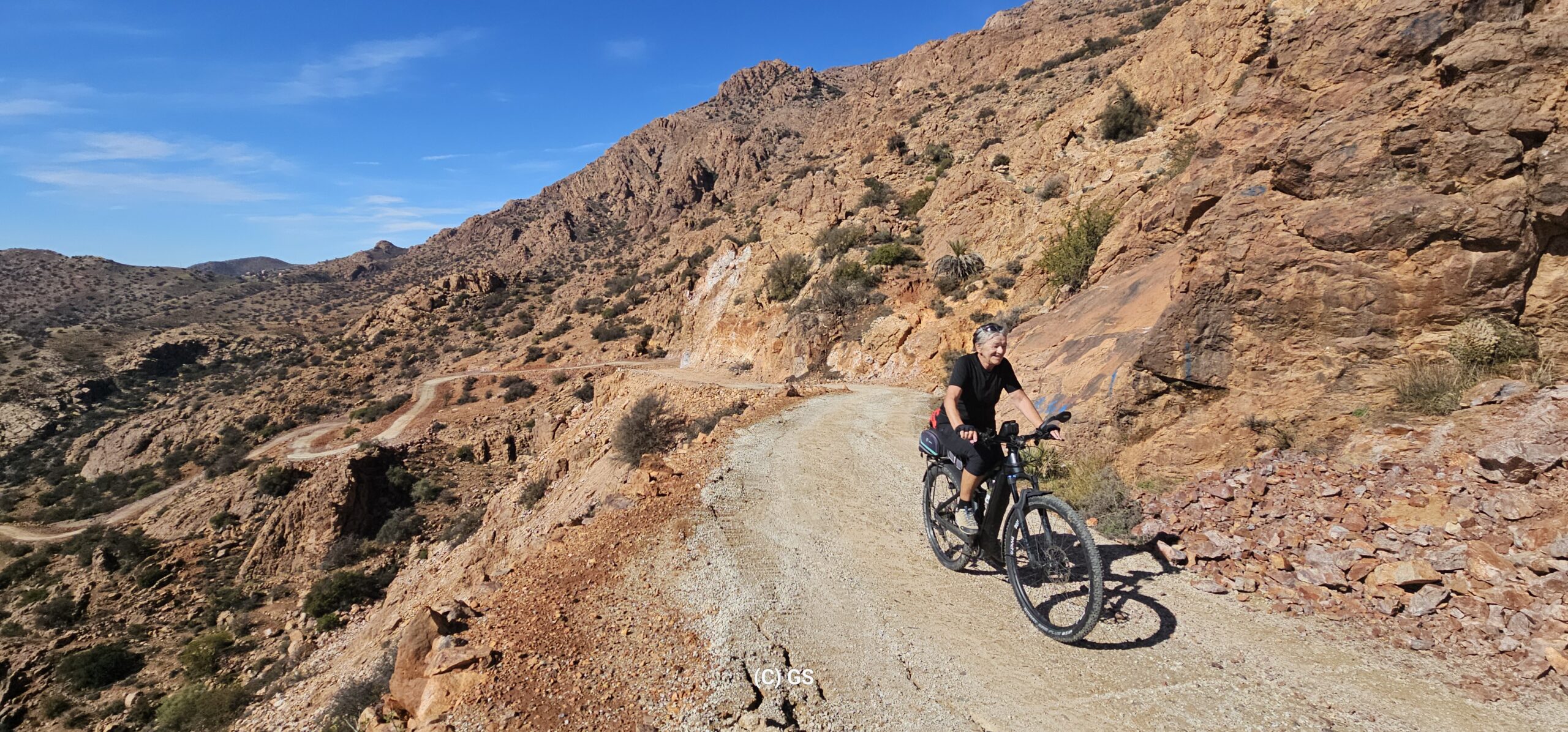 Zuerst rollen wir Richtung Ammelne wo der steinerne Löwe auf uns herunter schaut. Wir fahren dem Tal entlang weiter hinunter und kommen dann zur Abzweigung. Zuerst fahren wir auf Asphalt weiter, dann rechts weg auf eine Nebenstraße. Hier ist eine Tafel mit der Aufschrift „Straße gesperrt“. Aber wir „Ungläubige“ glauben, dass wir mit dem Rad schon durchkommen werden. Also weiter – es geht höher und höher. Zuerst auf einer noch relativ guten Betonstraße, dann wird es grob. Aber mit den E-Mountainbikes ist auch das gut zu schaffen. Unterwegs hören wir einen lauten Knall, können dies aber nicht zuordnen. Als das Bergdorf in Sichtweite ist, sehen wir einen Bagger welcher mitten auf der Straße. Wir sind optimistisch, daran vorbei zu kommen – was sich schlussendlich nicht bestätigt. Hier hat eine Sprengung stattgefunden und riesige Felsblöcke machen ein Weiterkommen unmöglich. Hier ist für uns leider Endstation und wir rollen vorsichtig hinab ins Tal. Hier fahren wir nicht wie zuerst geplant zurück nach Tafraoute, sondern dem Tal Richtung Westen weiter.