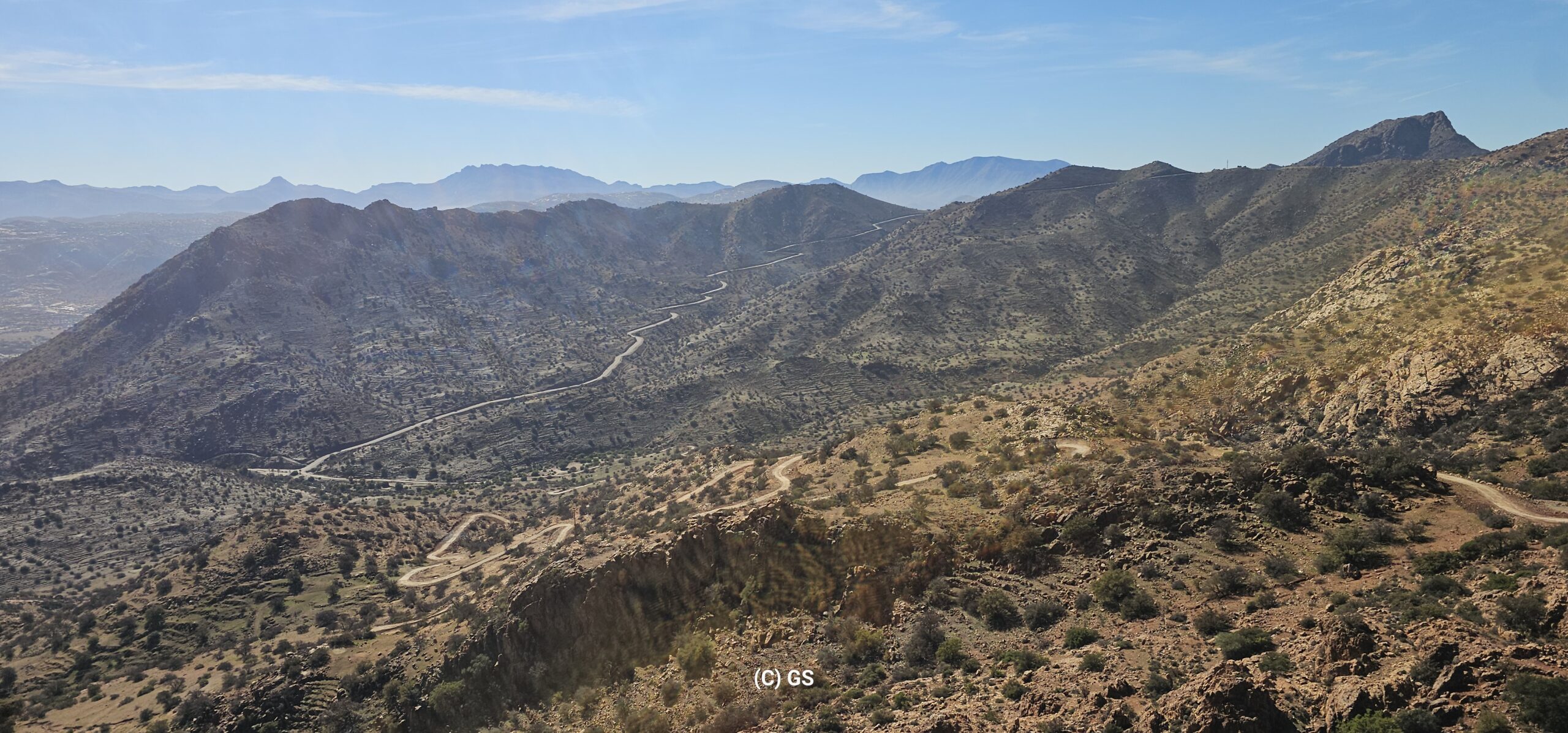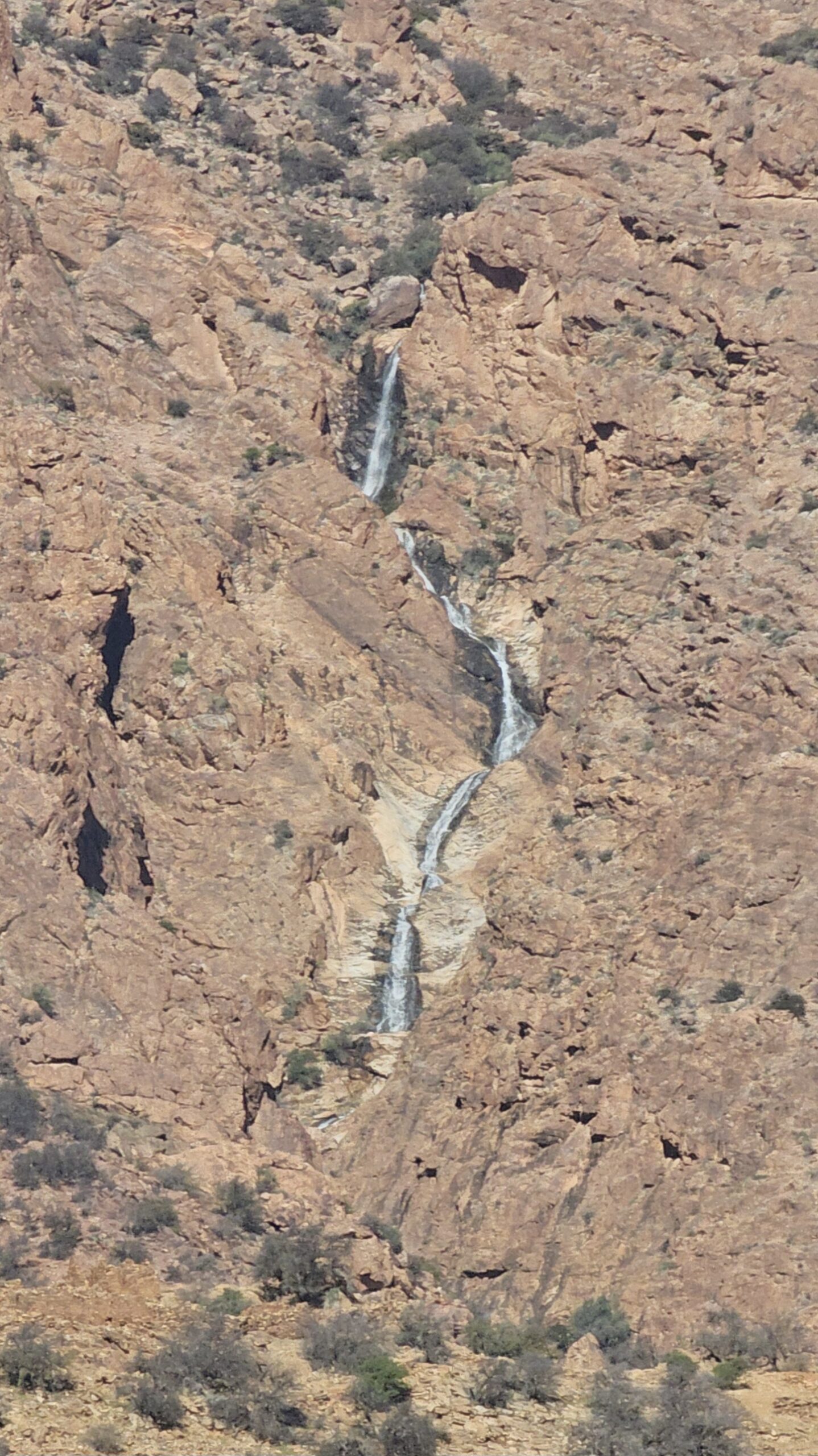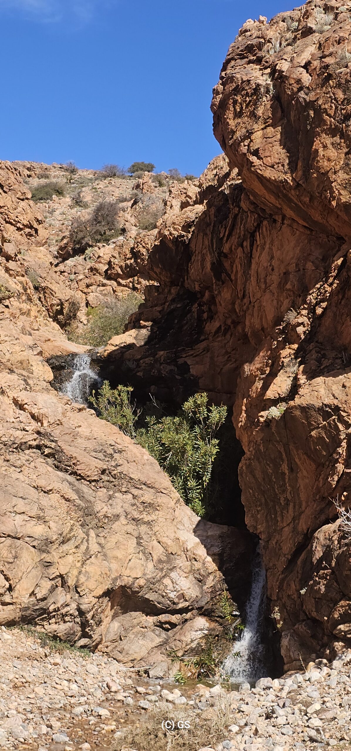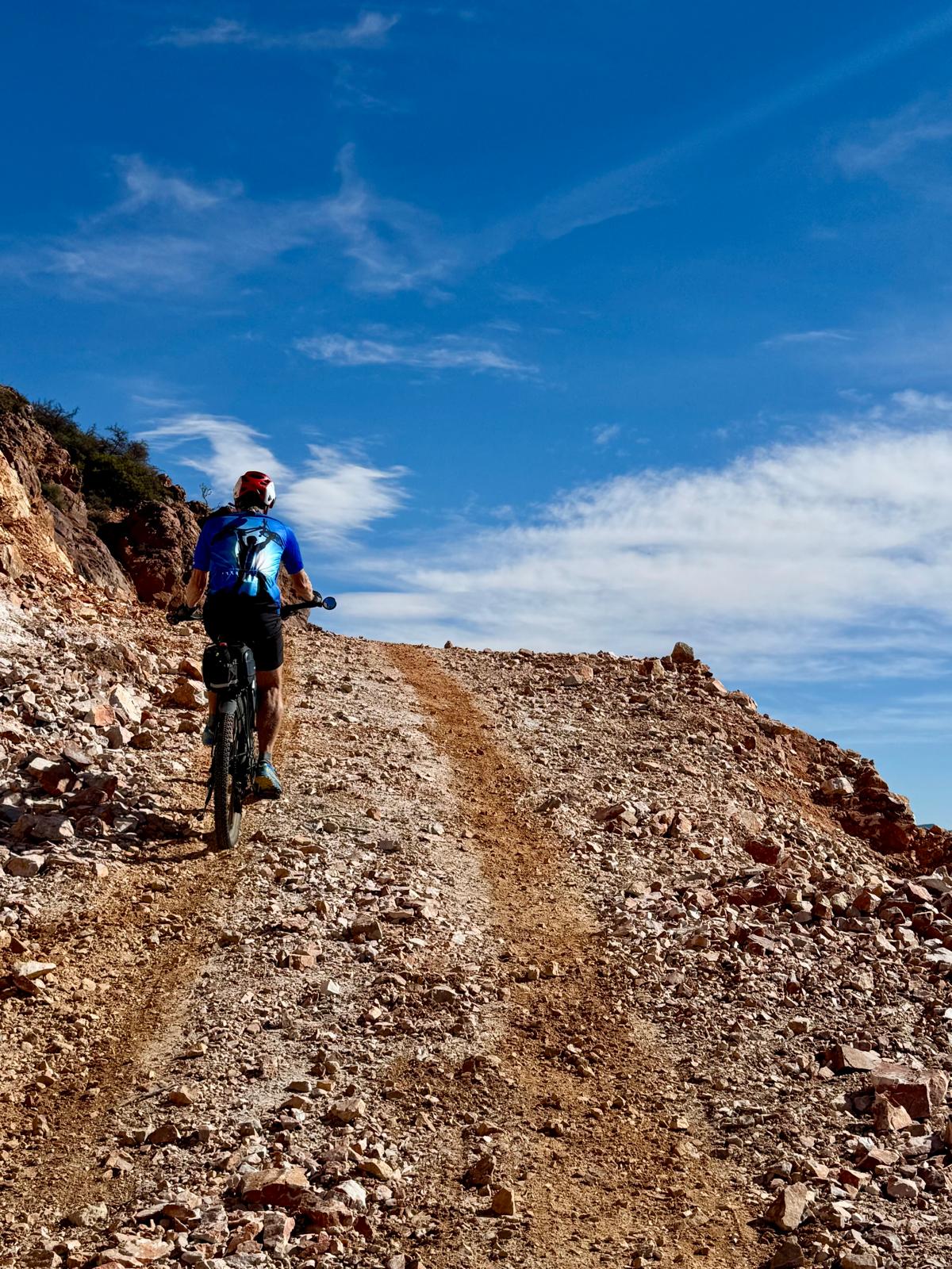 Zuerst rollen wir Richtung Ammelne wo der steinerne Löwe auf uns herunter schaut. Wir fahren dem Tal entlang weiter hinunter und kommen dann zur Abzweigung. Zuerst fahren wir auf Asphalt weiter, dann rechts weg auf eine Nebenstraße. Hier ist eine Tafel mit der Aufschrift „Straße gesperrt“. Aber wir „Ungläubige“ glauben, dass wir mit dem Rad schon durchkommen werden. Also weiter – es geht höher und höher. Zuerst auf einer noch relativ guten Betonstraße, dann wird es grob. Aber mit den E-Mountainbikes ist auch das gut zu schaffen. Unterwegs hören wir einen lauten Knall, können dies aber nicht zuordnen. Als das Bergdorf in Sichtweite ist, sehen wir einen Bagger welcher mitten auf der Straße. Wir sind optimistisch, daran vorbei zu kommen – was sich schlussendlich nicht bestätigt. Hier hat eine Sprengung stattgefunden und riesige Felsblöcke machen ein Weiterkommen unmöglich. Hier ist für uns leider Endstation und wir rollen vorsichtig hinab ins Tal. Hier fahren wir nicht wie zuerst geplant zurück nach Tafraoute, sondern dem Tal Richtung Westen weiter.