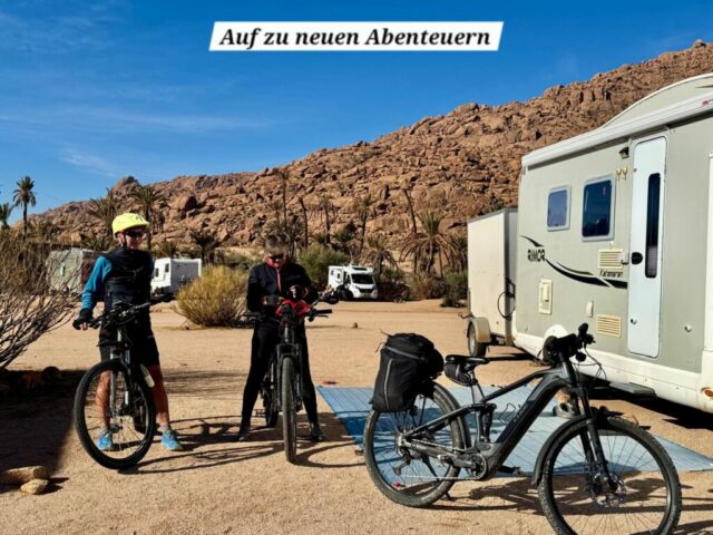 Aber Erstens kommt es anders Zweitens als man denkt: auch hier haben wir wieder Gegenwind, im besten Fall von der Seite… Mit etwas mehr Unterstützung vom Akku bewältigen wir auch die letzte lange Steigung und zum Schluss haben wir noch eine kurze Abfahrt bis zu unserem Stellplatz. Nach ca. 60 Kilometern und 950 Höhenmetern sind wir dann zurück – das war eine gute Tagesleistung.