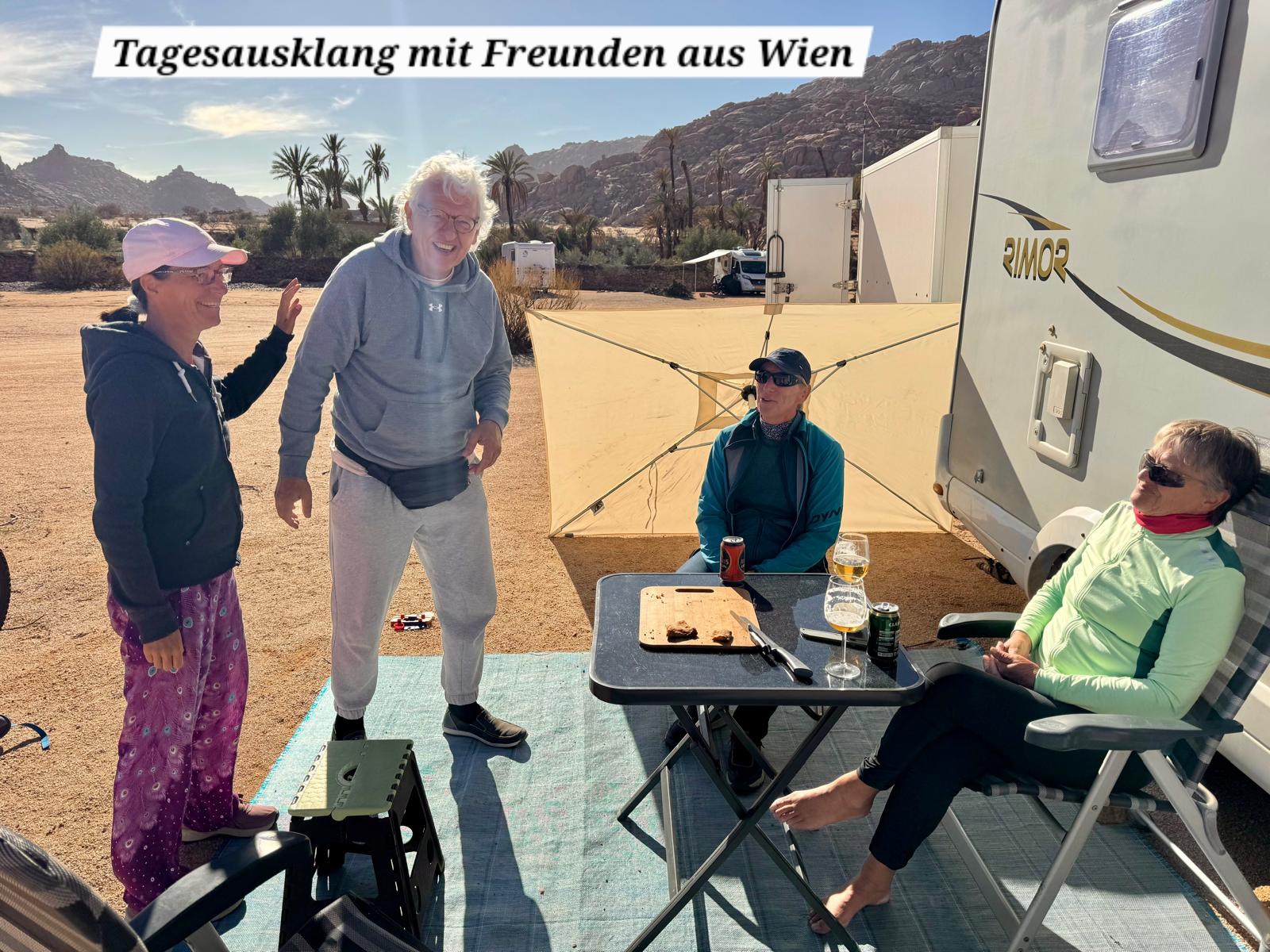 Bei einem Drink plaudern wir noch ein bisschen an der Sonne. Es kommen auch Wiener Freunde von Toni und Annelies, welche gerade hier angekommen sind. Marokkanische Freunde bringen dann noch eine Berberpizza, welche sehr gut schmeckt.