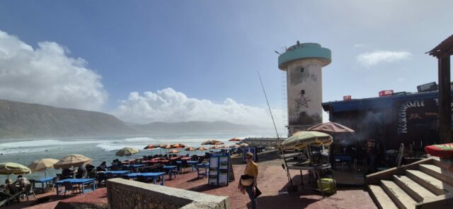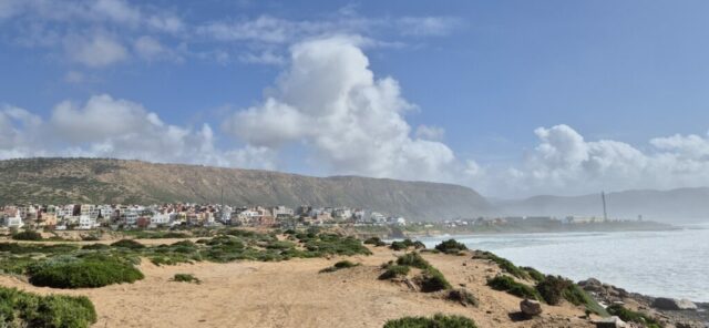 Auf dem Rückweg fängt es an leicht zu regnen. Der Quad-Bike Verleiher, auf dessen Parkplatz ich stehe, bietet mir im Nomadenzelt einen Tee an. Dort sitze eine Radfahrerin deren Dialekt unverkennbar ist. Sie kommt aus dem benachbarten Teufen in der Schweiz, gerade einen Katzensprung von meinem zuhause entfernt. Wir unterhalten uns ein bisschen und dann fahre ich weiter Richtung Imsouane. An diesem Surfer-Hot-Spot ist die längste Welle Marokkos, 600 bis 800 m lang.