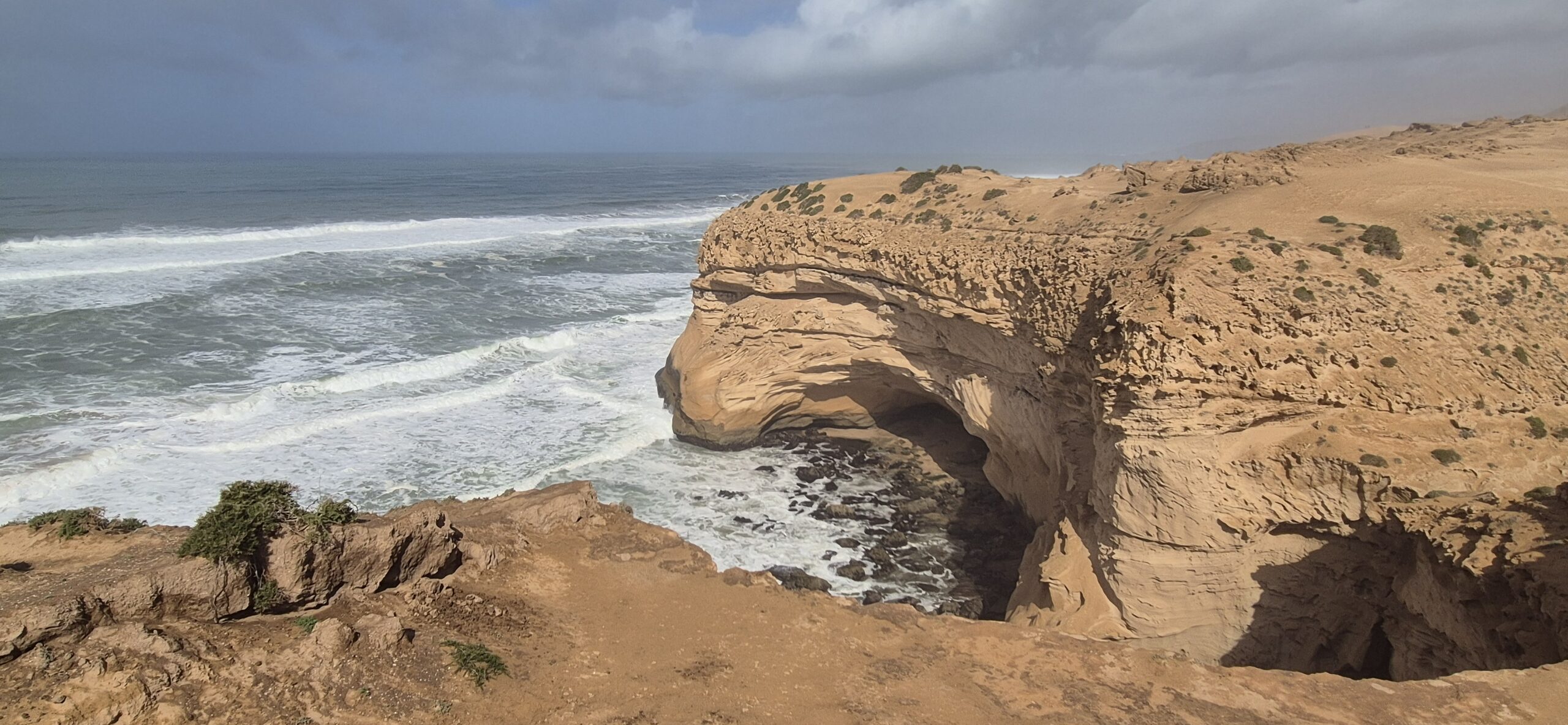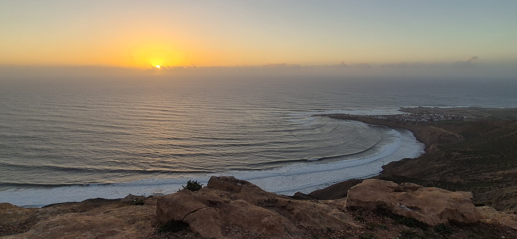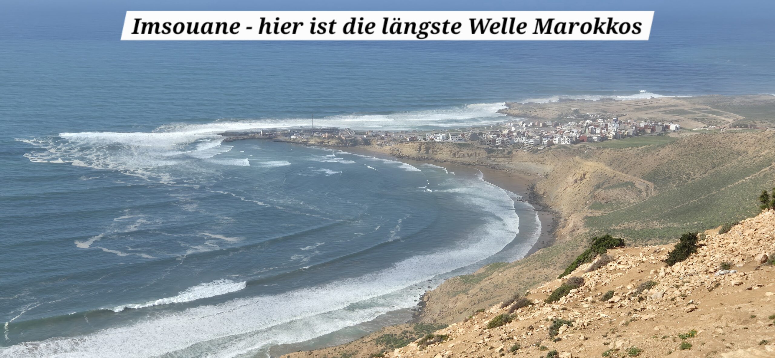 Auf dem Rückweg fängt es an leicht zu regnen. Der Quad-Bike Verleiher, auf dessen Parkplatz ich stehe, bietet mir im Nomadenzelt einen Tee an. Dort sitze eine Radfahrerin deren Dialekt unverkennbar ist. Sie kommt aus dem benachbarten Teufen in der Schweiz, gerade einen Katzensprung von meinem zuhause entfernt. Wir unterhalten uns ein bisschen und dann fahre ich weiter Richtung Imsouane. An diesem Surfer-Hot-Spot ist die längste Welle Marokkos, 600 bis 800 m lang.