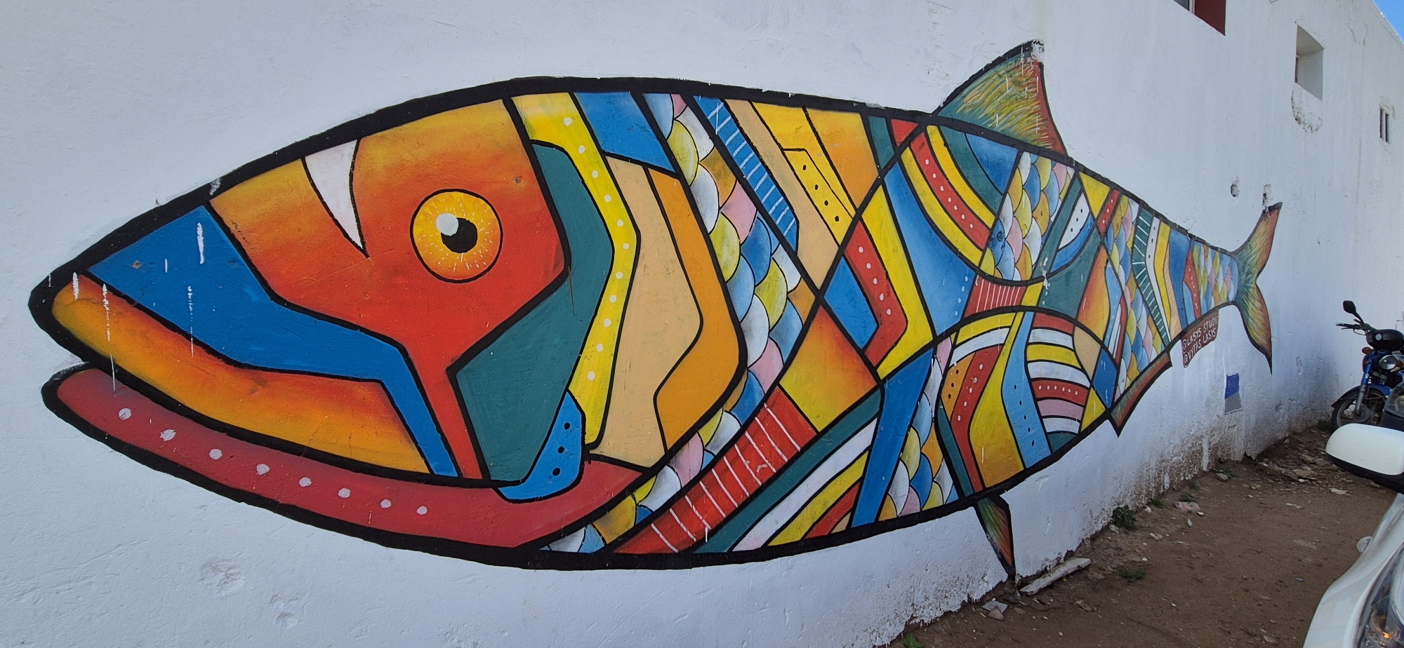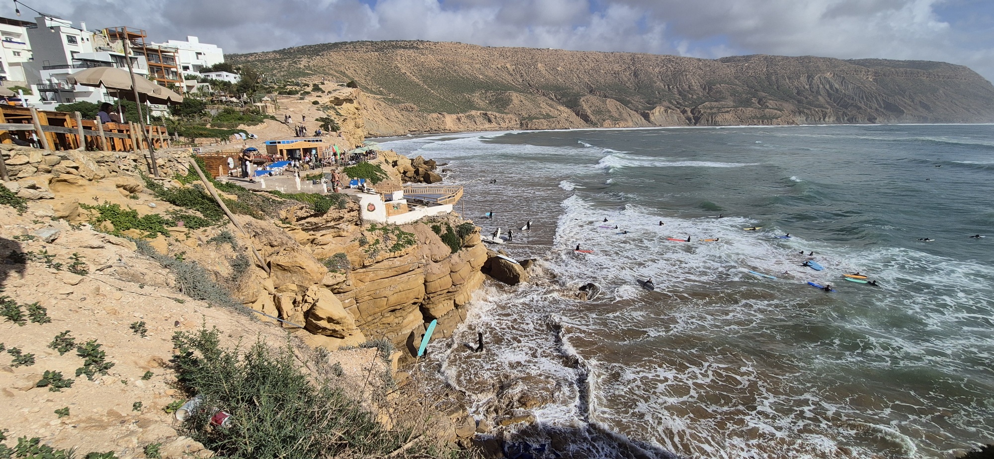 Auf der Anhöhe, ca. 200 m über dem Meer, vor ich den Ort erreiche, steuere ich einen Parkplatz an, wo es eine fantastische Aussicht auf den authentischen Fischerort gibt. Dann fahre ich hinunter und erkunde das Dorf wo wiederum eine sehr entspannte Atmosphäre mit vielen jungen Surfern herrscht.