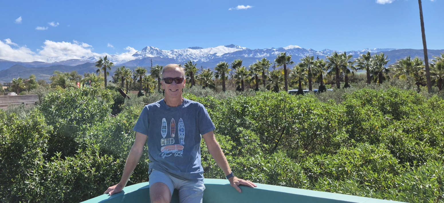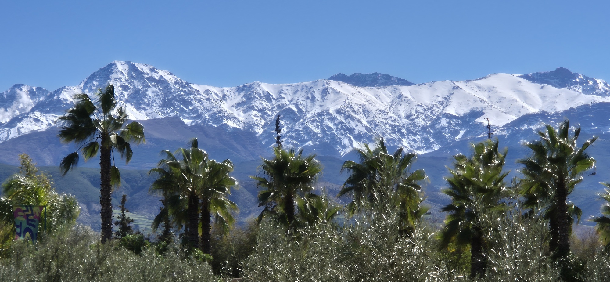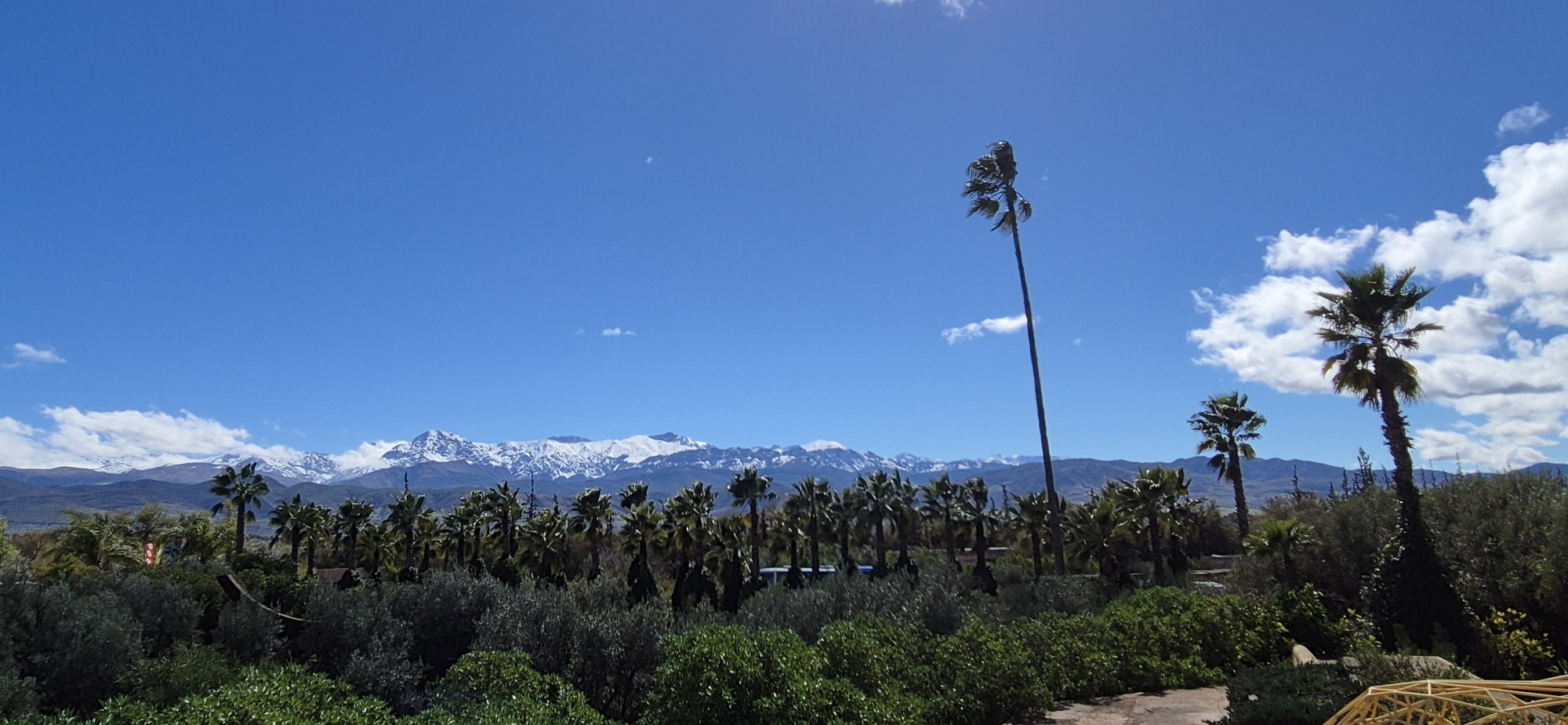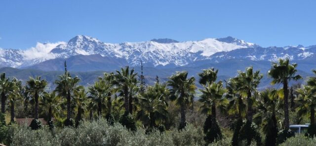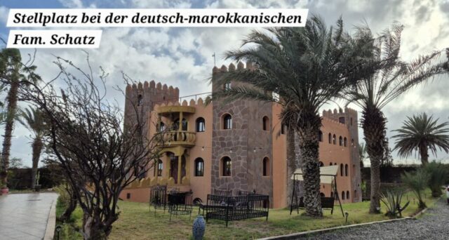 Auf der Rooftop-Terrasse habe ich einen tollen Blick zu den schneebedeckten Gipfeln des Hohen Atlas, davor schmücken Palmen das wunderschöne Panorama. Eigentlich wollte ich hier übernachten aber das Internetsignal ist schlechter als in den entlegensten Gebieten in Marokko. Nach einer Anima-Pizza fahre ich weiter und passiere auf der südlichen Umfahrung die hektische Stadt. Kurz vor der Ankunft gegen 17 Uhr beim Schlösschen der deutsch-marokkanischen Familie Schatz, gibt es noch einen heftigen Schauer. Hier gibt es ca. 30 Stellplätze für Wohnmobile mit sehr guten Bewertungen. Mein erster Eindruck ist nicht so berauschend, aber für heute habe ich genug und für zumindest 1 Nacht bleibe ich hier.