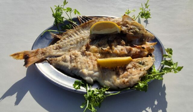 Ich fahre eine Kennen-Lern-Runde mit dem Rad. Es hat hier eine schöne Bucht wo Kite-Surfer den starken Wind genießen. Dann radle ich zurück zum Stellplatz. Angrenzend hat es Fischbuden und gleich redet mich einer an. Er bietet mir eine Portion um € 15 an – doppelt so teuer als üblich. Als ich ablehne würde er runter gehen. Es wird leider immer wieder versucht, Neuankömmlinge preislich über den Tisch zu ziehen. Ich gehe zum Nachbarn welcher mir gleich den üblichen Preis zu € 7 anbietet. Hier esse gut ich und genieße die Abendsonne.