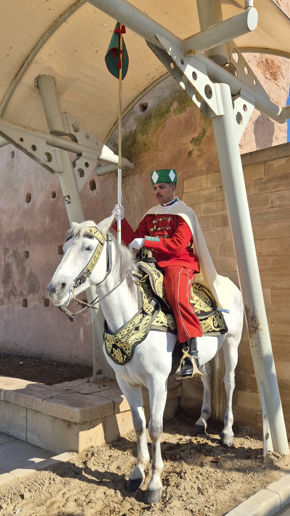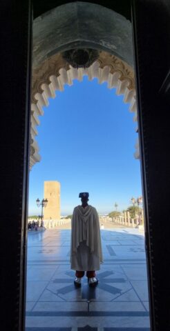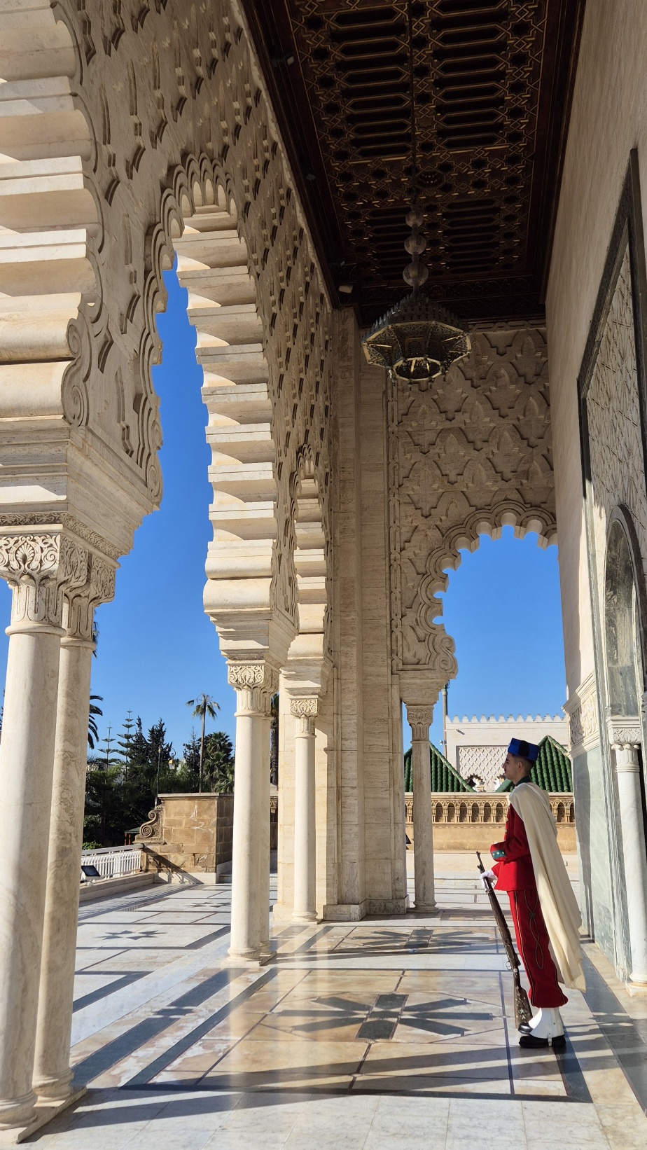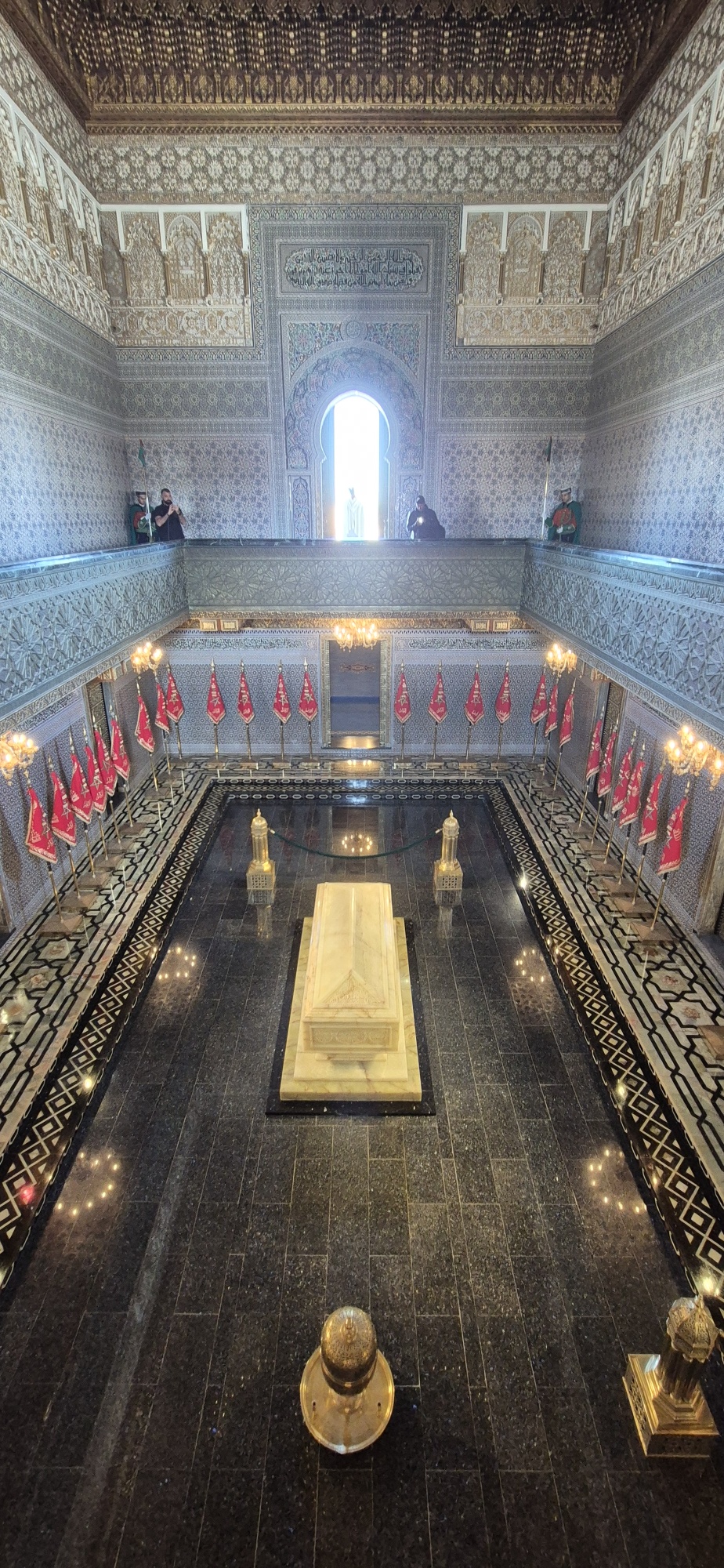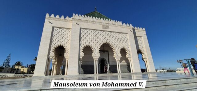 Um 08:30 Uhr fahre ich los und bin um 9h auf einem gratis Parkplatz in der Nähe des Mausoleums in Rabat. Es ist schon herrlich warm, da genügen die kurzen Hosen und ein T-Shirt. Nach ein paar Minuten bin ich oben beim Mausoleum, von wo man auch einen schönen Rundblick hat. Hier liegt König Mohammed V, der Vater des jetzt regierenden Königs, begraben. Bei den 4 Eingängen steht jeweils eine Wache, auch drinnen in den Ecken wiederum je ein Wächter. Sehr beeindruckend und pompös.