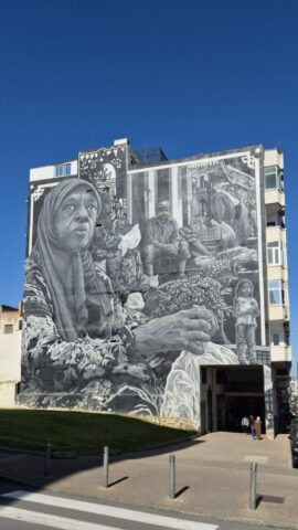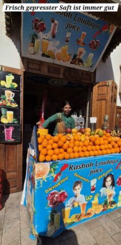 Von dort gehe ich weiter durch die Stadt, vorbei an einem großen Graffiti Kunstwerk. Bald schon bin ich beim Andalusischen Garten – leider ist ausgerechnet heute geschlossen. Angrenzend ist die Kasbah des Oudayas, eine schöne Festung. Zur Stärkung kaufe ich mir ich einen frisch gepressten Orangensaft, mache da und dort einige Fotos, genieße den Ausblick und dann spaziere ich wieder durch den Souk zurück zum Womo.