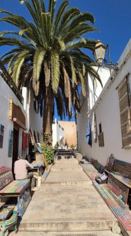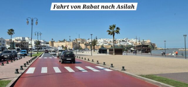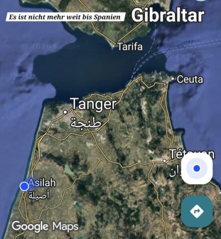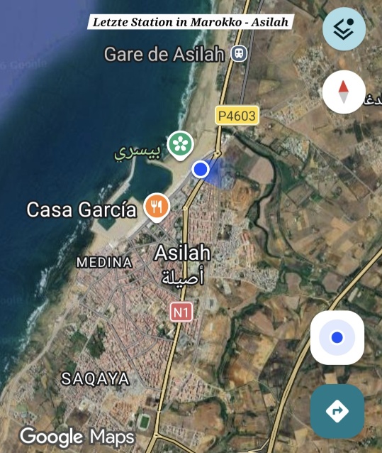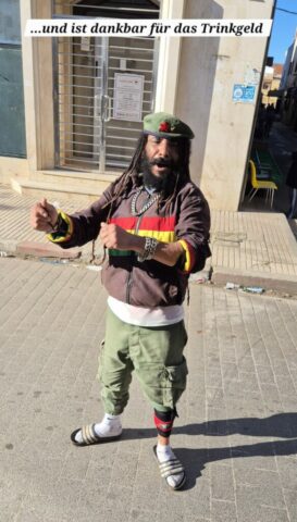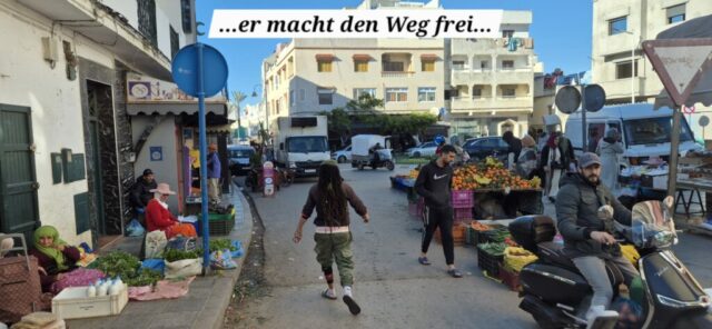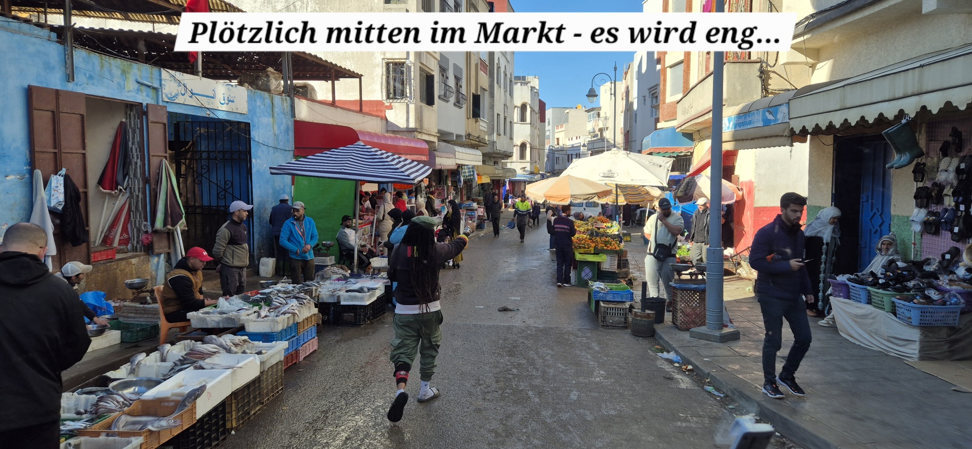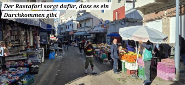Als ich Asilah erreiche, lotst mich Goggle Maps den kürzesten Weg – mitten in eine enge Straße wo Markt ist. Rückwärts rausfahren wäre nicht einfach gewesen. Da winkt mir ein Rastafari, läuft voraus, räumt Kisten und Sonnenschirme auf die Seite, redet mit Standbetreibern und so komme ich mit seiner Hilfe gut durch die Engstellen des ganzen Markts! Dies war wirklich sehr hilfreich und er freut sich sehr über das Trinkgeld, welches seinen Einsatz mehr als Wert war.