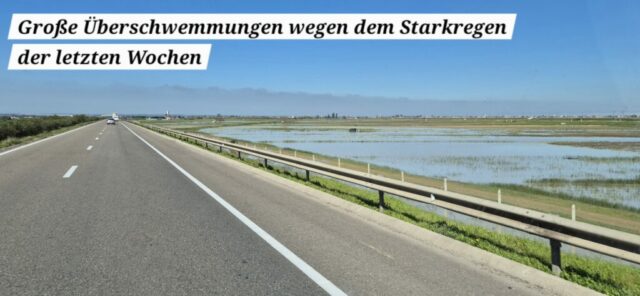 Links und rechts der Straße sieht man großflächige Überschwemmungen der überdurchschnittlichen Regenfälle der letzten Wochen.