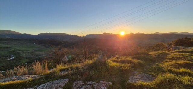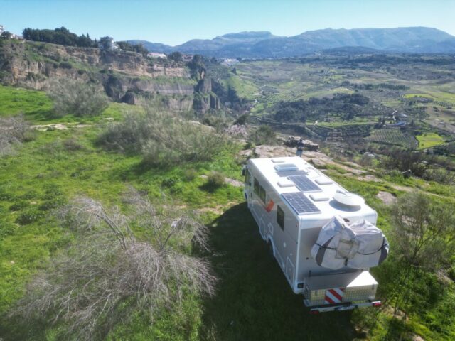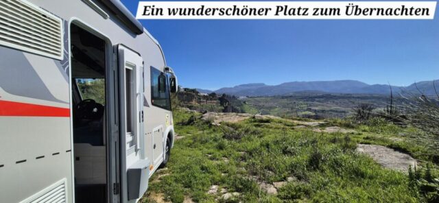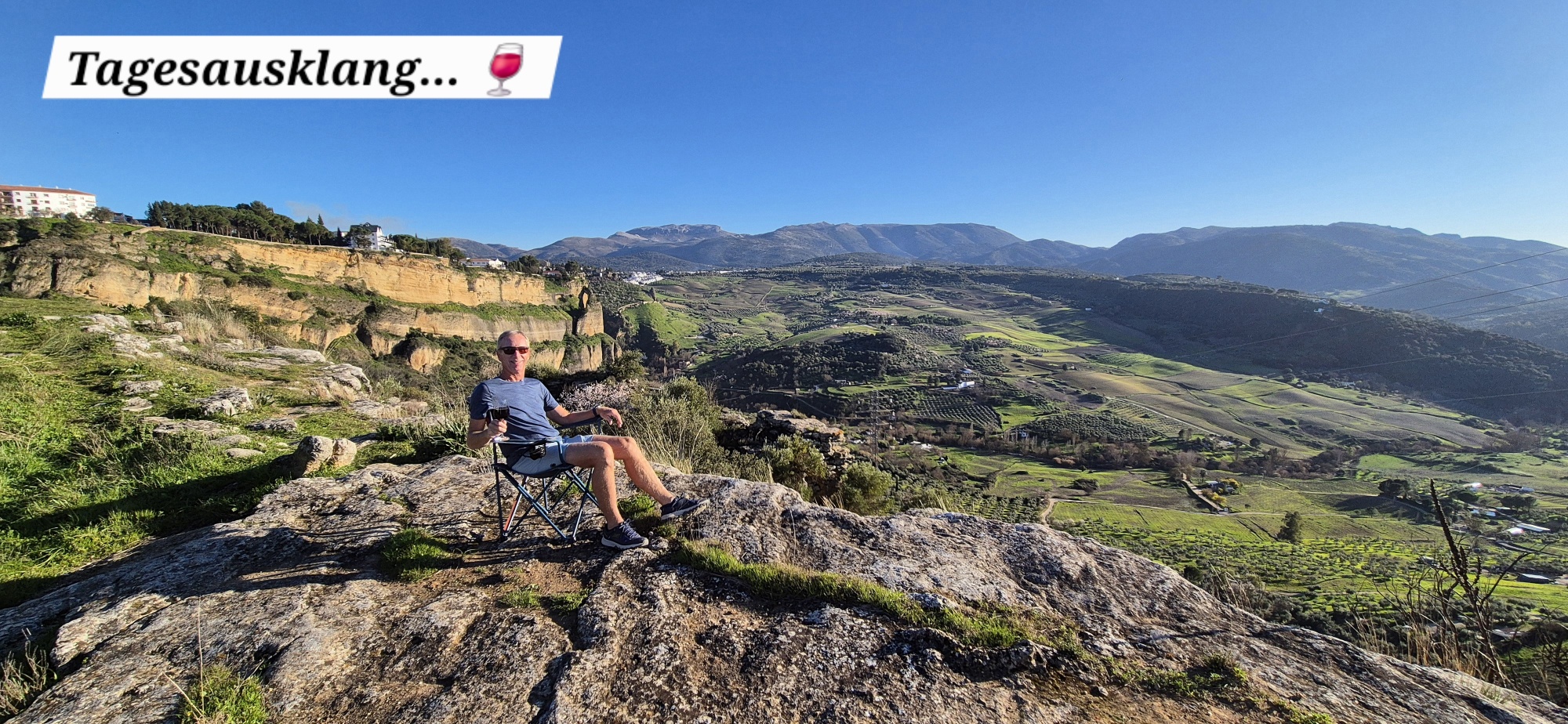 Ich verlade das Rad und fahre nach Ronda. Zum 5. Mal bin ich nun dort, vor 2 Jahren zum letzen Mal. Damals habe ich einen schönen Stellplatz an einer Klippe entdeckt. Nix wie hin, keiner da – wunderbar. Kaum habe ich mich eingerichtet kommt auch ein Franzose, welcher zuvor auf einem Parkplatz weiter oben gestanden ist, hierher. Er läßt einen guten Abstand, heute mal kein „Kuschelcamping“.