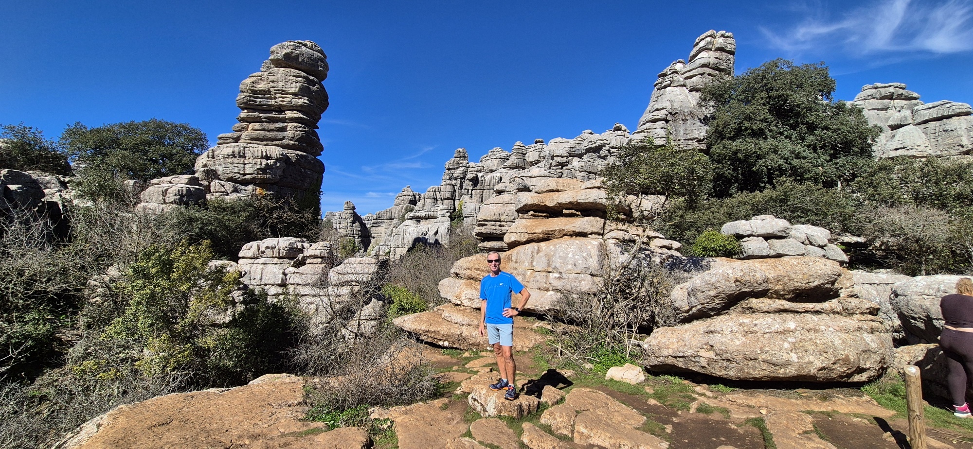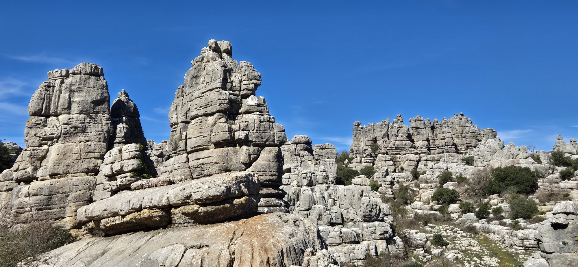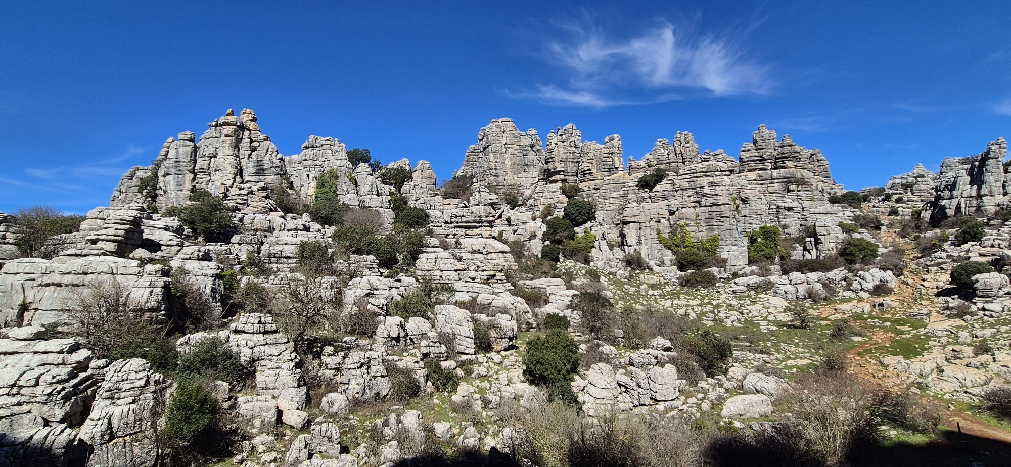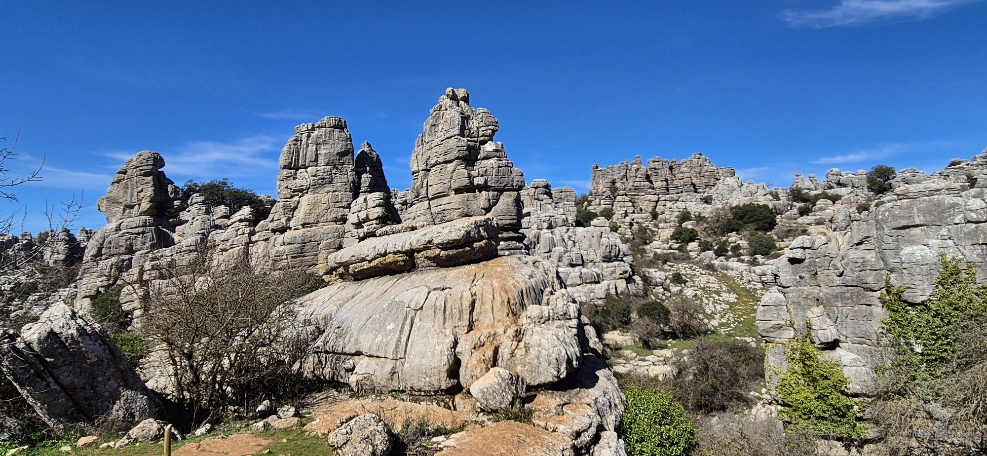 Am Besucherzentrum vorbei steige ich auf einen Felsrücken hoch. Von hier habe ich eine tolle Sicht bis Malaga, welches ca. 50 Kilometer entfernt ist. Dann gehe ich nochmals zu den schon am Samstag besuchten beeindruckendsten Felsformationen, wo ich mich tagelang aufhalten könnte. Nach jeder Windung eröffnen sich neue Blickwinkel. Auch ist es heute mit wenigen Besuchern sehr angenehm.