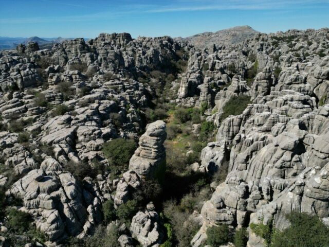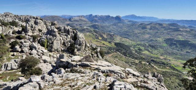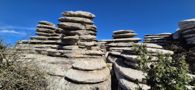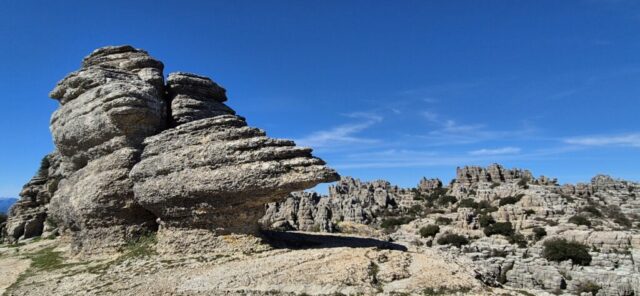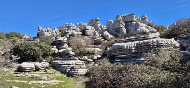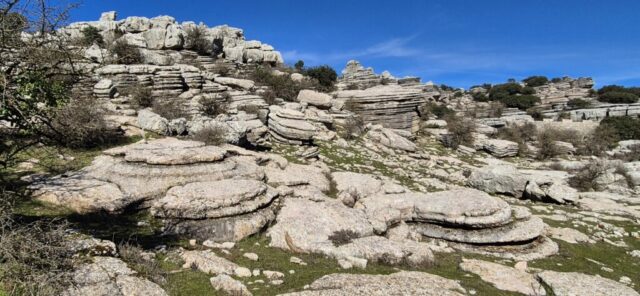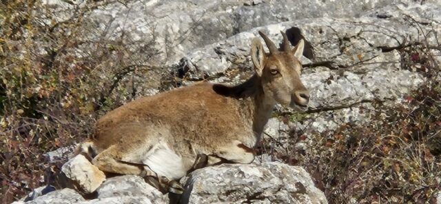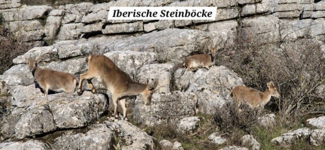Heute mache ich mich nochmals auf nach El Torcal. Ich parke am unteren Parkplatz und gehe eine ausgewiesene Route durchs Gelände hinauf Richtung Besucherzentrum. Am Anfang sind keine besonderen Felsformationen zu sehen, aber um so höher ich komme, umso interessanter wird es. Ich bin allein auf dieser Strecke, die Meisten fahren mit ihrem Fahrzeug bis zum Besucherparkplatz. Ein paar Schafe queren den Weg und plötzlich entdecke ich im Gebüsch Iberische Steinböcke. Ich gehe langsam und möglichst leise weiter und – was für ein toller Anblick – sehe ich ist ein ganzes Rudel. Wunderschön, diese wild lebenden Tiere aus nächster Nähe beobachten zu können. In Zeitlupe komme ich näher an sie heran, es trennen uns maximal 20 Meter. Ganz fantastisch und die Belohnung dafür, eine weniger interessante und kaum frequentierte Route zu gehen.
