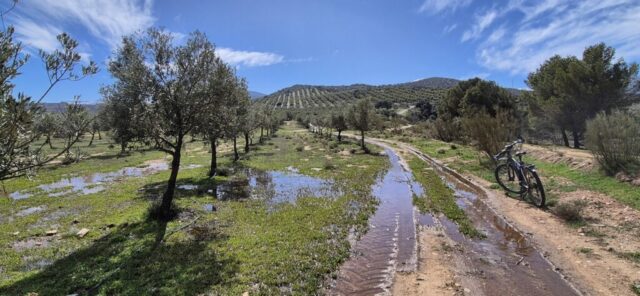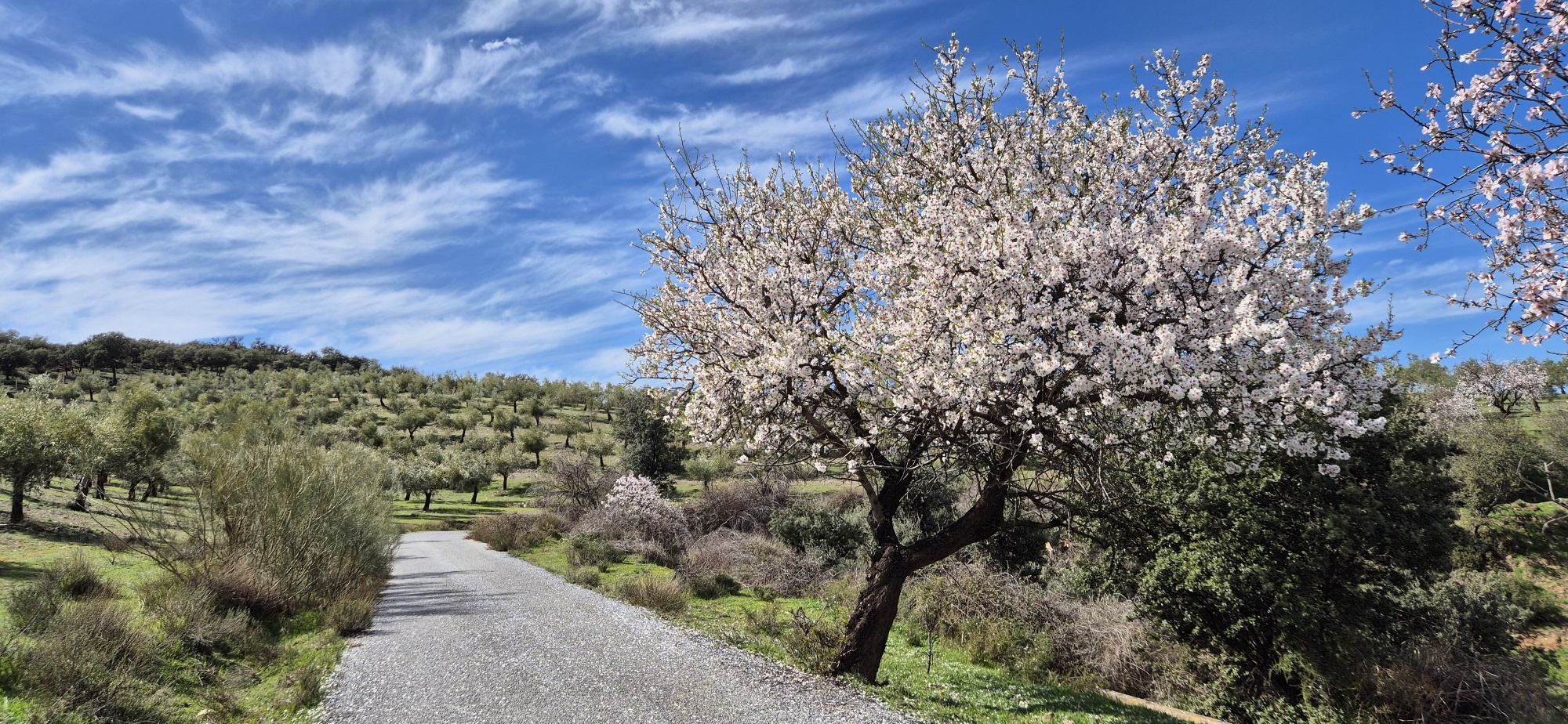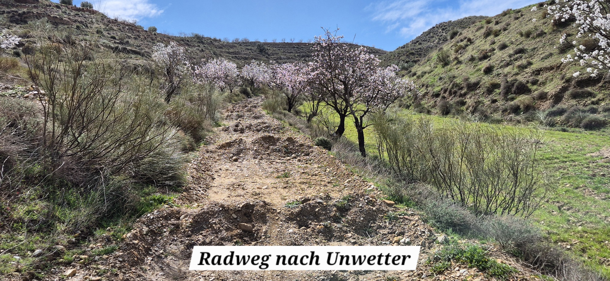 Entlang der Felskante radle ich weiter und denke mir, dass ich heute eine bessere Wahl getroffen habe. Kurz darauf – ja genau – ist die MTB Strecke wieder völlig ausgewaschen und schaut aus wie ein Flussbett. Also wieder – bergauf schieben, bin’s ja schon gewohnt. Aber diesmal ist ein Ende der Schinderei schneller absehbar und dann geht es wieder durch fast endlose Olivenplantagen, dazwischen immer wieder blühende Mandelbäume.