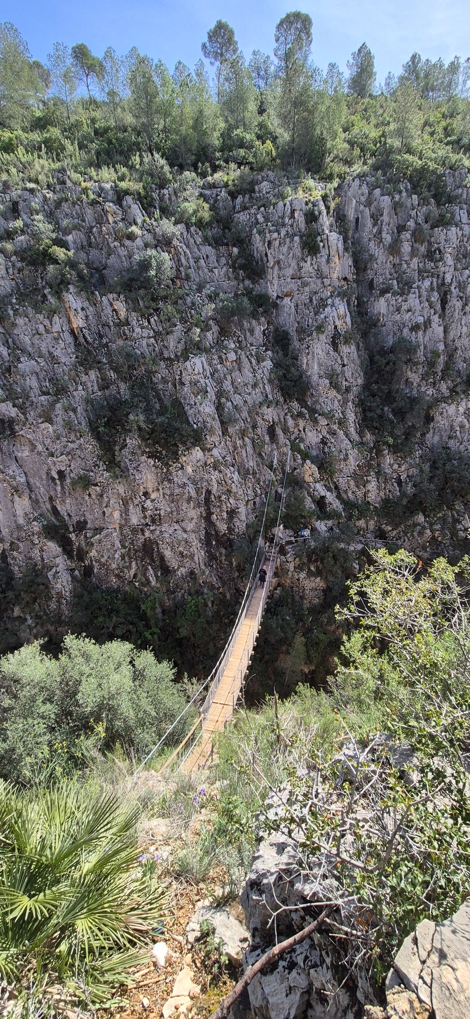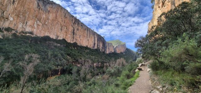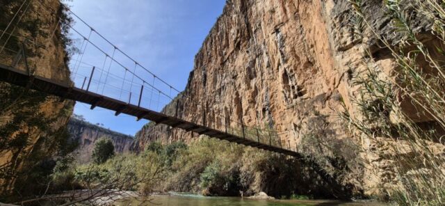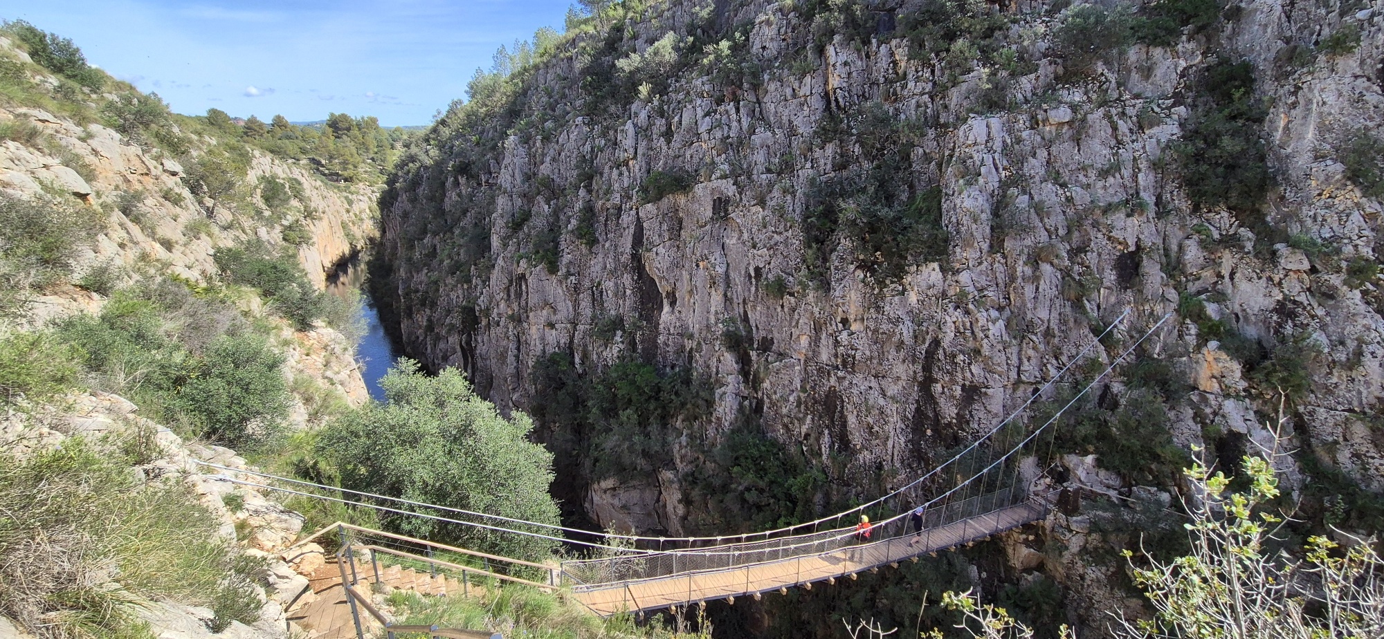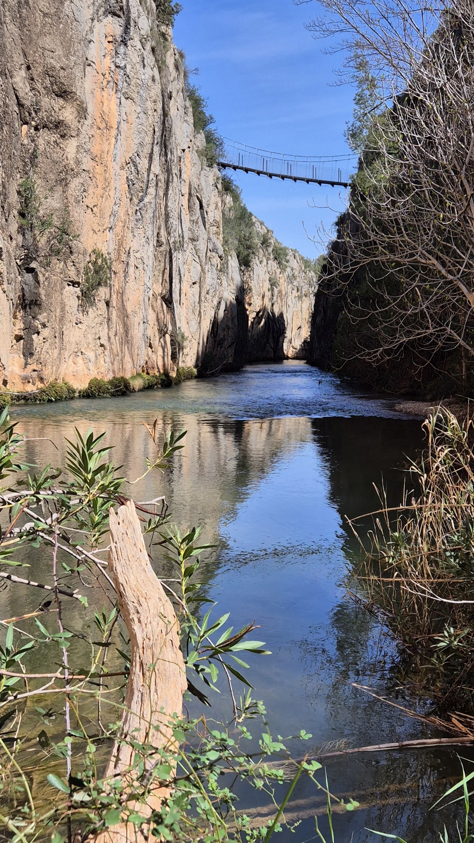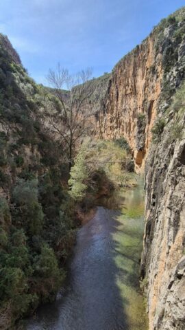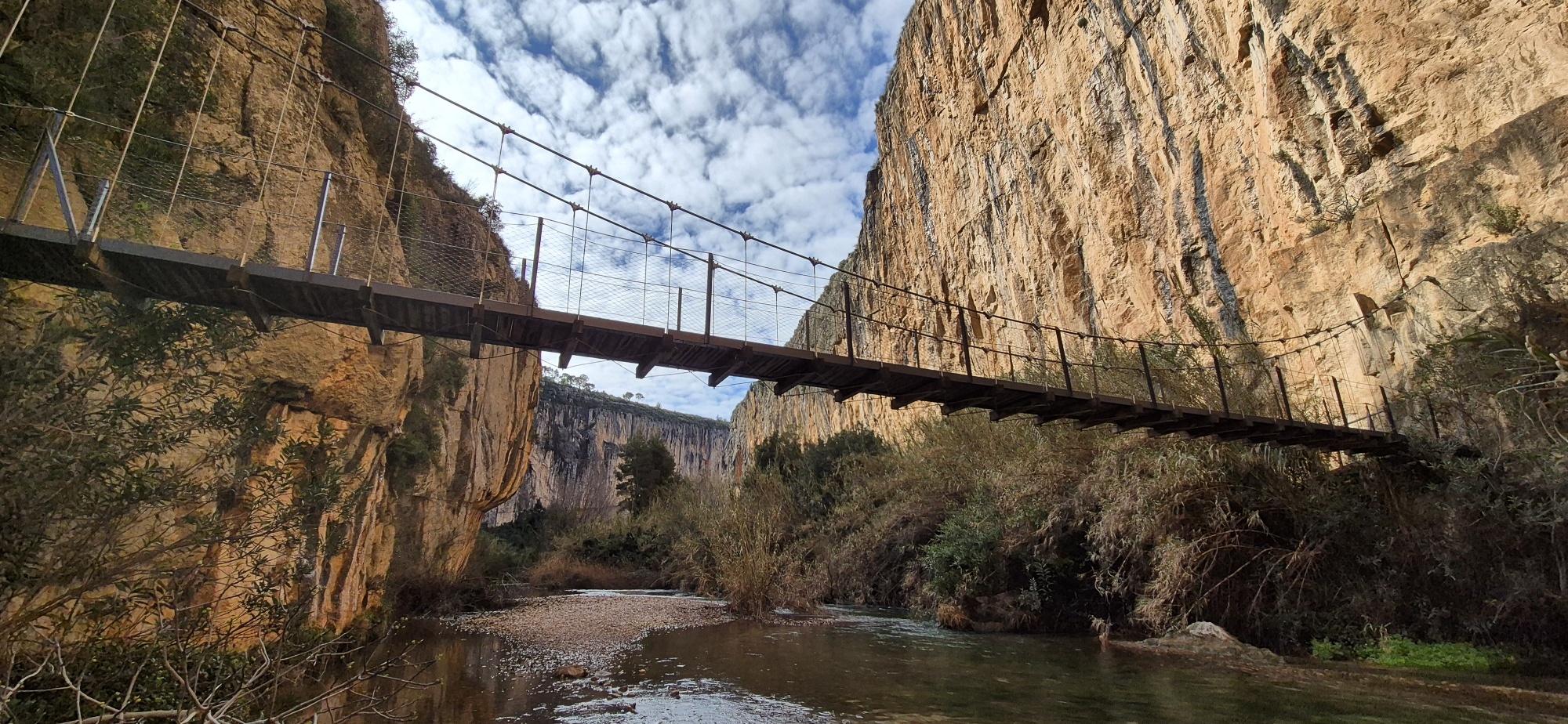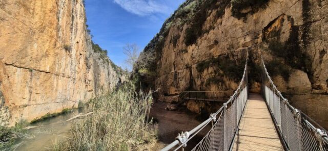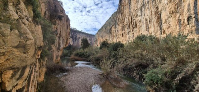 Die Route Los Pantaneros führt durch eine wunderschöne Schlucht mit 2 Hängebrücken und immer wieder faszinierenden Felswänden. Ein Bach plätschert durch den Canyon und der Pfad ist naturbelassen. Am Ende der Schlucht wollte ich zuerst weiter um einen Berg herum zum Startpunkt gehen. Aber die Strecke ist so schön, sodass ich dieselbe Route wieder zurück gehe. Die Sonne steht jetzt schon höher und leuchtet die Felsen schon besser aus. Ich mache (zu) viele Fotos und gehe zurück zum Ausgangspunkt. Von dort spaziere ich noch ins Dorf und schaue mich ein wenig um. Das Wetter ist zwischenzeitlich sogar besser als vorhergesagt und es ist sehr warm geworden.