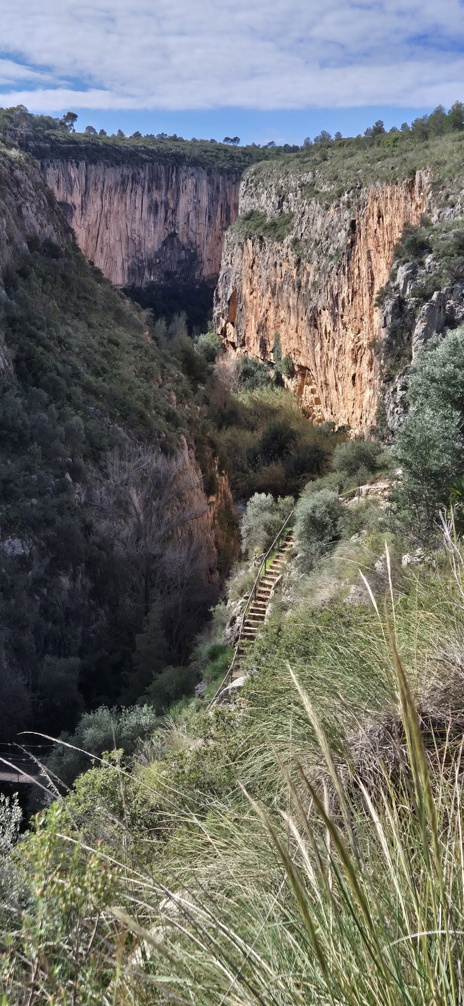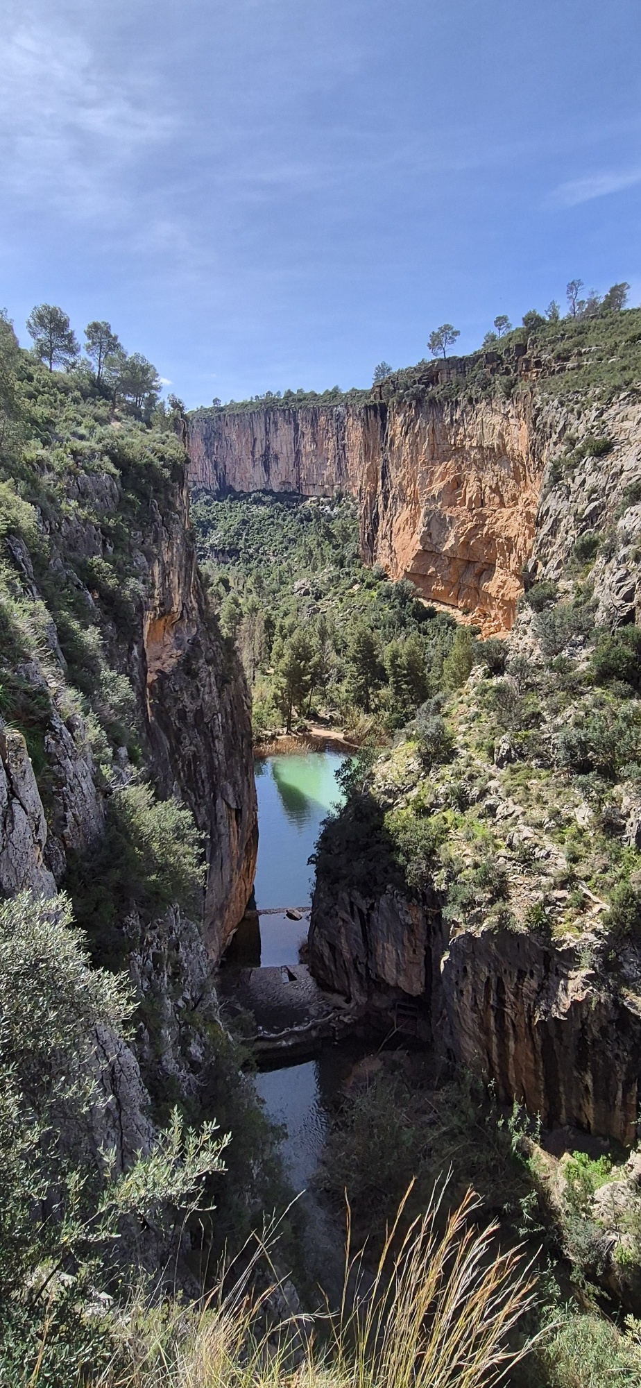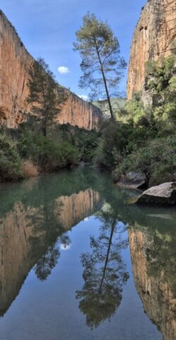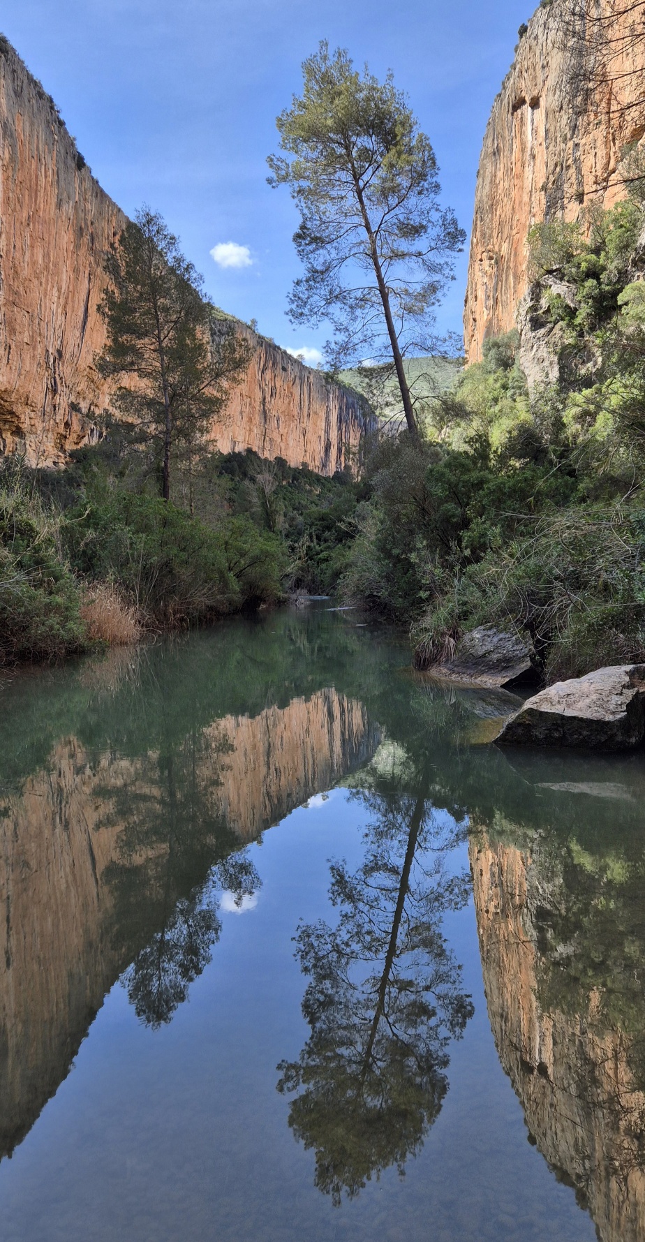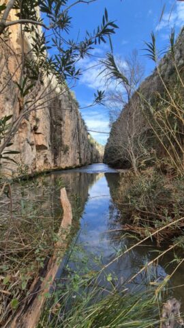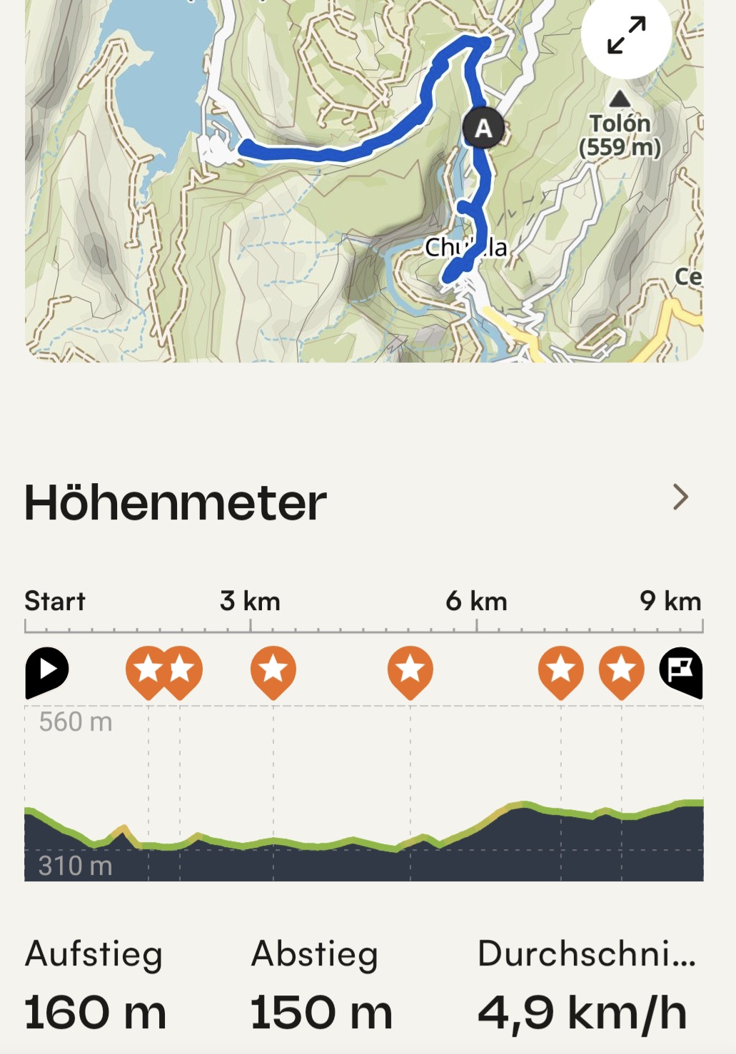 Die Route Los Pantaneros führt durch eine wunderschöne Schlucht mit 2 Hängebrücken und immer wieder faszinierenden Felswänden. Ein Bach plätschert durch den Canyon und der Pfad ist naturbelassen. Am Ende der Schlucht wollte ich zuerst weiter um einen Berg herum zum Startpunkt gehen. Aber die Strecke ist so schön, sodass ich dieselbe Route wieder zurück gehe. Die Sonne steht jetzt schon höher und leuchtet die Felsen schon besser aus. Ich mache (zu) viele Fotos und gehe zurück zum Ausgangspunkt. Von dort spaziere ich noch ins Dorf und schaue mich ein wenig um. Das Wetter ist zwischenzeitlich sogar besser als vorhergesagt und es ist sehr warm geworden.