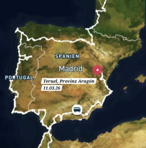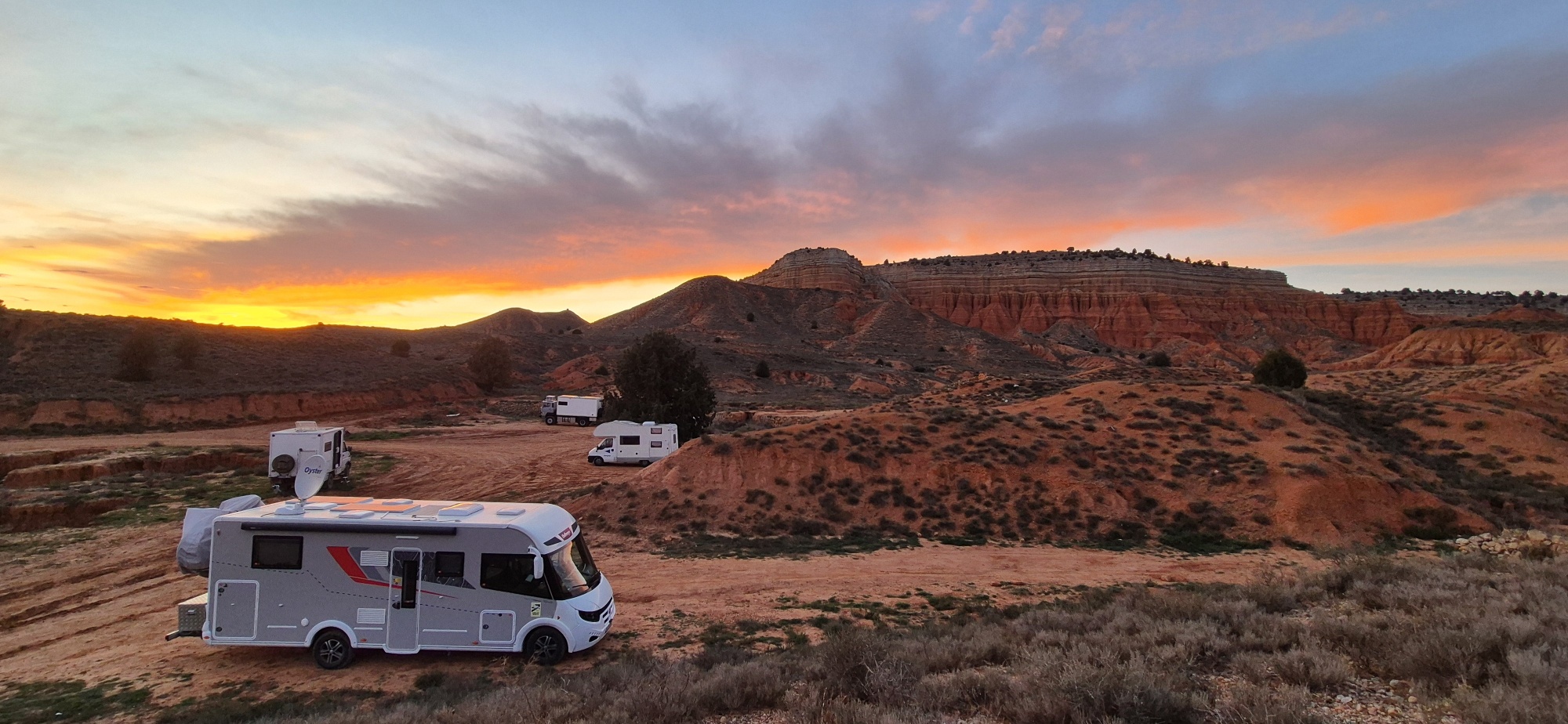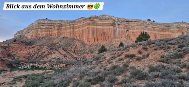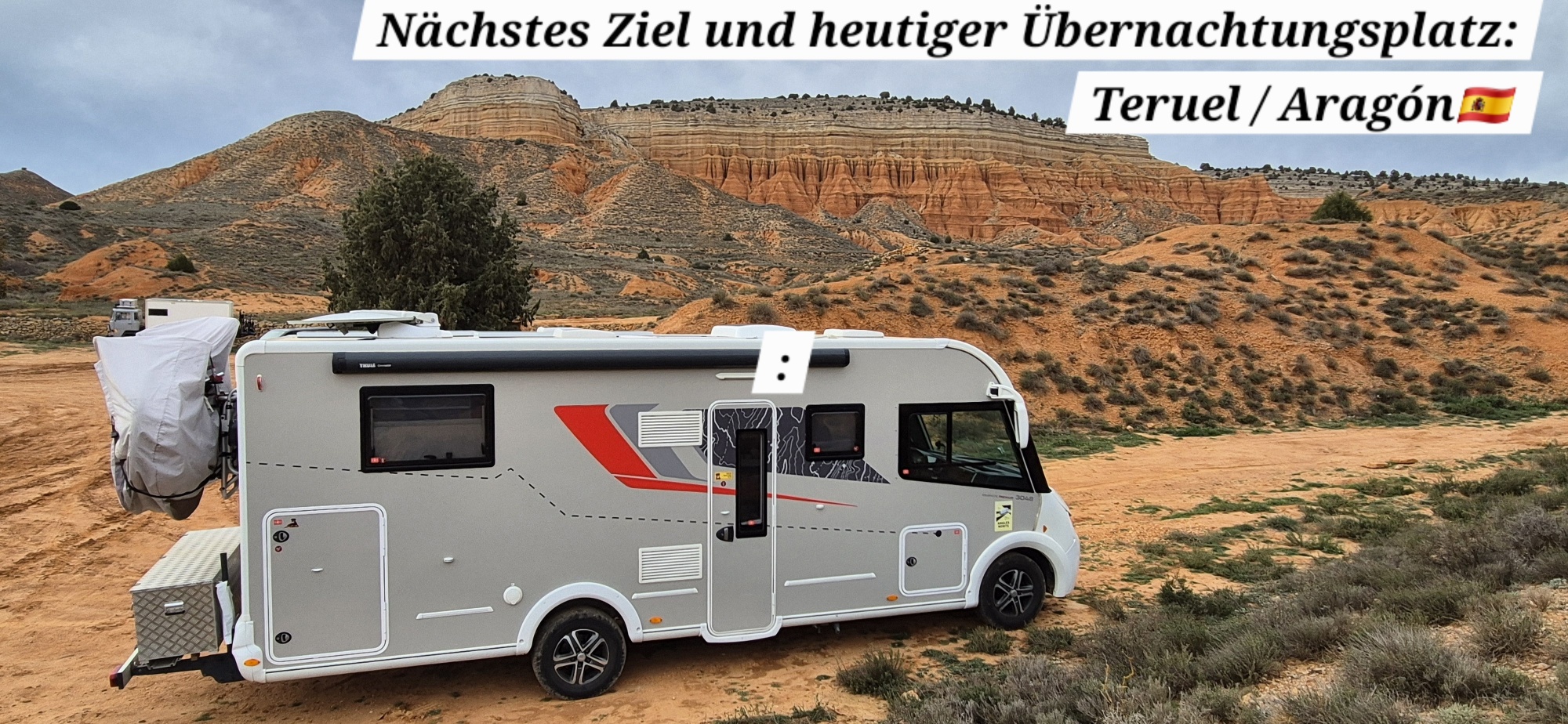Zurück beim Womo fahre ich weiter nach Teruel, in die Provinz Aragonien. Es sind 129 Kilometer und Google Maps meint es wieder gut mit mir und schickt mich die kürzeste Strecke über schmale Straßen durch eine interessante Landschaft. Teile sind einem Waldbrand zum Opfer gefallen, dann wieder ausgedehnte Oliven- und Mandelplantagen. Dann fahre ich ein gutes Stück auf der Autostraße bis Teruel, wo ich noch kurz Brot und ein paar Lebensmittel einkaufe. Jetzt sind es nur noch ein paar Kilometer und ich navigiere über eine sehr holprige Piste zum heutigen Übernachtungsplatz, ganz in der Nähe des „El Canon Rojo de Teruel“, dem roten Canyon von Teruel bzw. dem aragonesischen Grand Canyon. Es stehen 8 weitere Camper hier und die Sonne verabschiedet sich wunderschön.