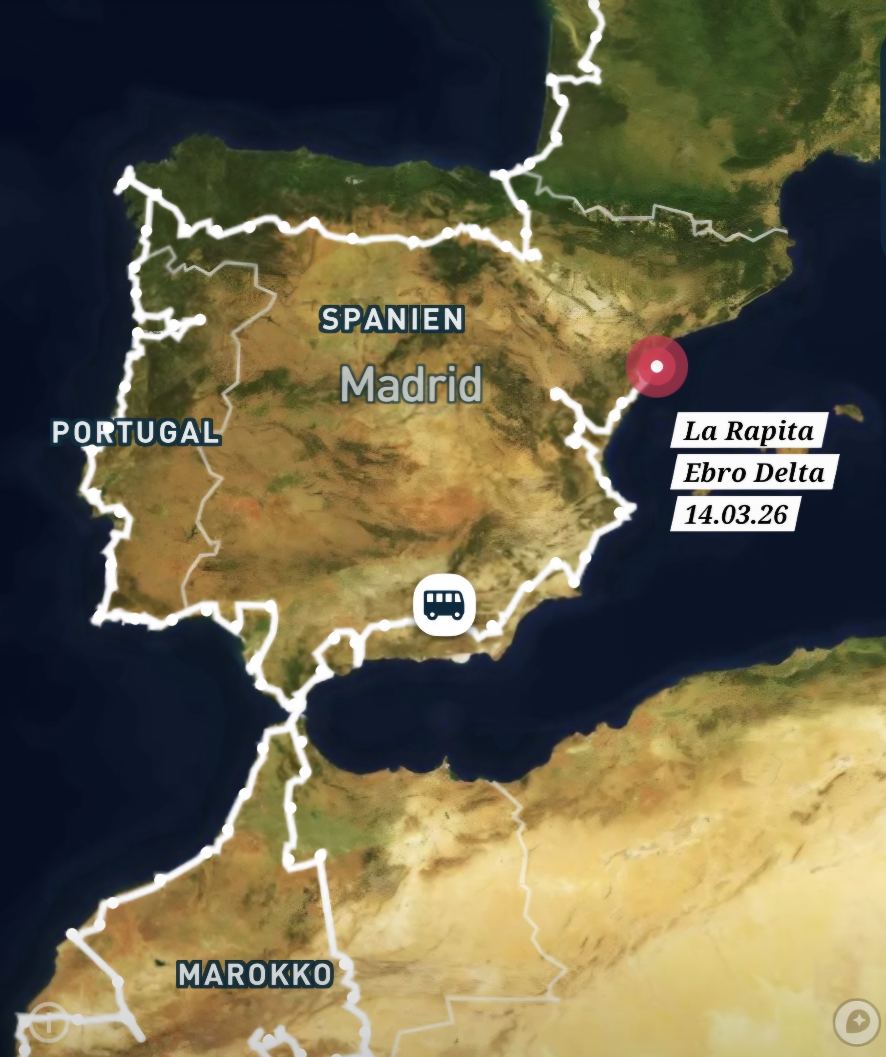 Ich esse Spätzle, welche OK aber nichts besonderes sind. Die Chef Kellnerin ist dermaßen unfreundlich, dass ich hier nicht bleibe möchte und fahre weiter nach La Rapita im Naturschutzgebiet Ebro Delta, wo es noch einige freie Plätze hat und ich übernachten werde.