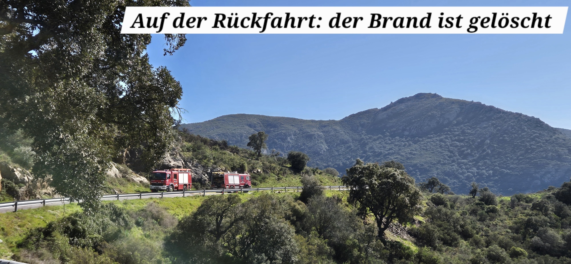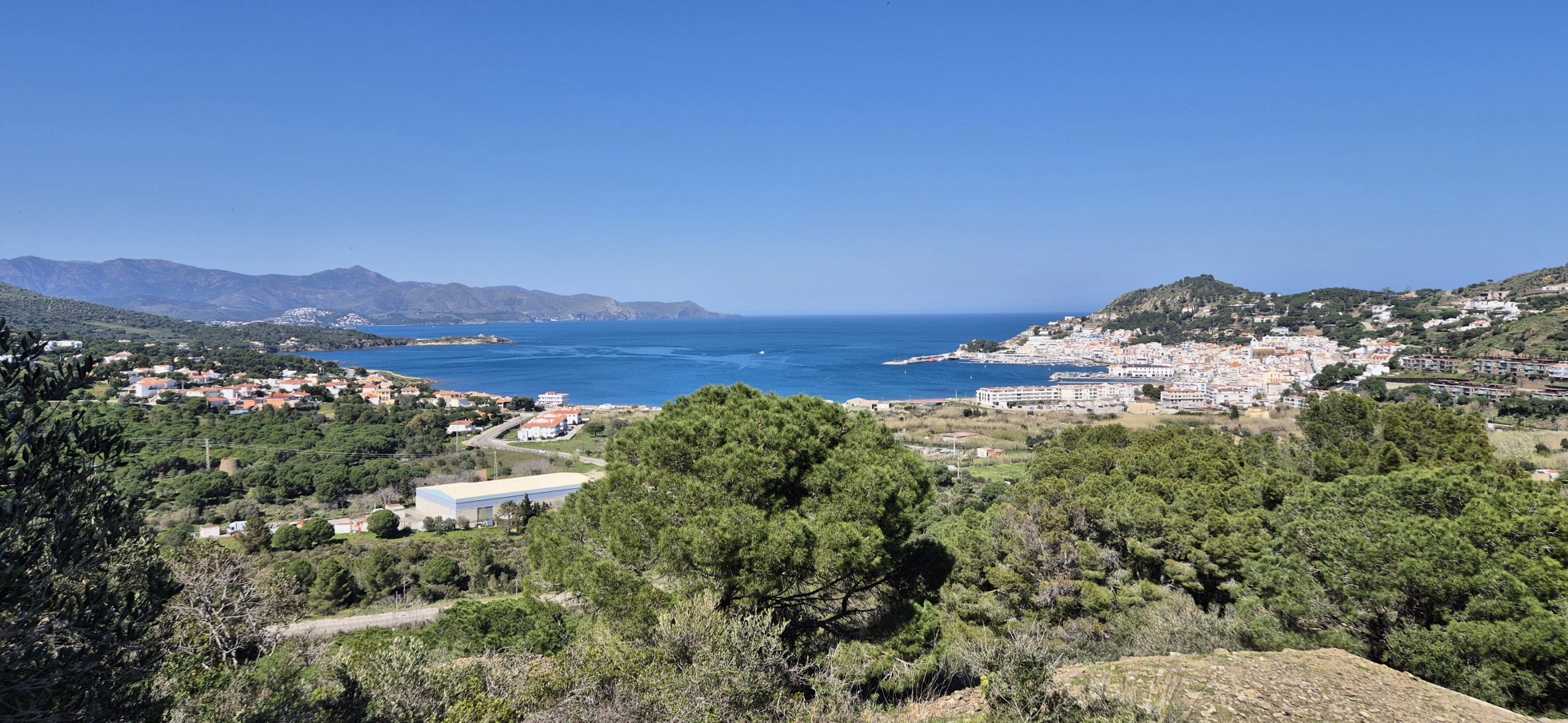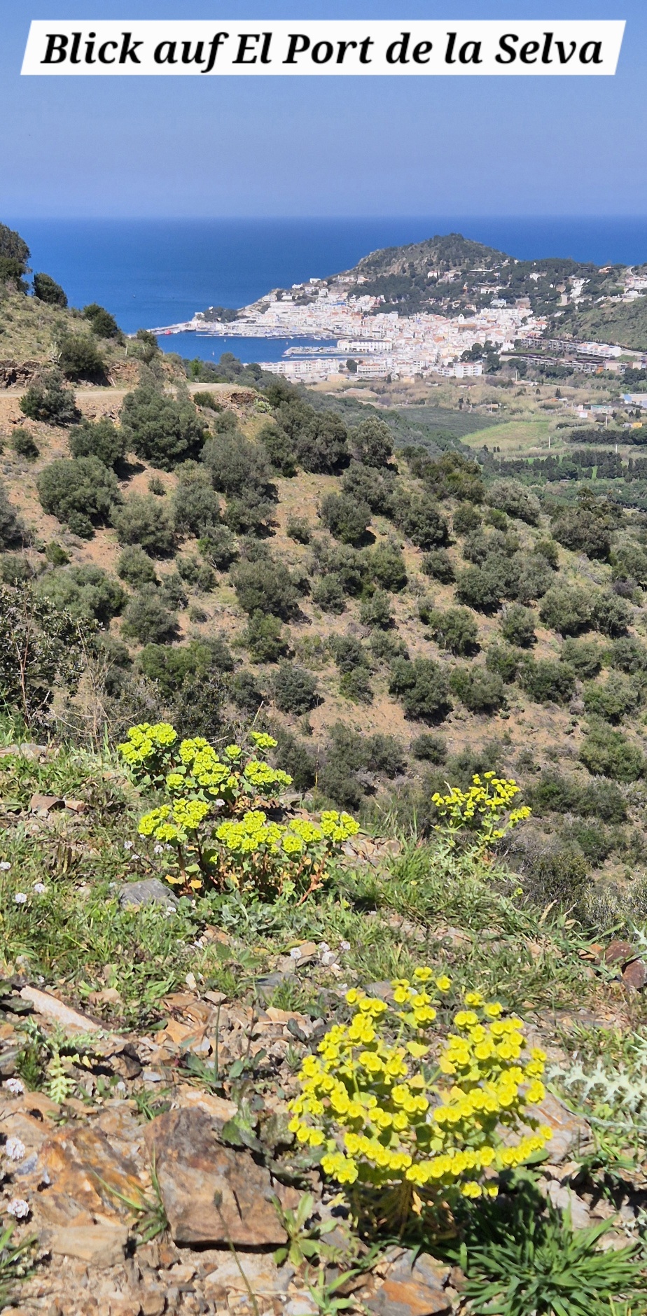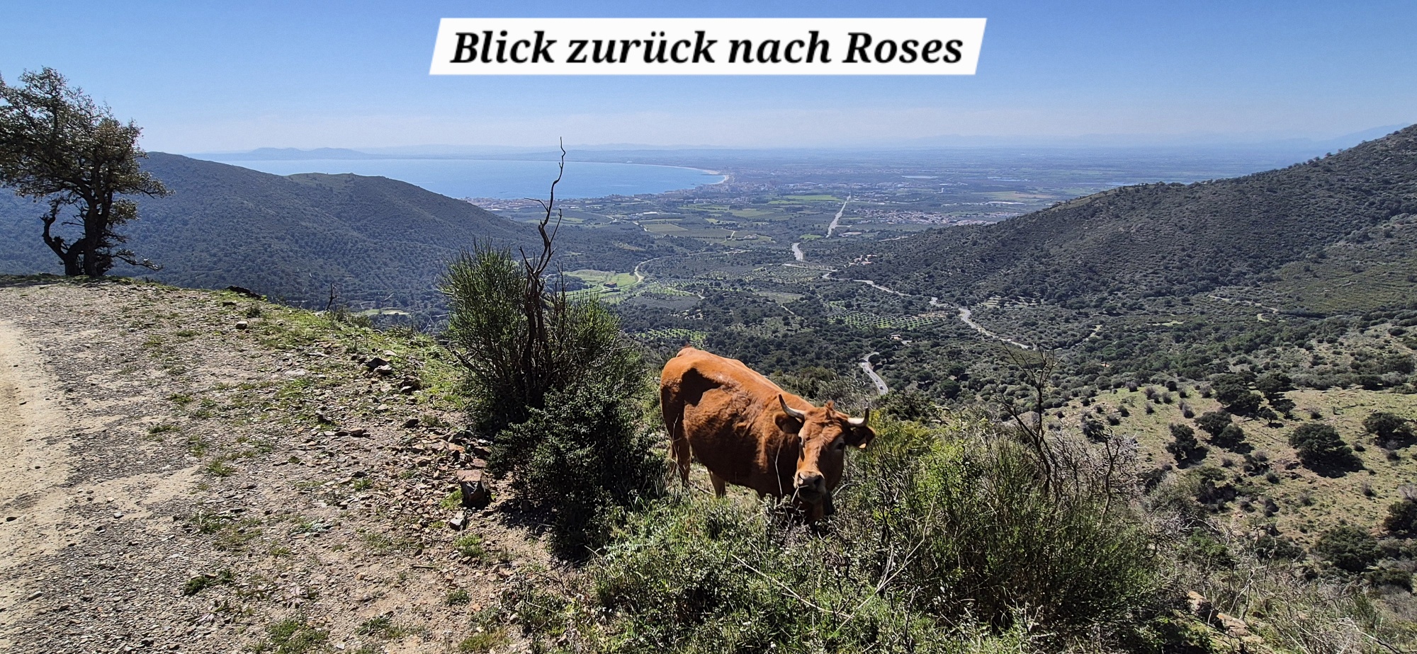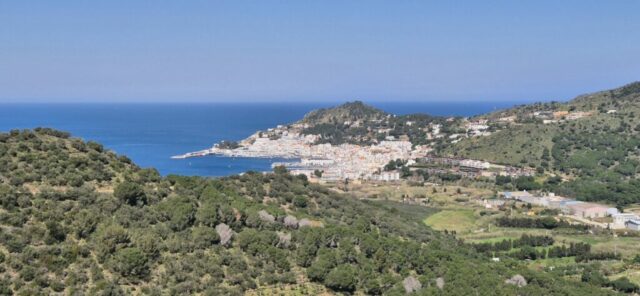 Um die Mittagszeit starte ich nochmals eine Bike-Tour, wahrscheinlich die letzte auf dieser Reise. Von Roses fahre ich über Single-Trails und teils holprige Güterwege durch den Nationalpark Cap de Creus. In der Ferne sehe ich einen Waldbrand – die Feuerwehr ist schon im Einsatz. Meine Route zweigt aber schon davor ab, sodass ich nicht durch den Rauch fahren muss. Auf der Passhöhe sehe ich hinunter auf mein Tagesziel „El Port de la Selva“, einem Fischerort wo der Tourismus auch langsam ankommt, es aber noch relativ ruhig und beschaulich zugeht.