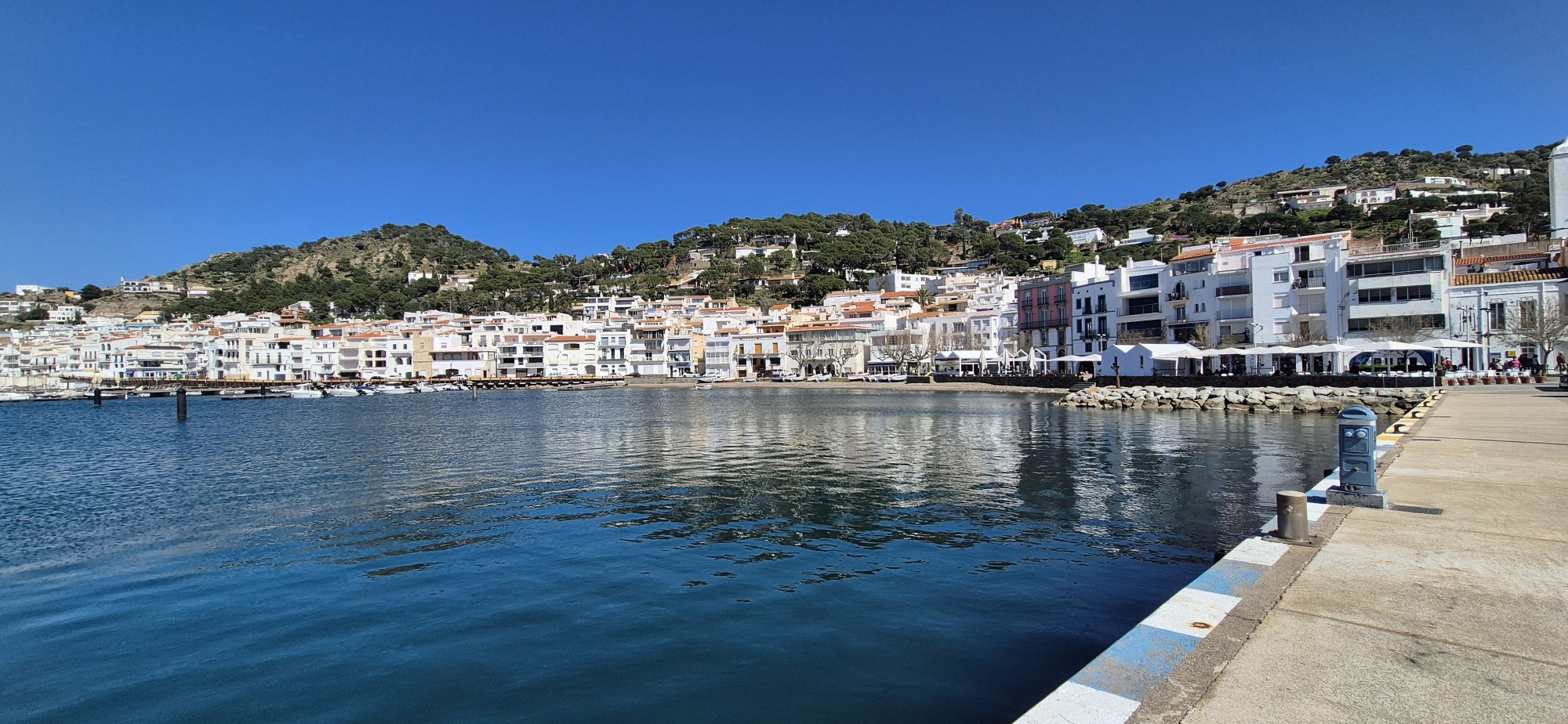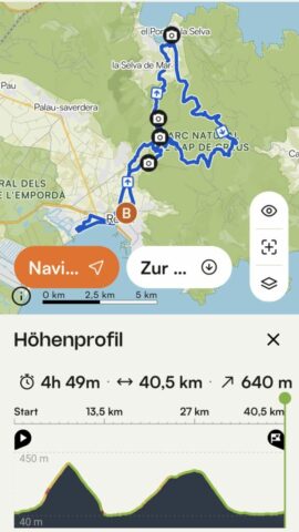 Nach einer Pause im Hafen trete auf der Asphaltstraße, wo kaum Verkehr ist, hoch bis zum Pass wo ich schon gestern war und genieße dann wieder die lange und flotte Abfahrt zurück nach Roses. Es war wieder eine schöne Runde, insgesamt 40 Kilometer und 640 Höhenmeter.