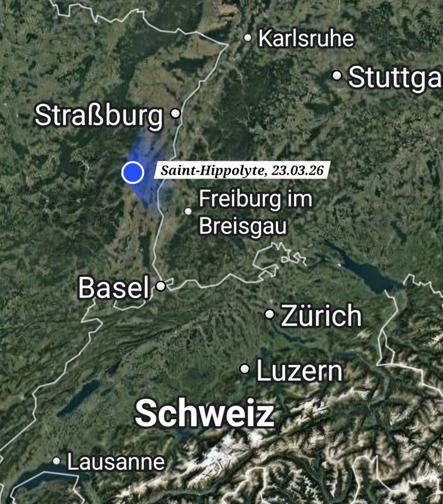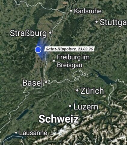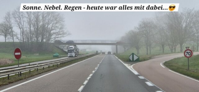 Um ca. 8.30 Uhr fahre ich Richtung Elsass los. Ich vermeide mautpflichtige Autobahnen um die von Vielen bevorzugte Variante über Land selber testen zu können. Natürlich braucht man länger als über die Autobahn, aber man bekommt auch mehr von der Landschaft mit. Auf dieser Strecke sind sehr viele Wohnmobile Richtung Süden unterwegs. Durchwegs sind die Straßen gut, aber überall sind Radarboxen und es ist wichtig, penibel genau die erlaubte Höchstgeschwindigkeit einzuhalten, denn die Strafen sind seeeehr hoch…. Diese Erfahrung habe ich schon im September 2025 gemacht.