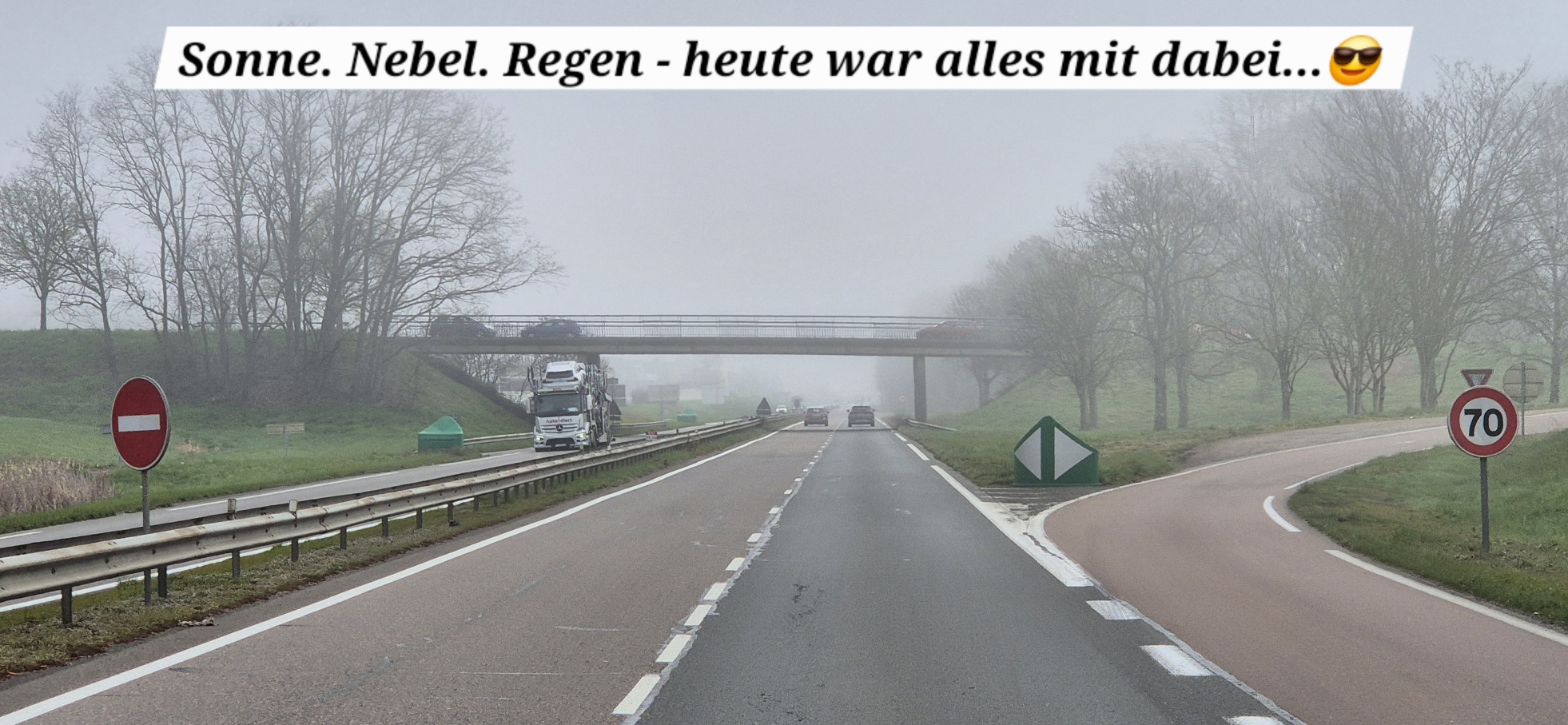 Wetter: zuerst sonnig, dann Nebel und Regen, am späteren Nachmittag wieder sonnig.