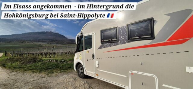 Am späteren Nachmittag komme ich wohlbehalten im Elsass an und steuere einen Stellplatz mitten in den Weinbergen an, welchen ich genau vor 1 Jahr hier entdeckt habe. Dieser ist knapp oberhalb der Ortschaft Saint-Hippolyte mit einem schönen Blick auf die „Hohkönigsburg“, welche ich letztes Jahr besichtigt habe. Ein toller, ruhiger Platz an dem schon 4 weitere Camper stehen. Ich belege den letzten freien Platz direkt neben Weinreben, mache noch ein bisschen sauber und lasse den erfolgreichen Tag ausklingen.